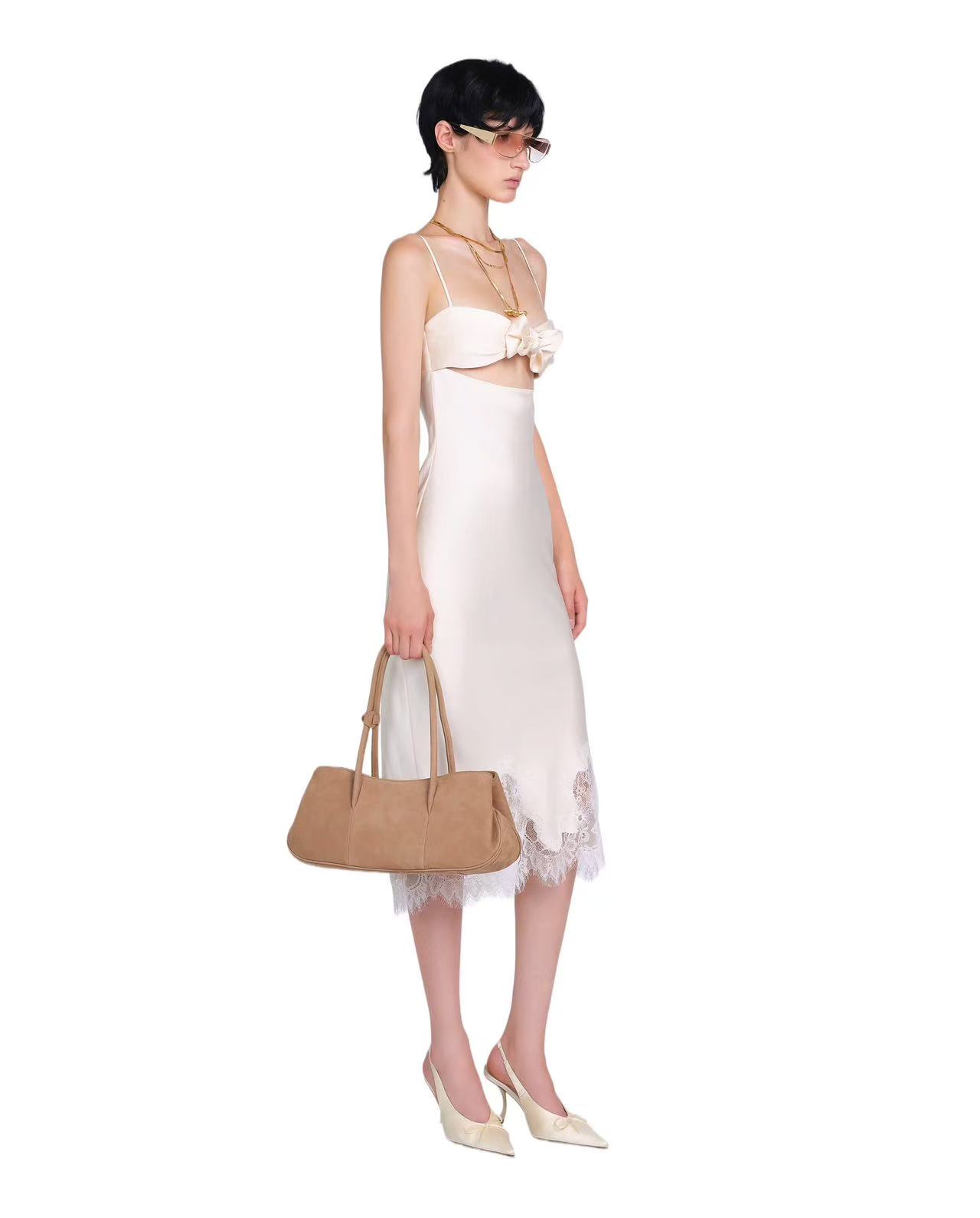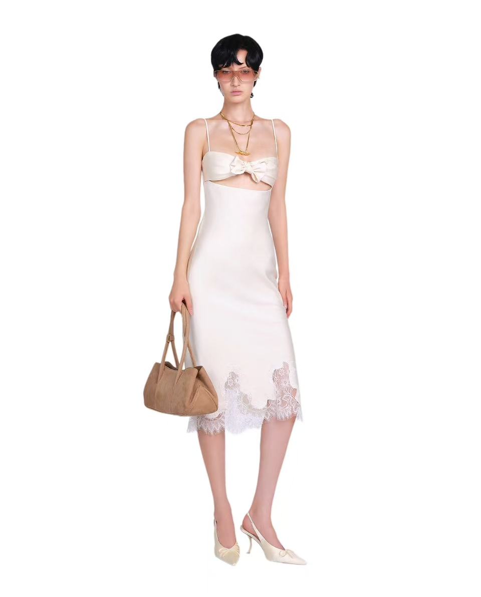 나비 매듭 홀로우 아웃 레이스 밑단 하이웨이스트 쌀 화이트 새틴 슬립 드레스