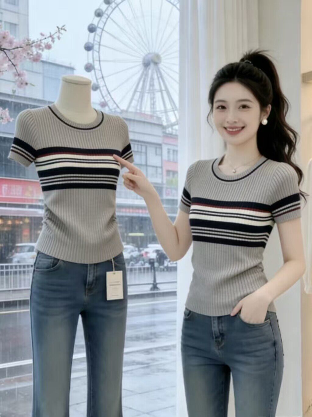 2026 여름 새로운 라운드 넥 배색 스트라이프 패션 반팔 티셔츠 여성 한 부서 작은 대중 디자인 센스 니트 맨위