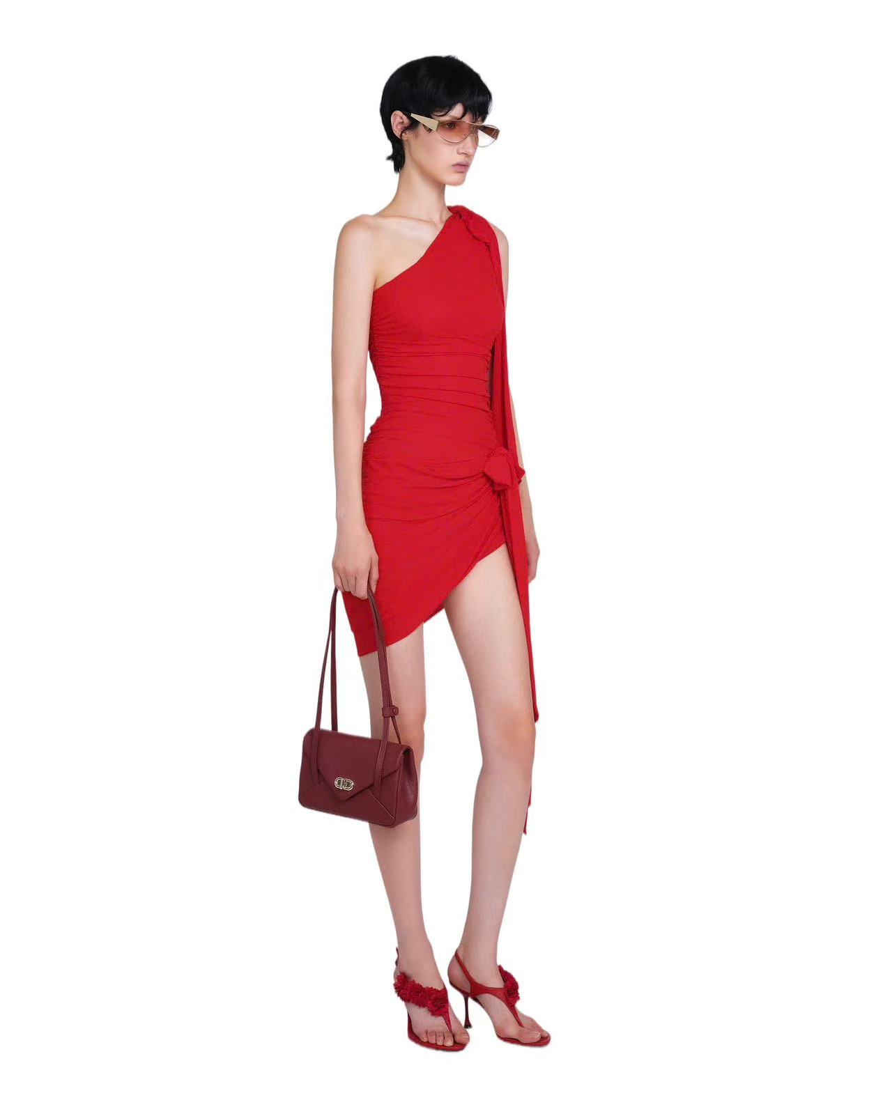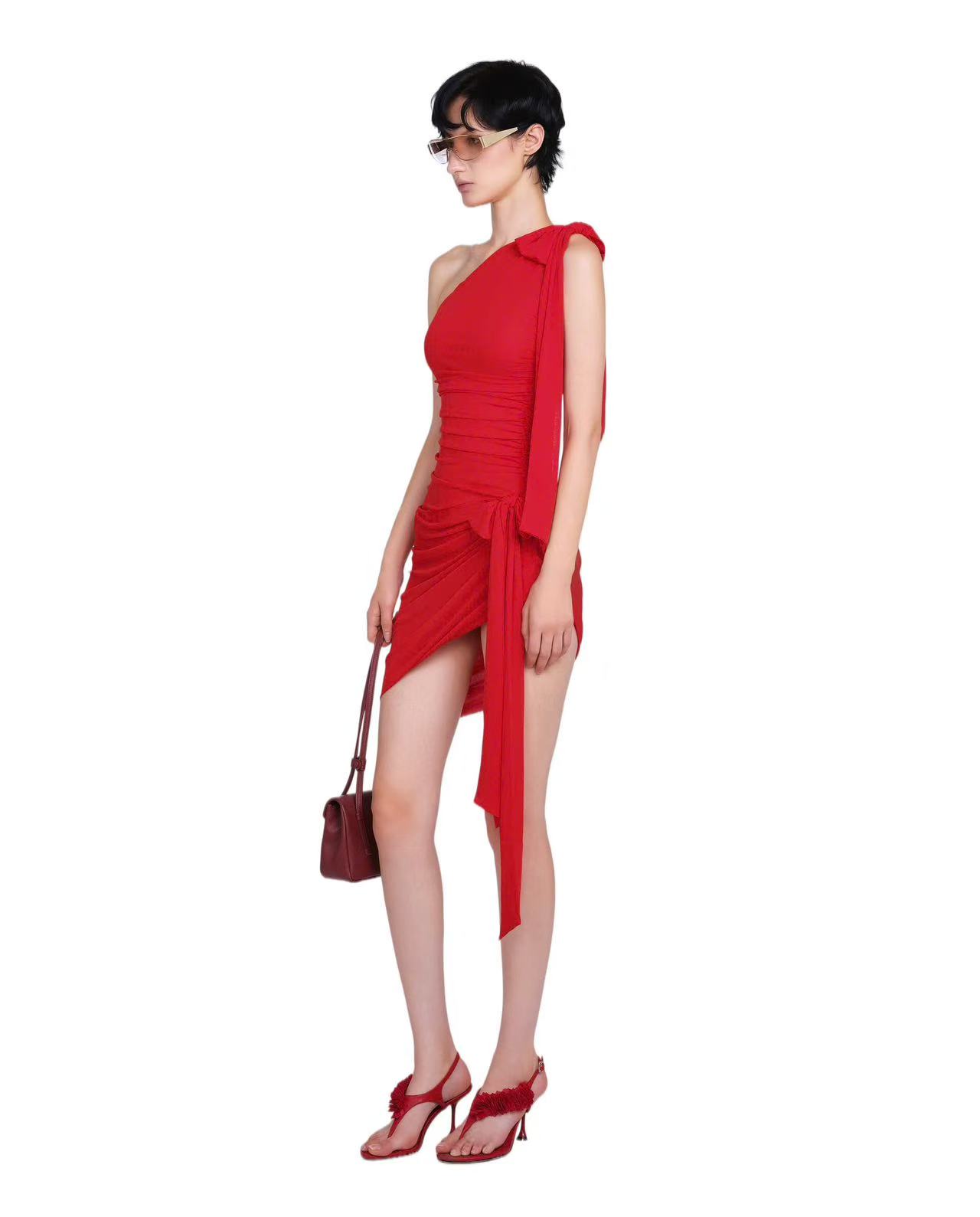 뜨거운 빨간 장미 빨간색 비스듬한 어깨 주름 심지어 리본 트임 디자인 순수한 욕망 미니 스커트