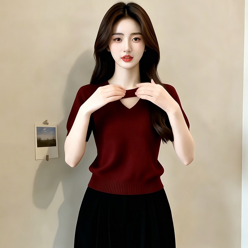 디자인 센스 홀로우 아웃 패치워크 반팔 니트 스웨터 여성 2026 여름 새로운 외국 가스 몸매 가꾸기 슬림해 보이는 맨위
