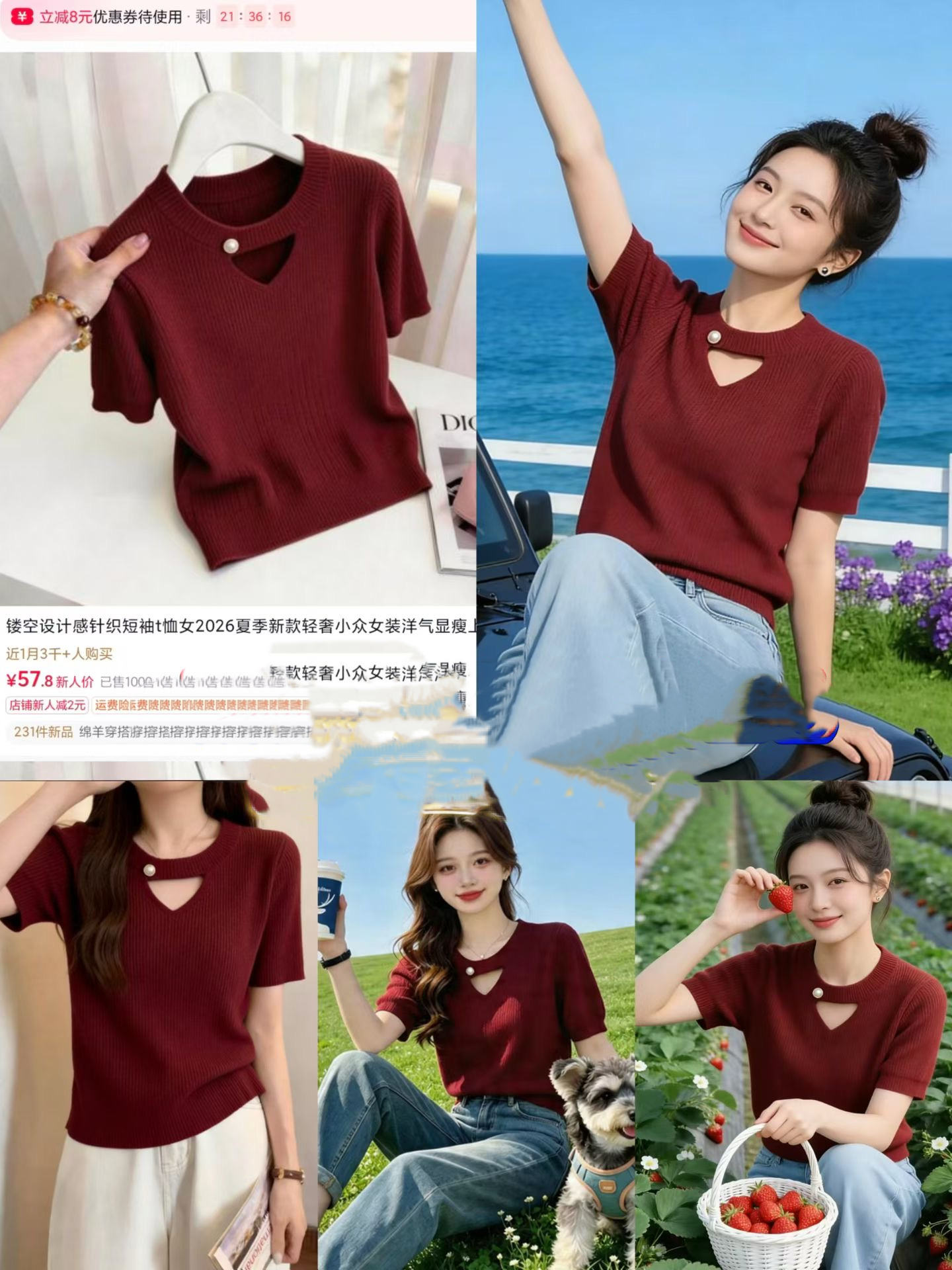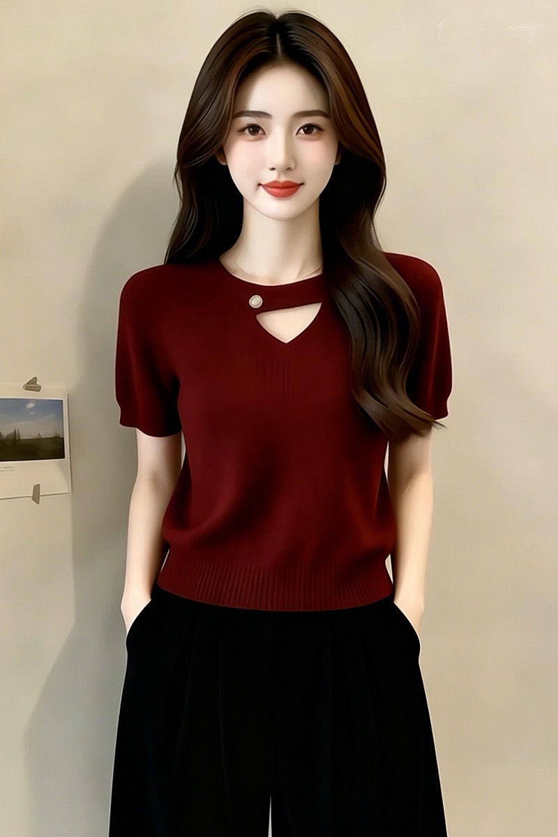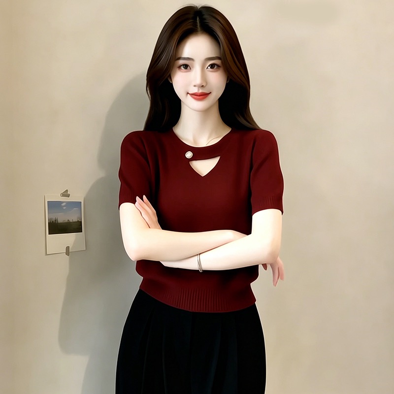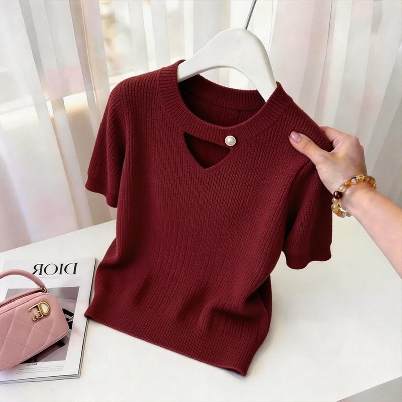 여름 새로운 부드러운 바람 진주 베이비 칼라 니트 반팔 여성 홀로우 아웃 디자인 센스 작은 대중 슬림해 보이는 품격 맨위