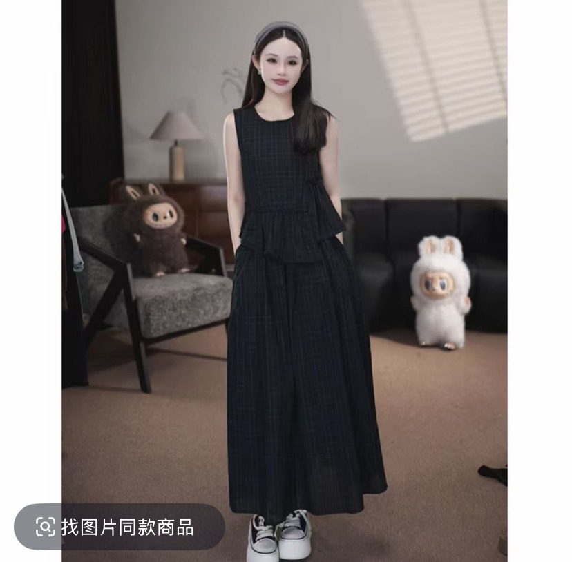 xiaoxiao2026 여름 새로운 레트로 체크무늬 프릴 민소매 맨위 반신 스커트 투피스 세트