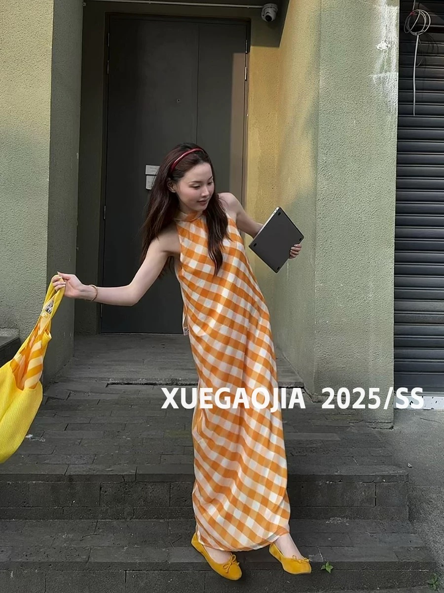 휴가 바람 주황색 체크무늬 리본 드레스 여성 의류 2026 새로운 고급 섹시함 품격 민소매 조끼 롱 스커트