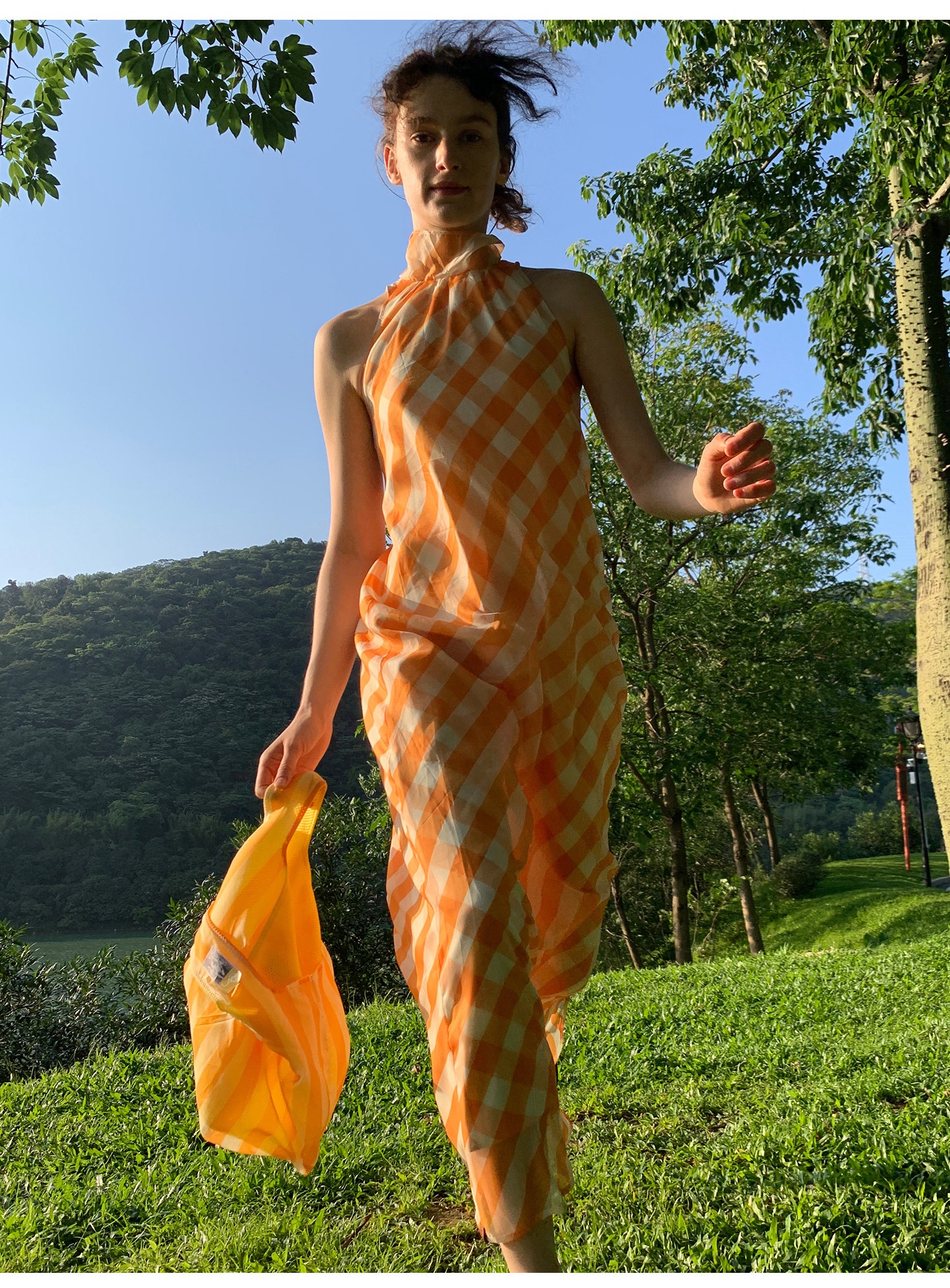 creambaby studio 주황색 체크무늬 리본 행침 목 오프숄더 드레스 롱 스커트 여성 디자인 센스 작은 대중