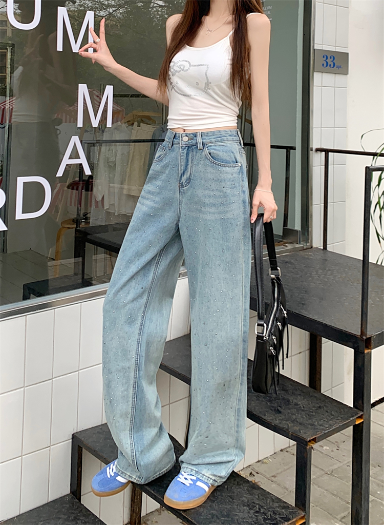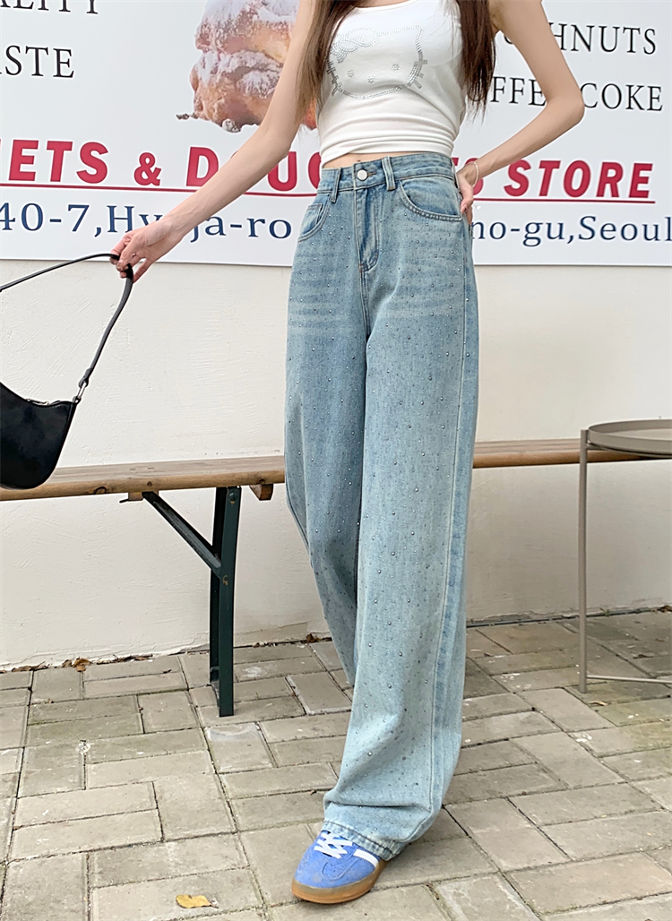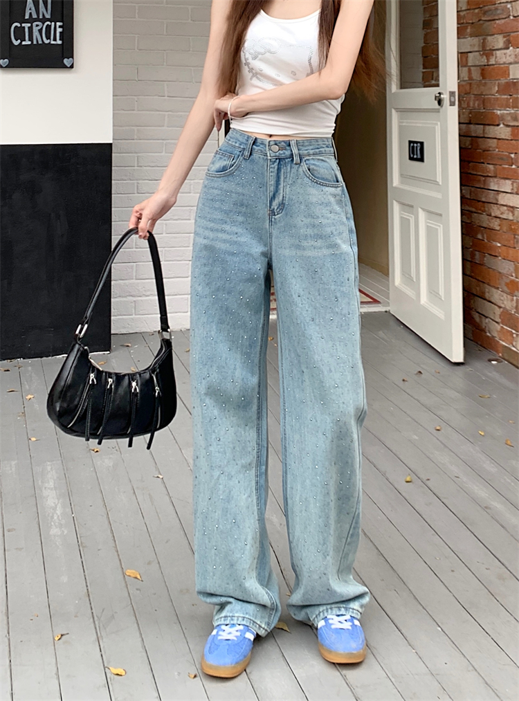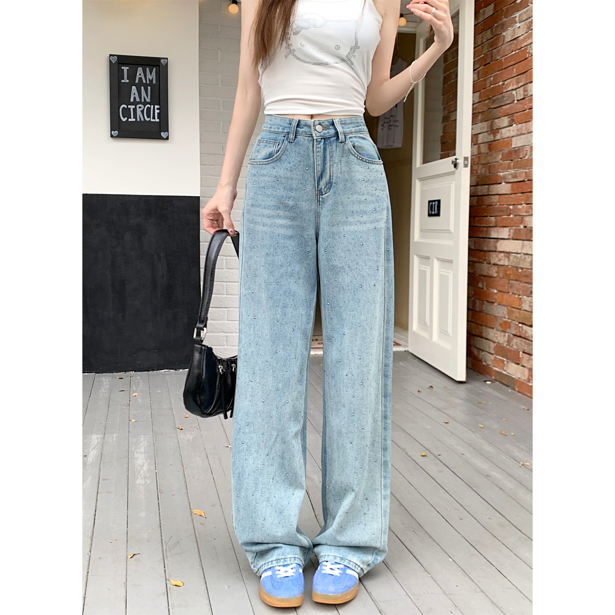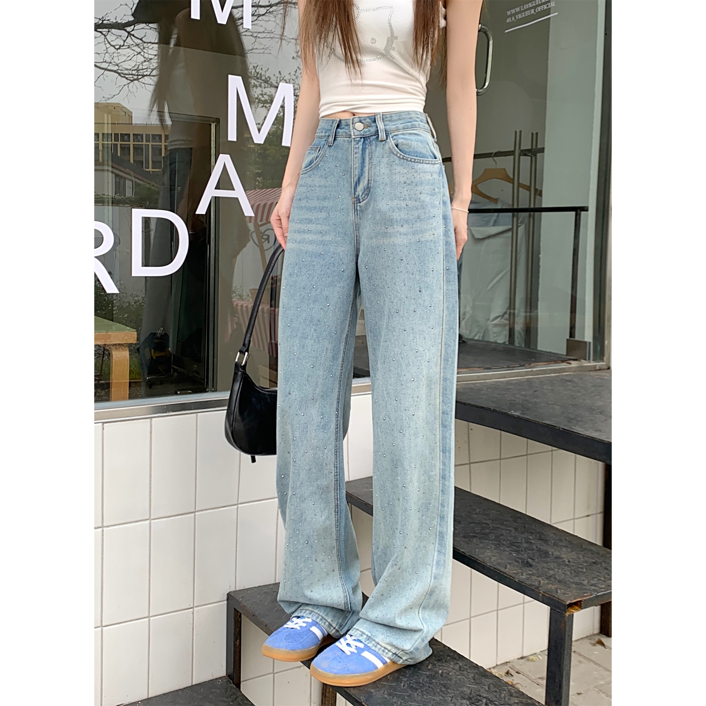 실사 빅 사이즈 여성 의류 Gypsophila 핫픽스 고급 디자인 센스 스트레이트 청바지 개성 슬림해 보이는 레트로 와이드 레그 팬츠
