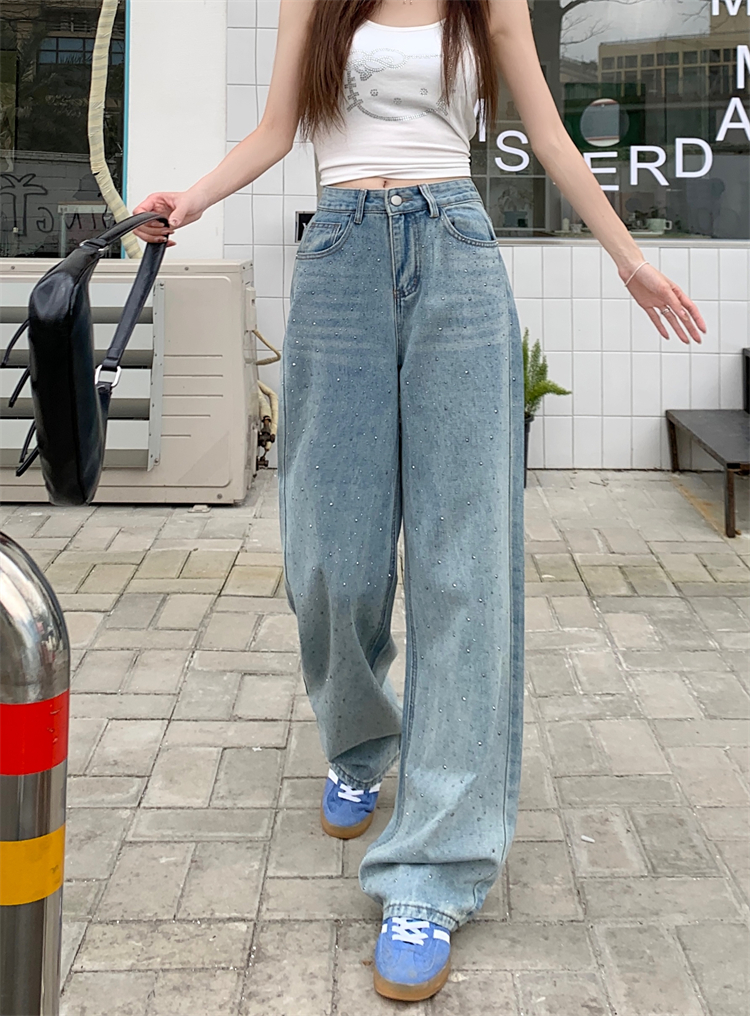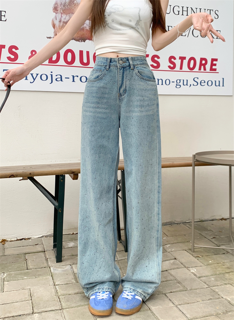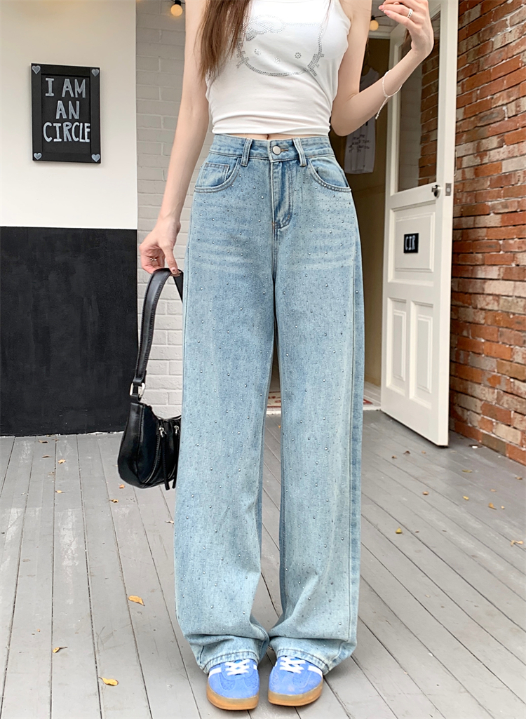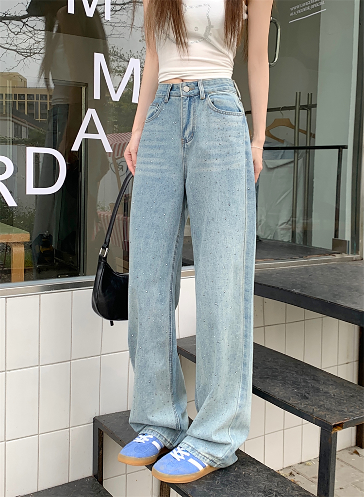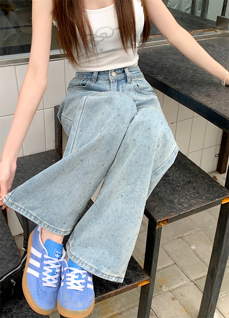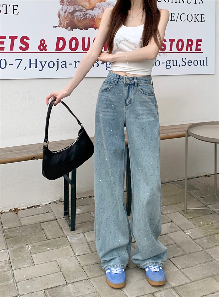 실사 빅 사이즈 여성 의류 Gypsophila 핫픽스 고급 디자인 센스 스트레이트 청바지 개성 슬림해 보이는 레트로 와이드 레그 팬츠