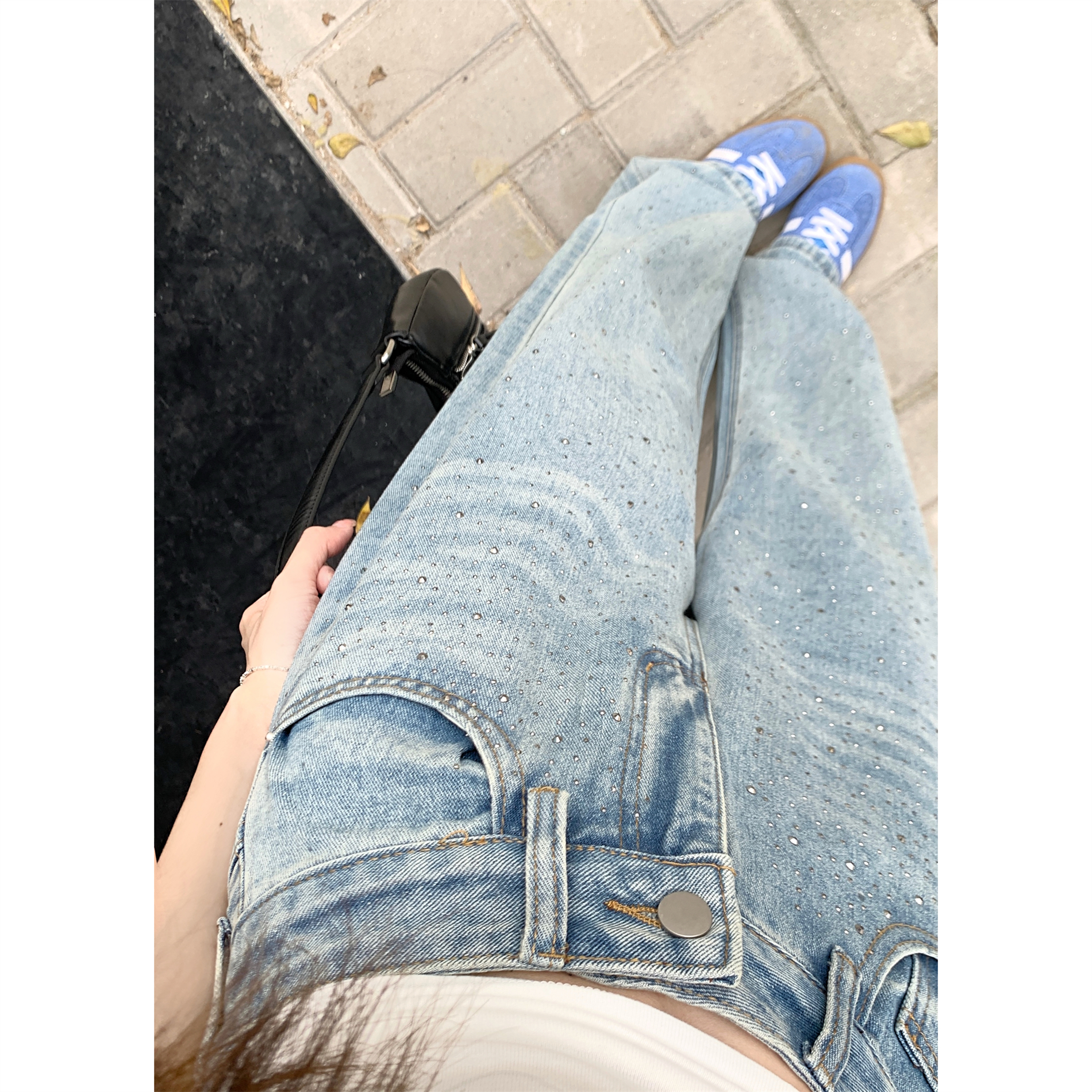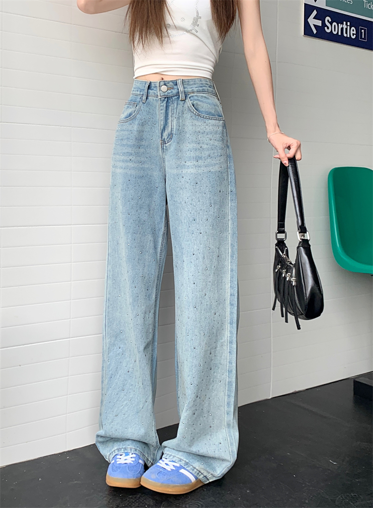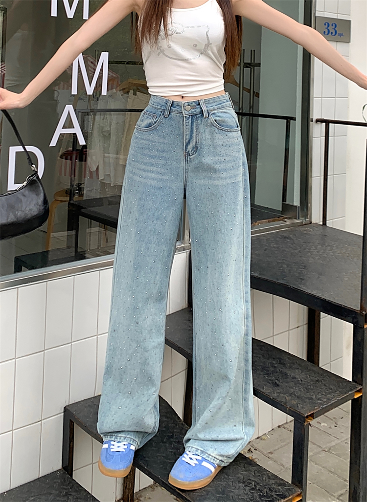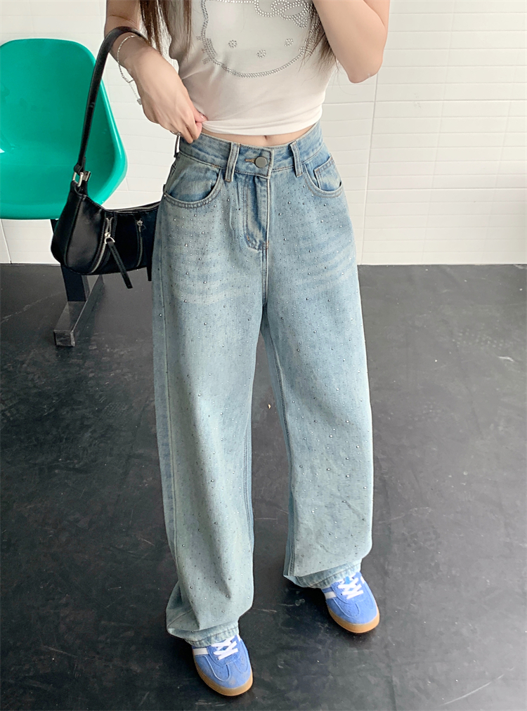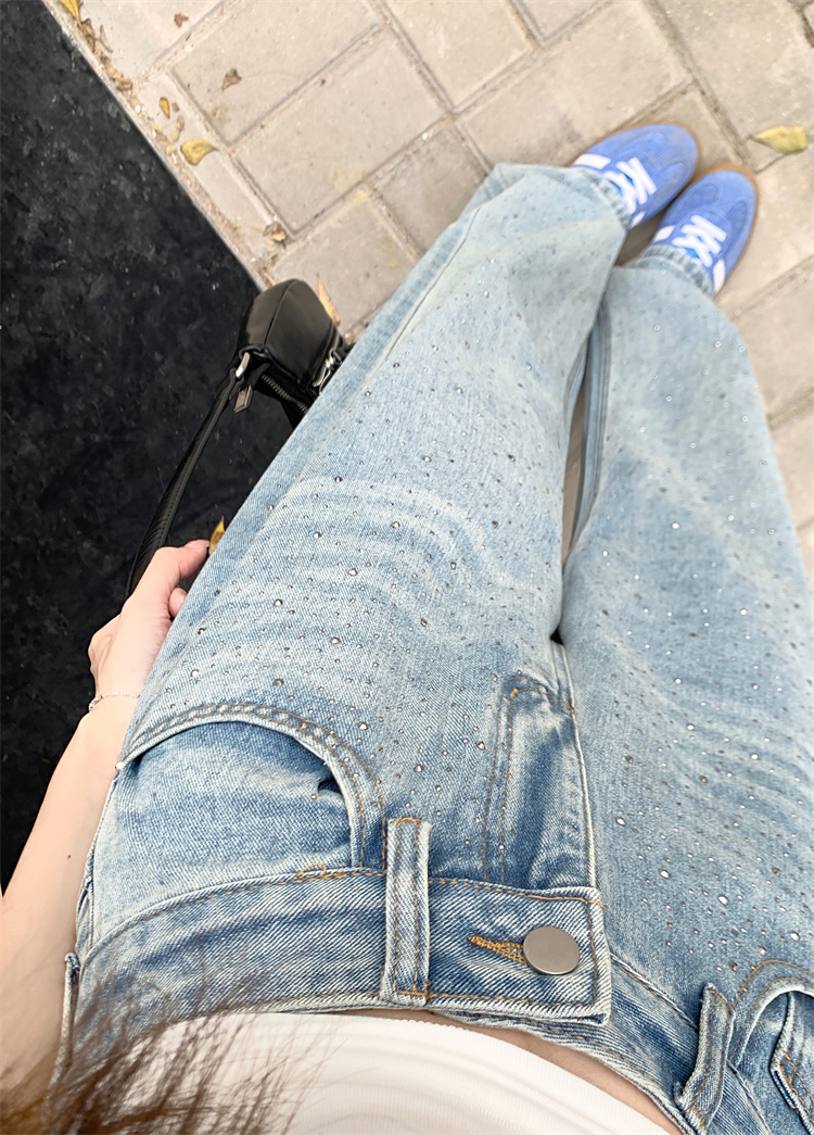 실사 빅 사이즈 여성 의류 Gypsophila 핫픽스 고급 디자인 센스 스트레이트 청바지 개성 슬림해 보이는 레트로 와이드 레그 팬츠