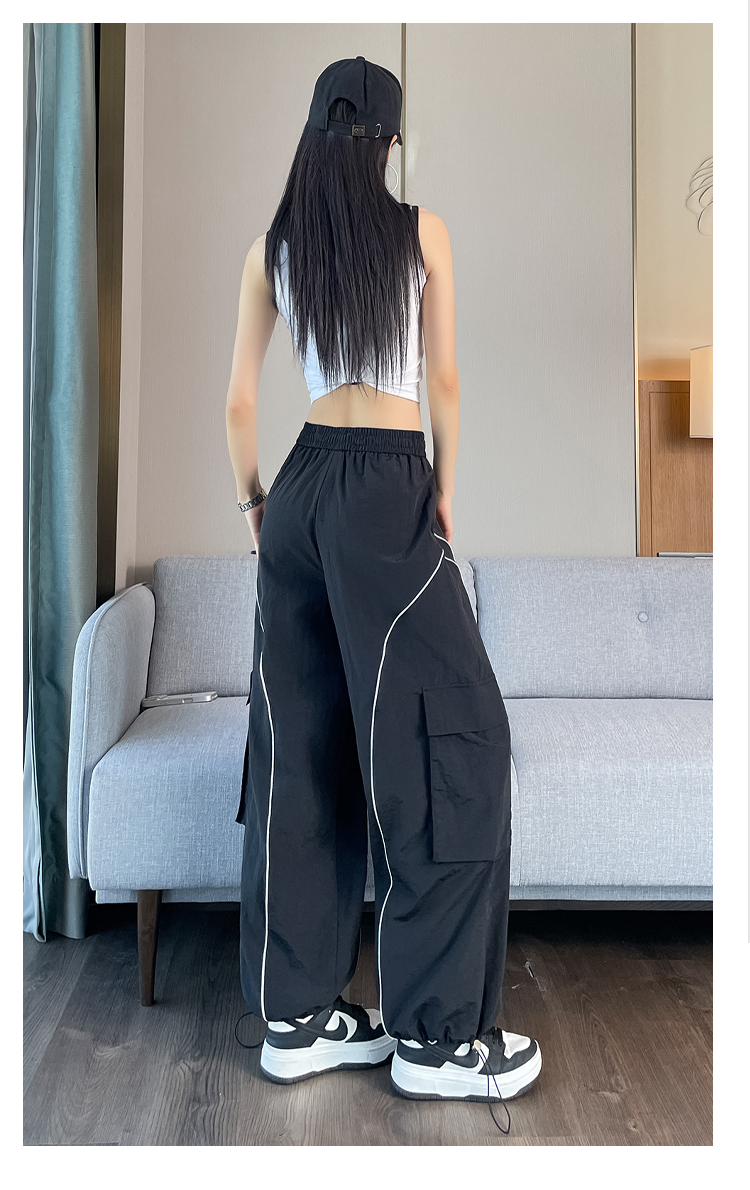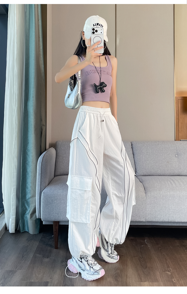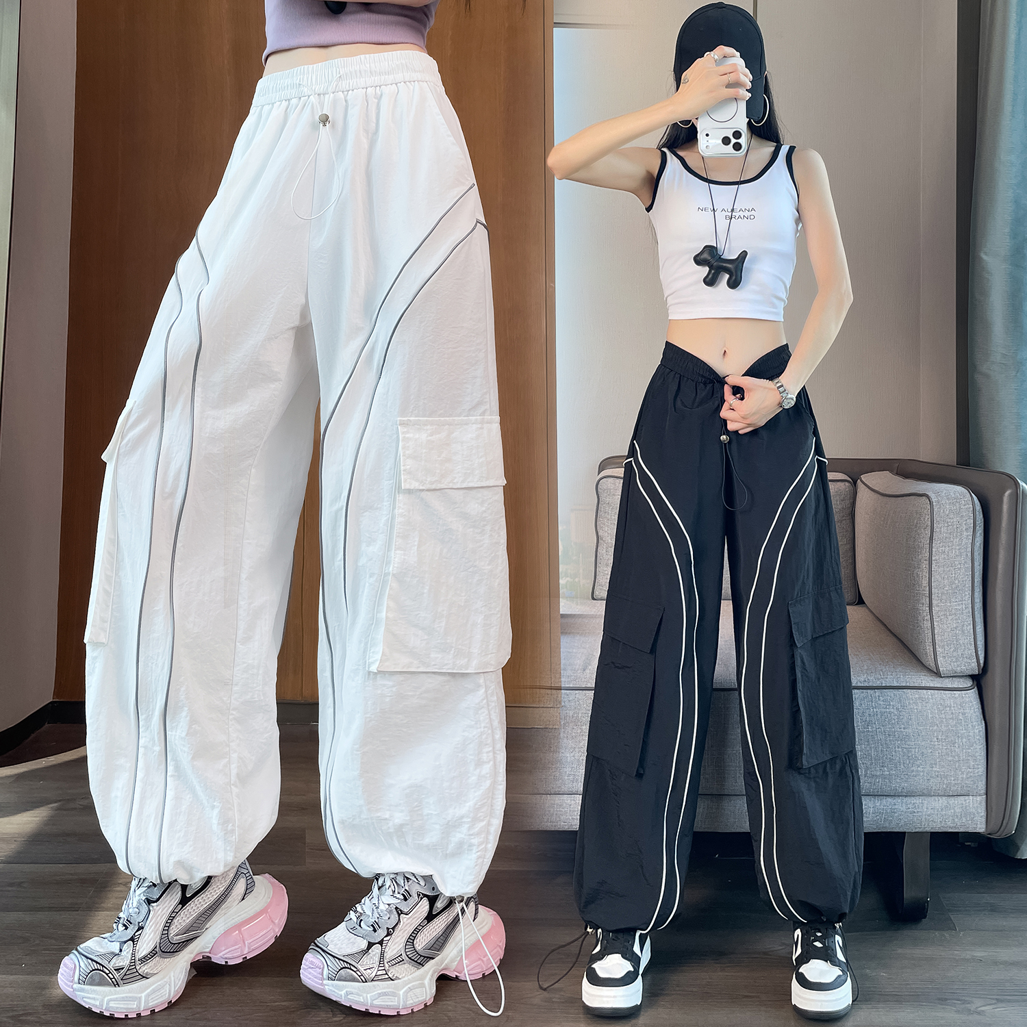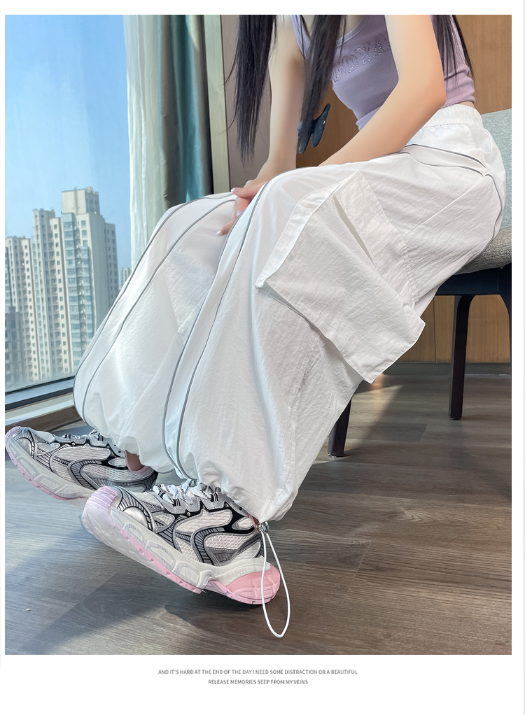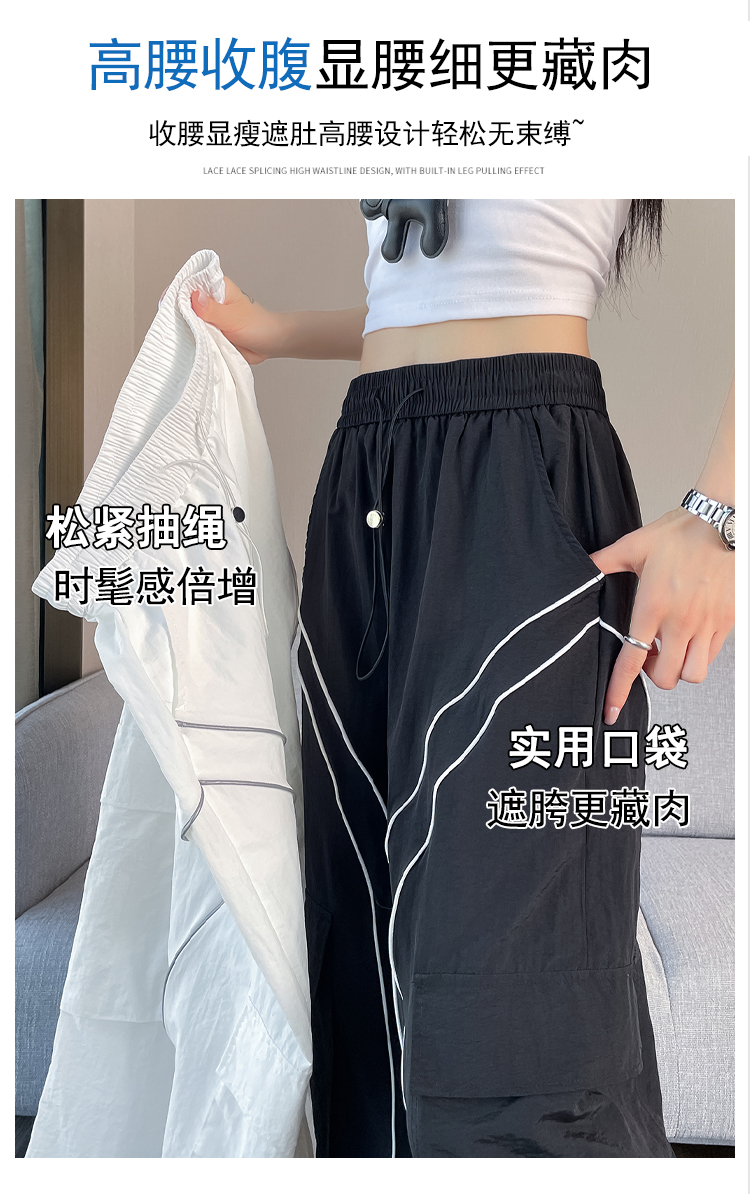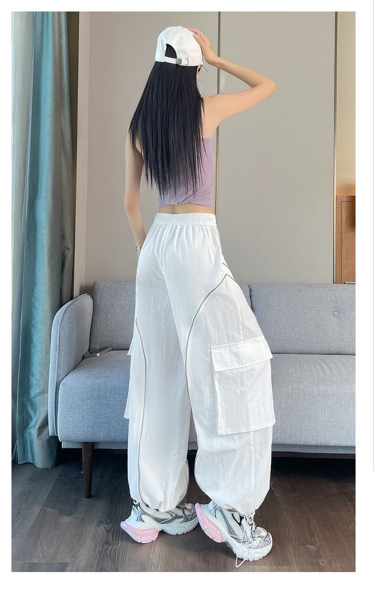 실사 여름 얇은 스타일 둘 착용 디자인 센스 주머니 워크웨어 팬츠 여성 하이웨이스트 펌프 로프 조거 속도 건조한 캐주얼 바지