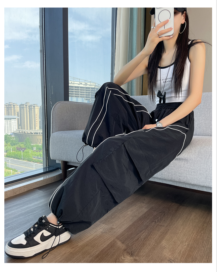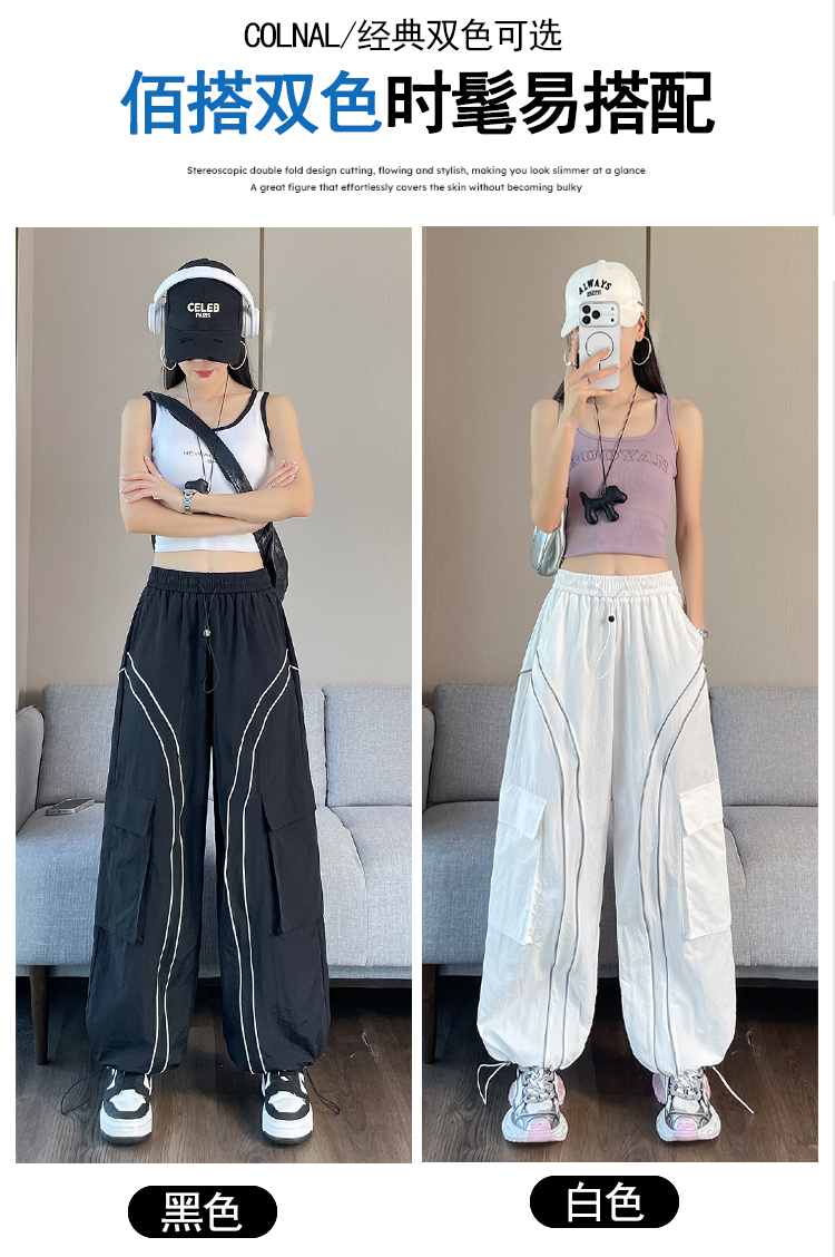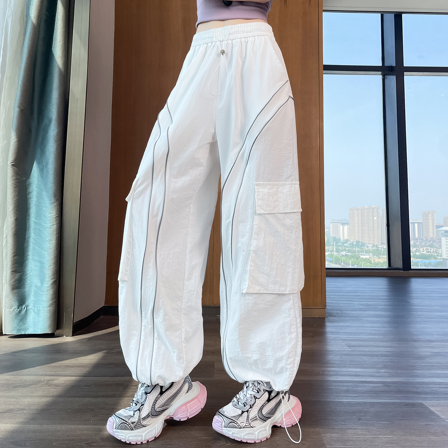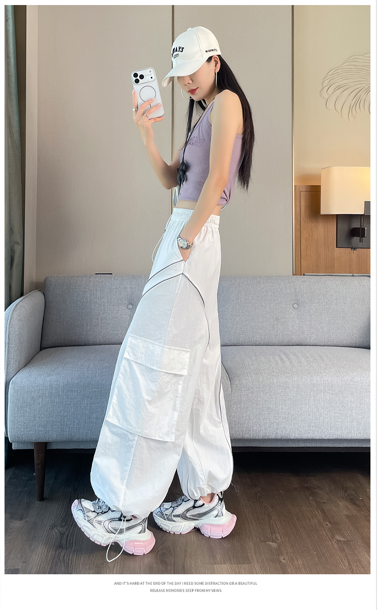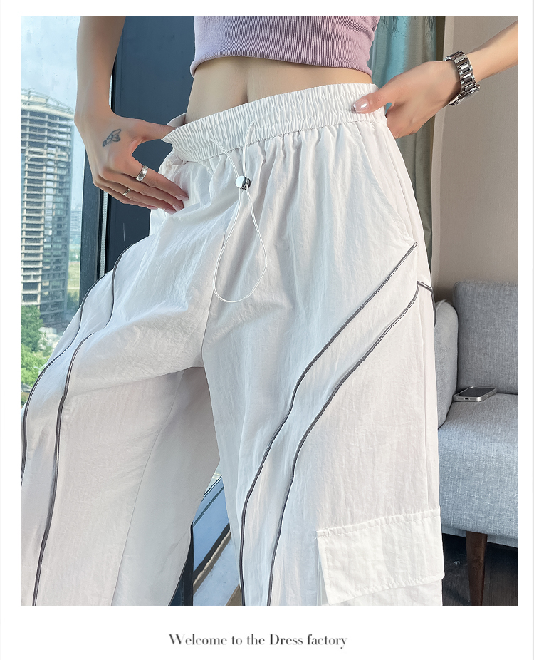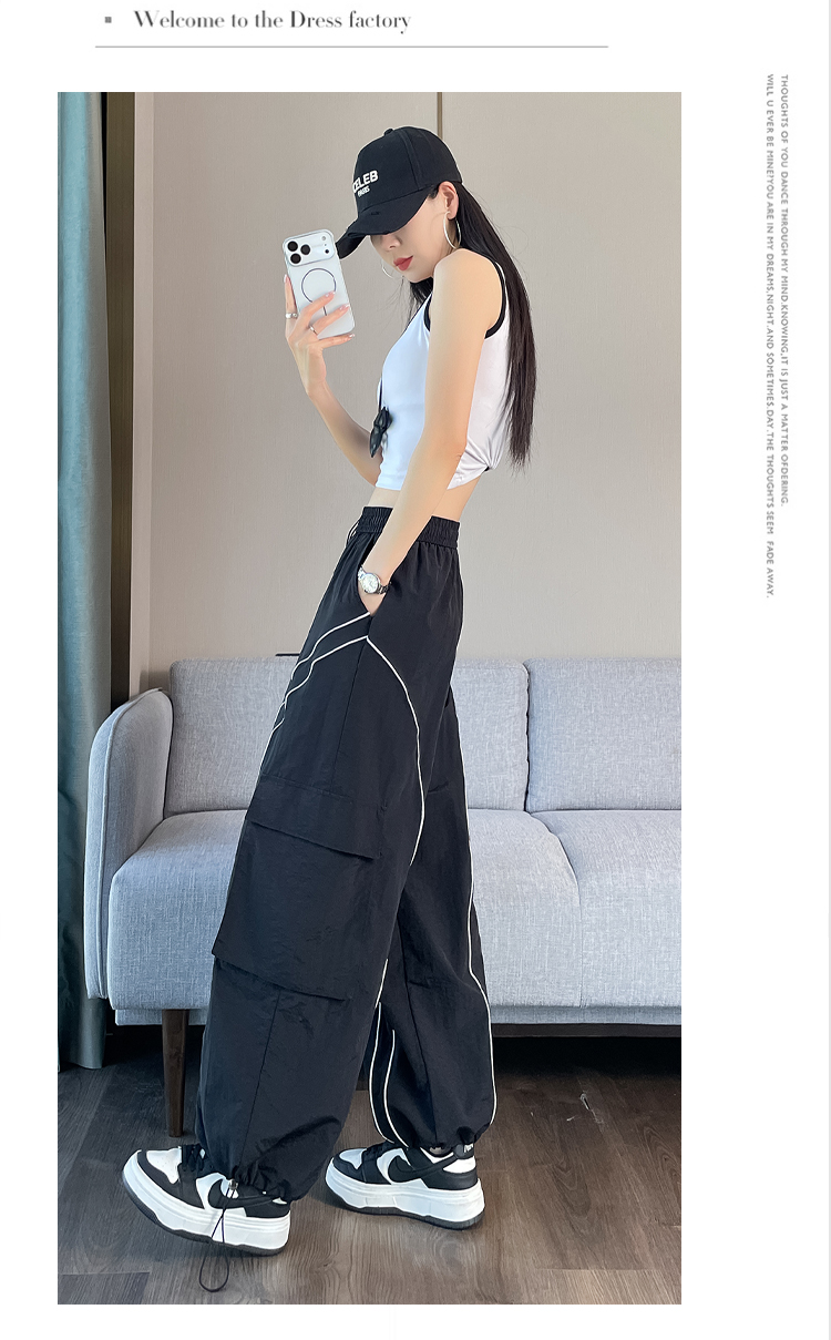 실사 여름 얇은 스타일 둘 착용 디자인 센스 주머니 워크웨어 팬츠 여성 하이웨이스트 펌프 로프 조거 속도 건조한 캐주얼 바지
