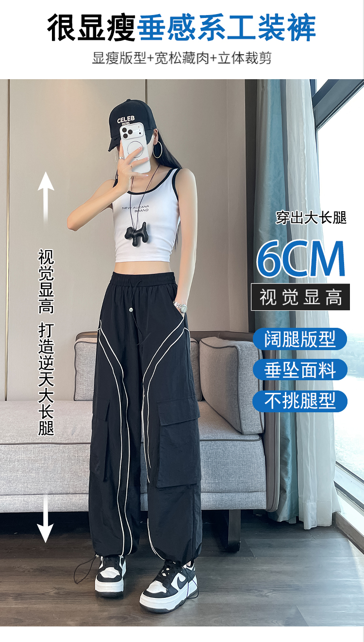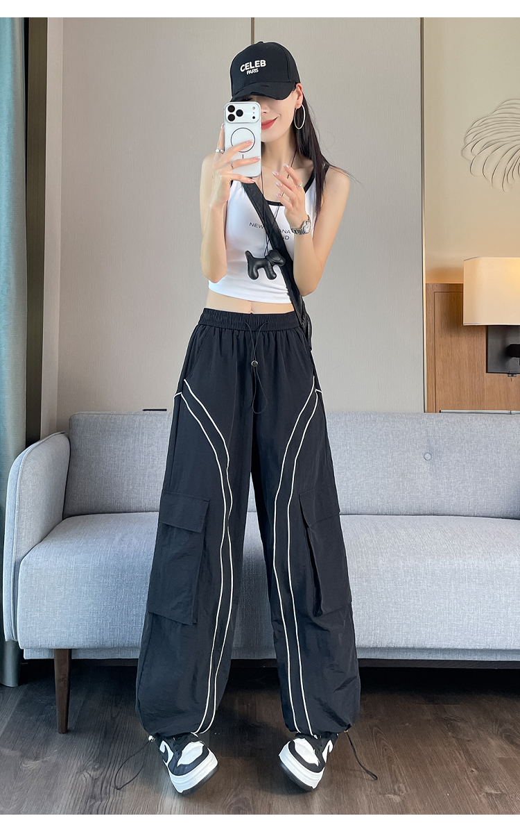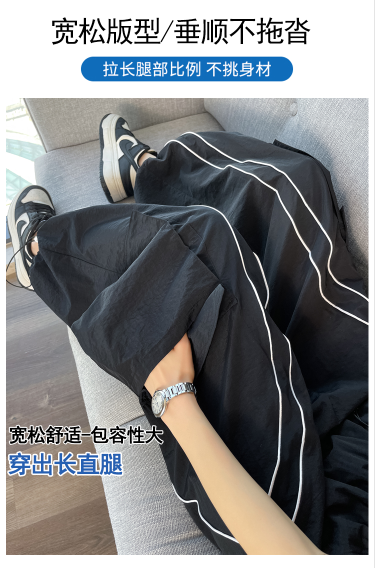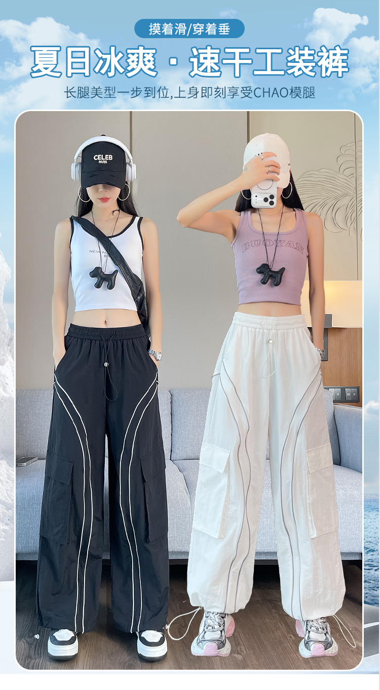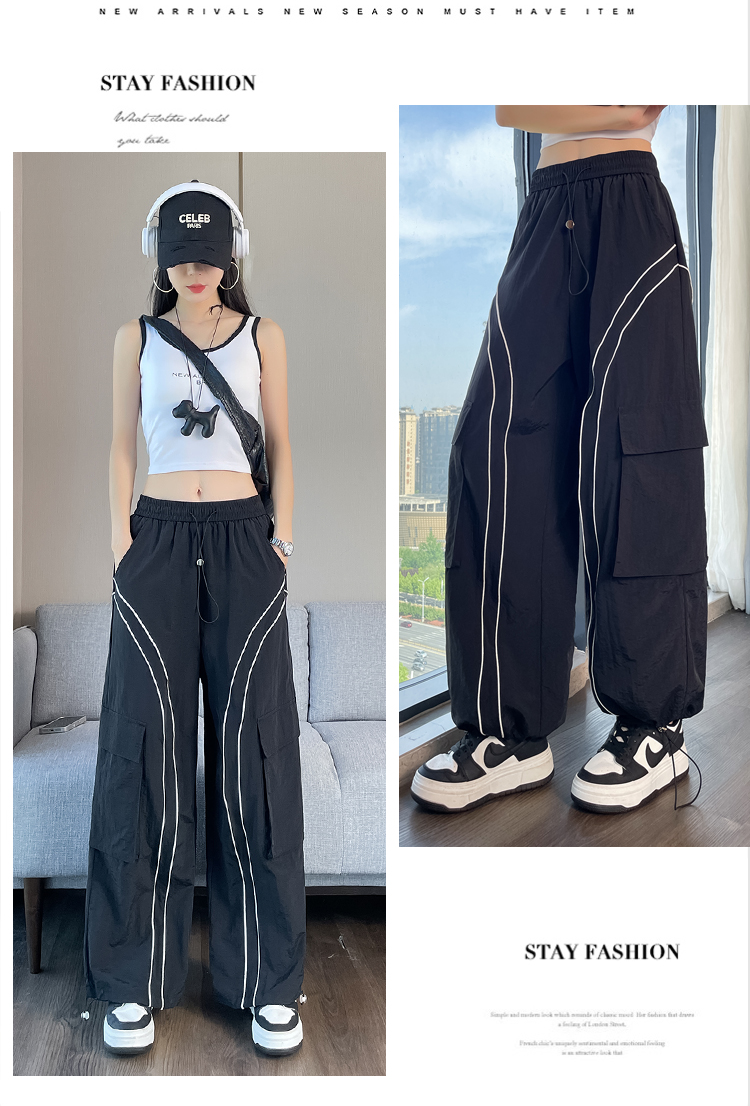 사면 신축 있음 주머니 여름 얇은 스타일 바지 2025 새로운 폭발 작은 키 루즈핏 스트라이프 넓은 다리 길이 바지