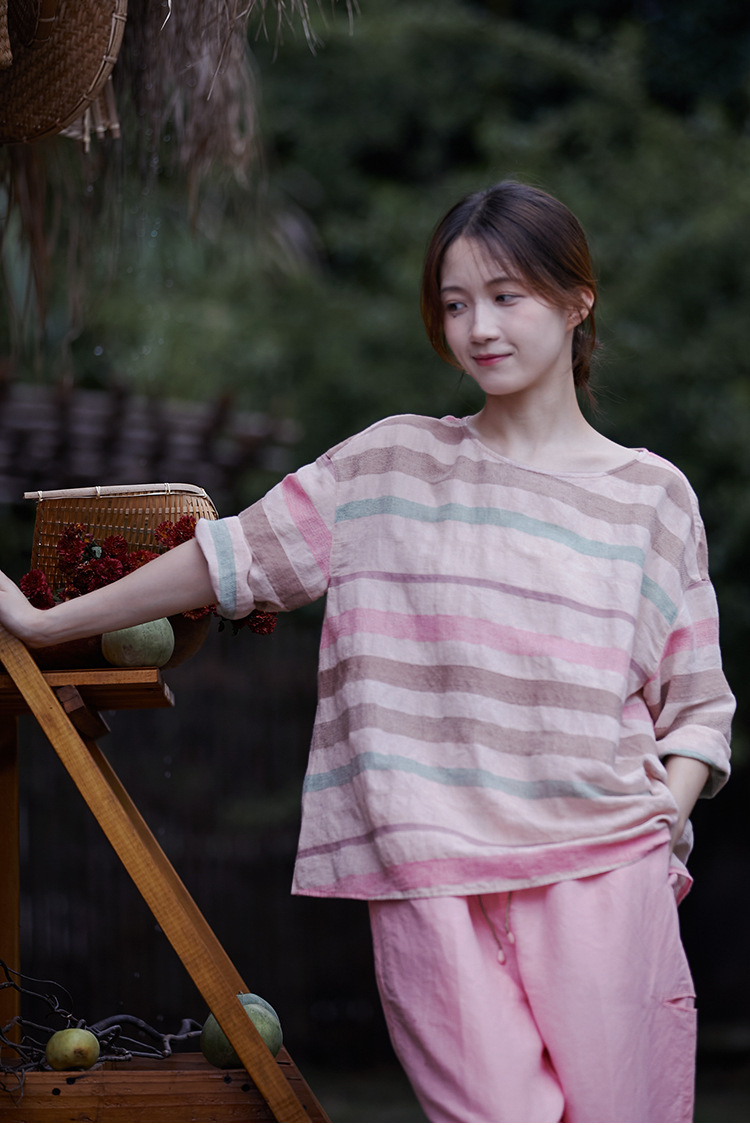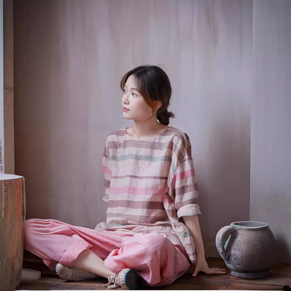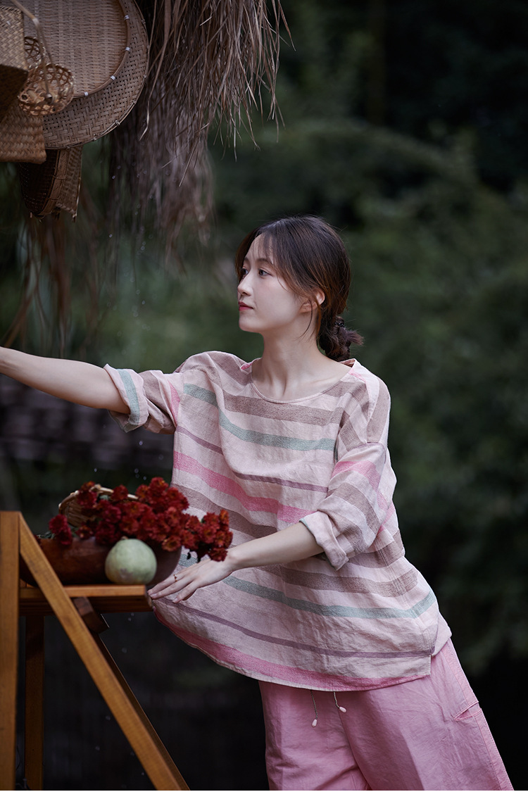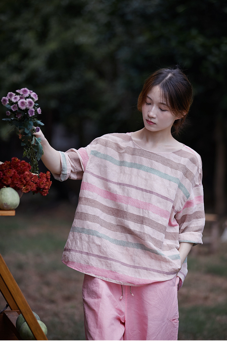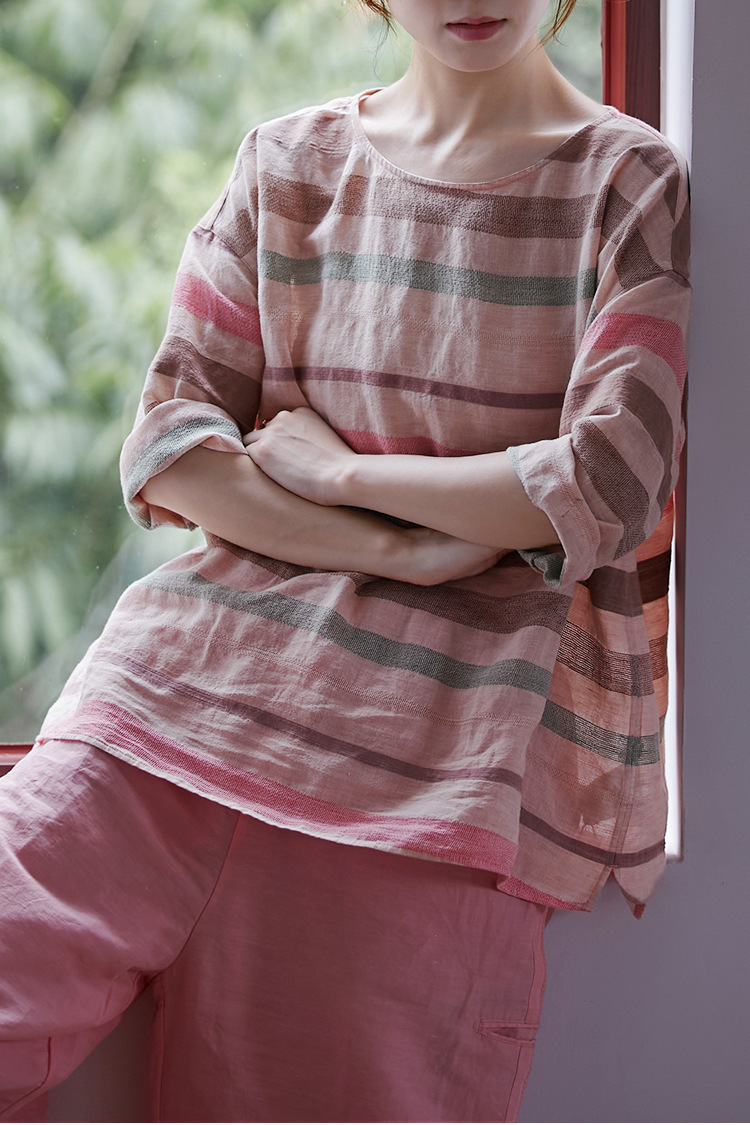 갱신 선적 2025 여름 섹션 유약 핑크색 리넨 면화 가로 줄무늬 문단 라운드 넥 얇고 가벼운 통기성 풀오버 셔츠 티셔츠