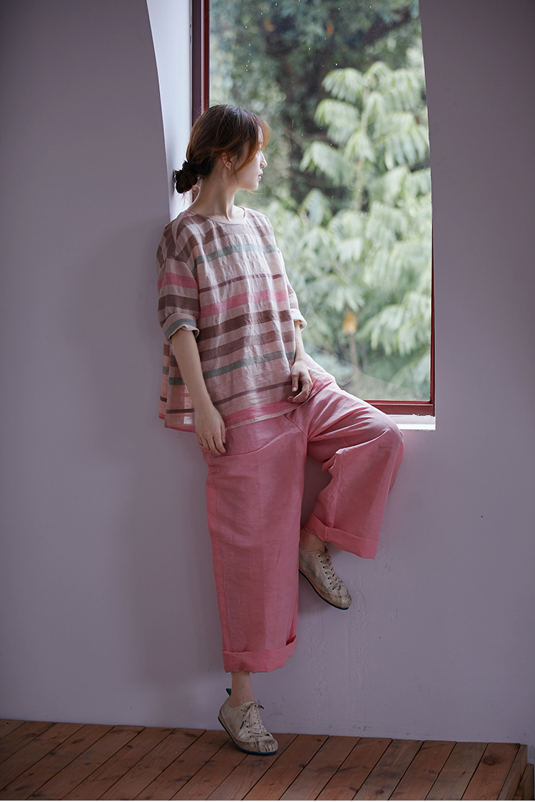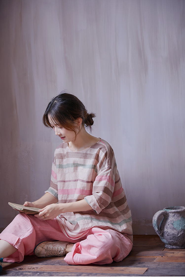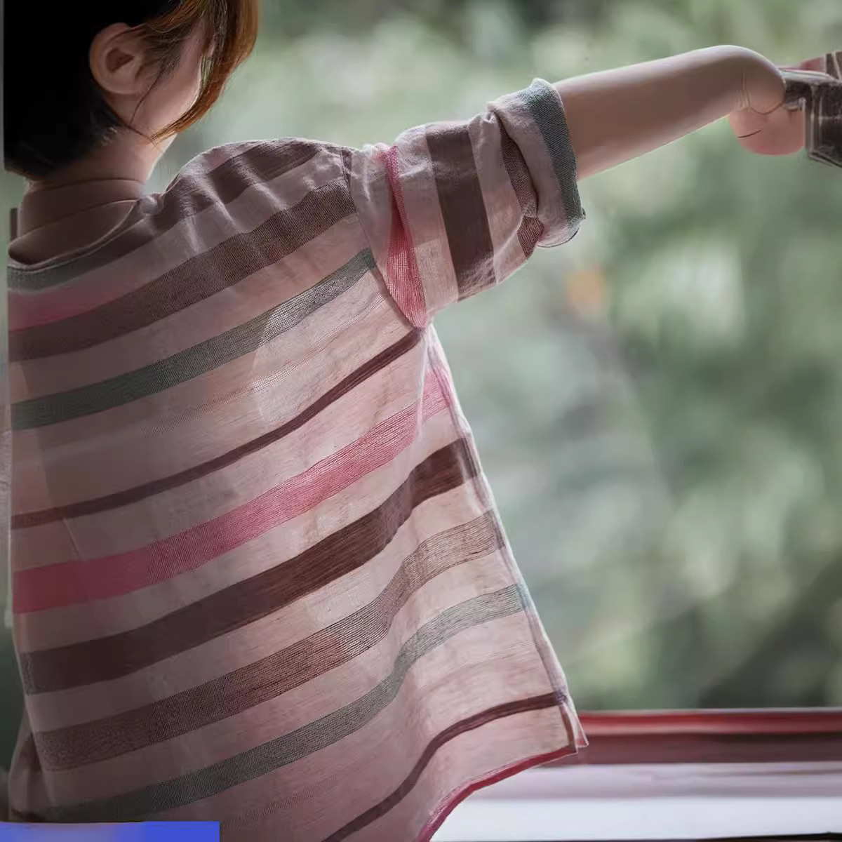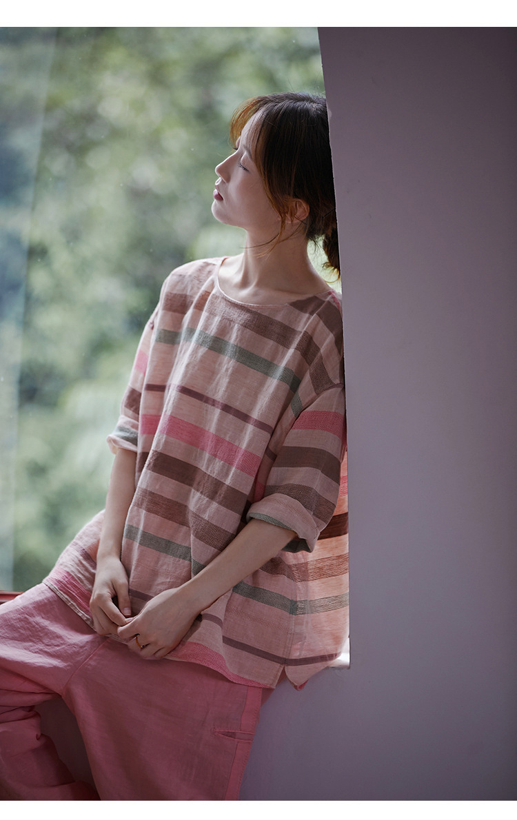 갱신 선적 2025 여름 섹션 유약 핑크색 리넨 면화 가로 줄무늬 문단 라운드 넥 얇고 가벼운 통기성 풀오버 셔츠 티셔츠