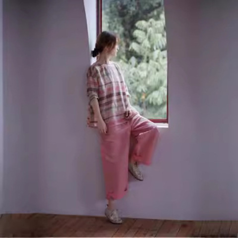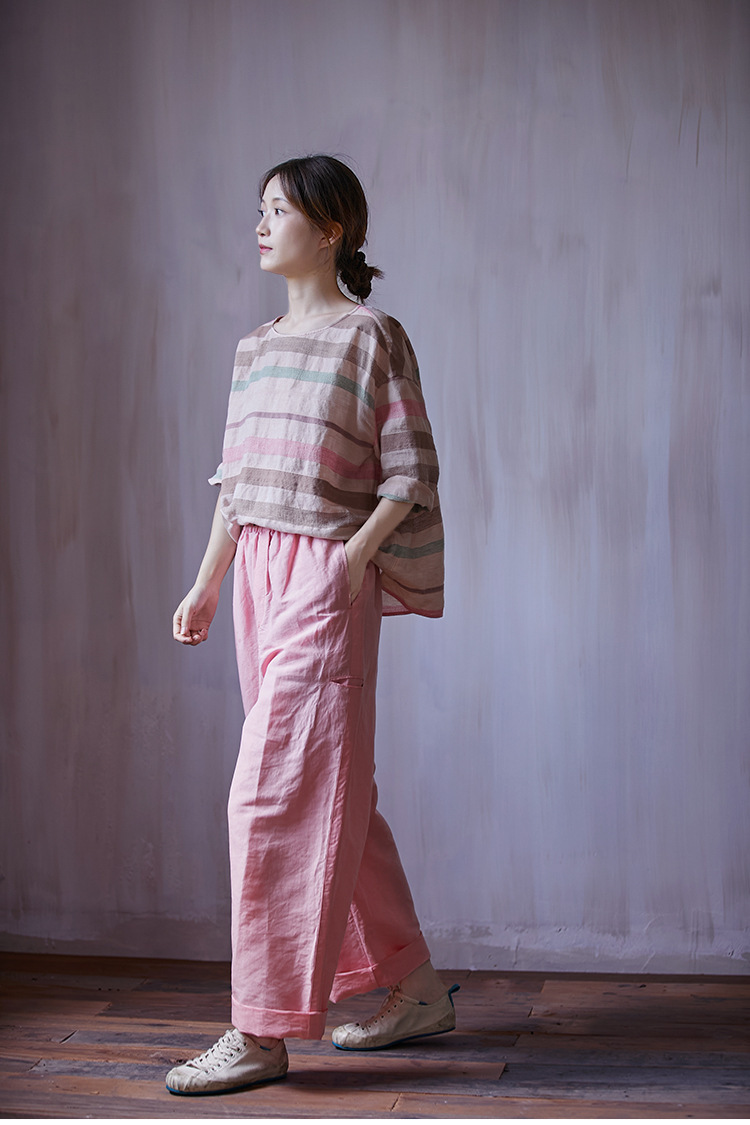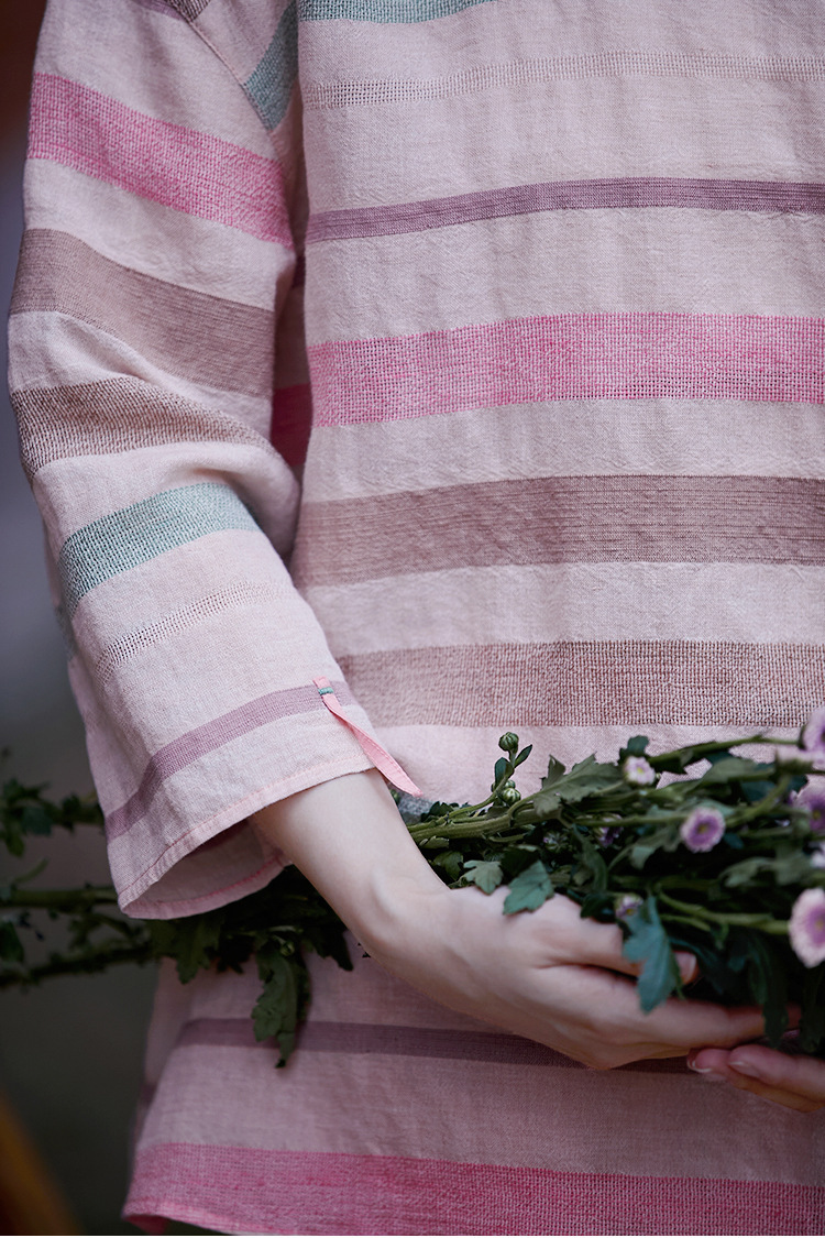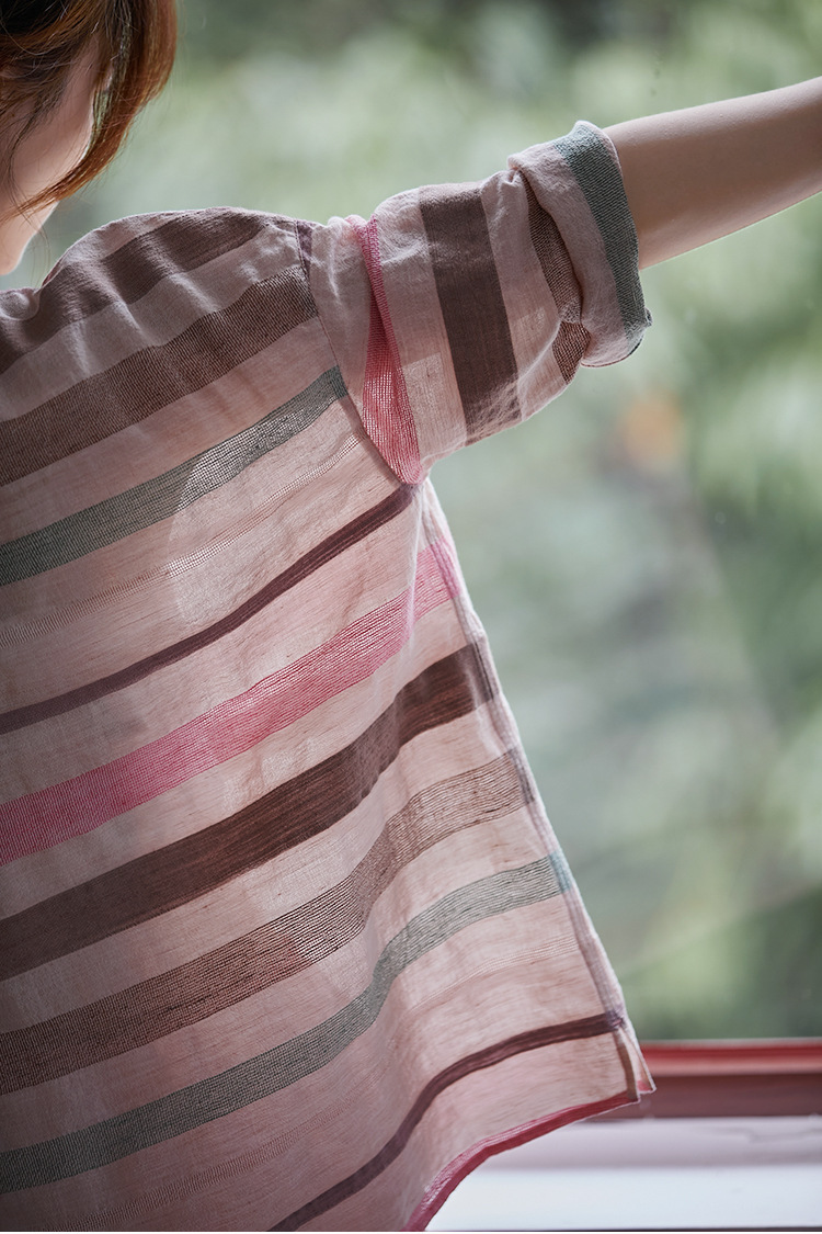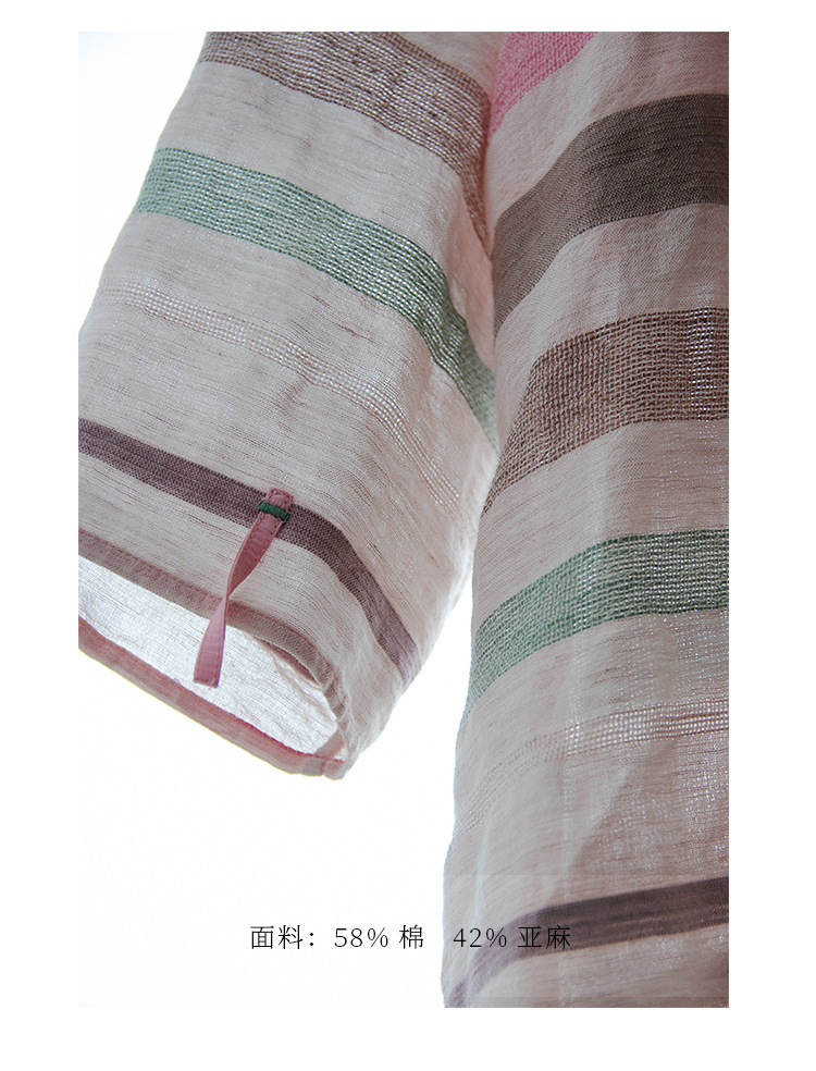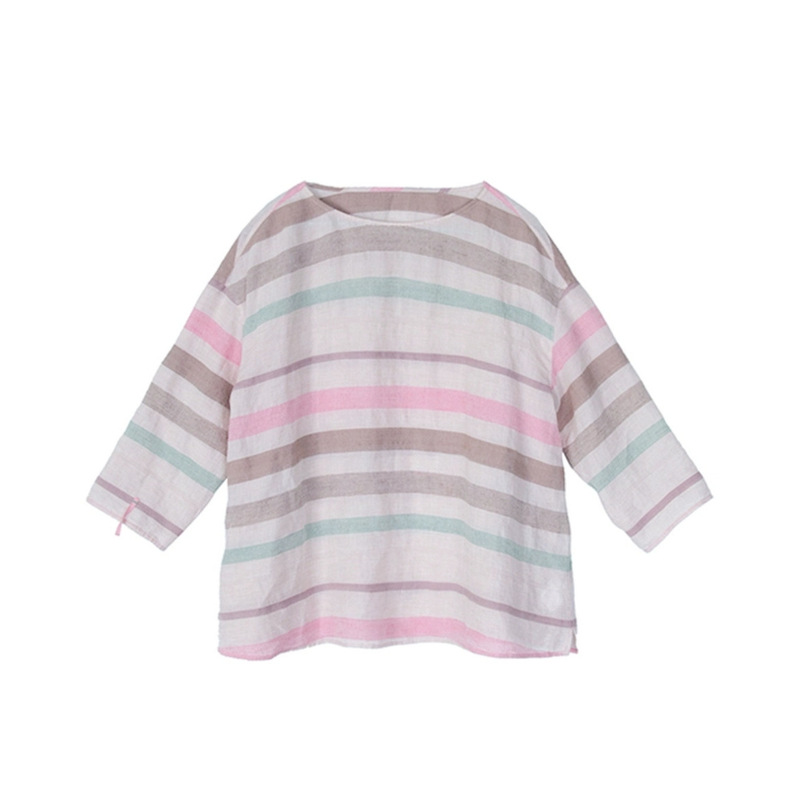 갱신 선적 2025 여름 섹션 유약 핑크색 리넨 면화 가로 줄무늬 문단 라운드 넥 얇고 가벼운 통기성 풀오버 셔츠 티셔츠