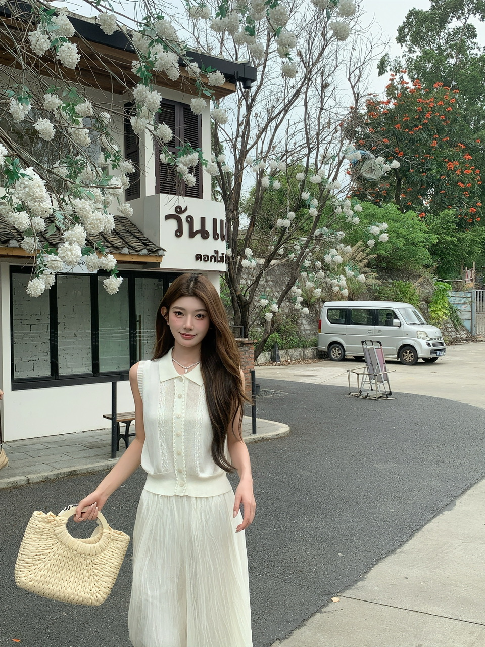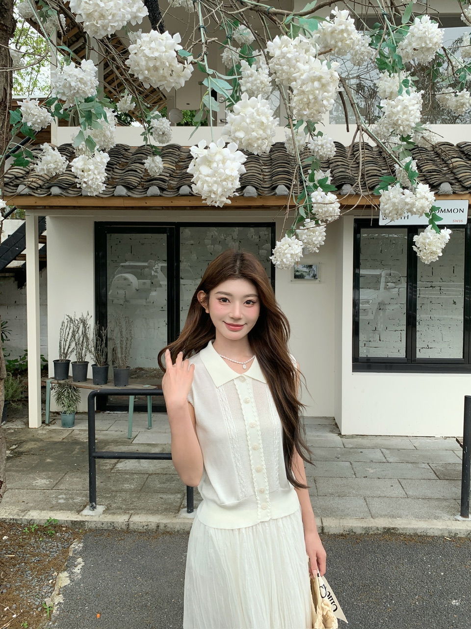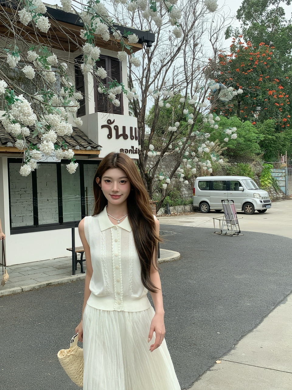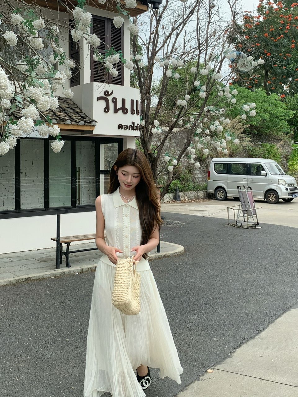 여름 작은 흰색 꽃 니트 세트 여성 봄 여름 오프숄더 맨위 플리츠 스커트 투피스 세트