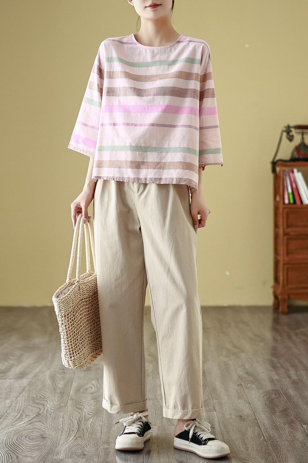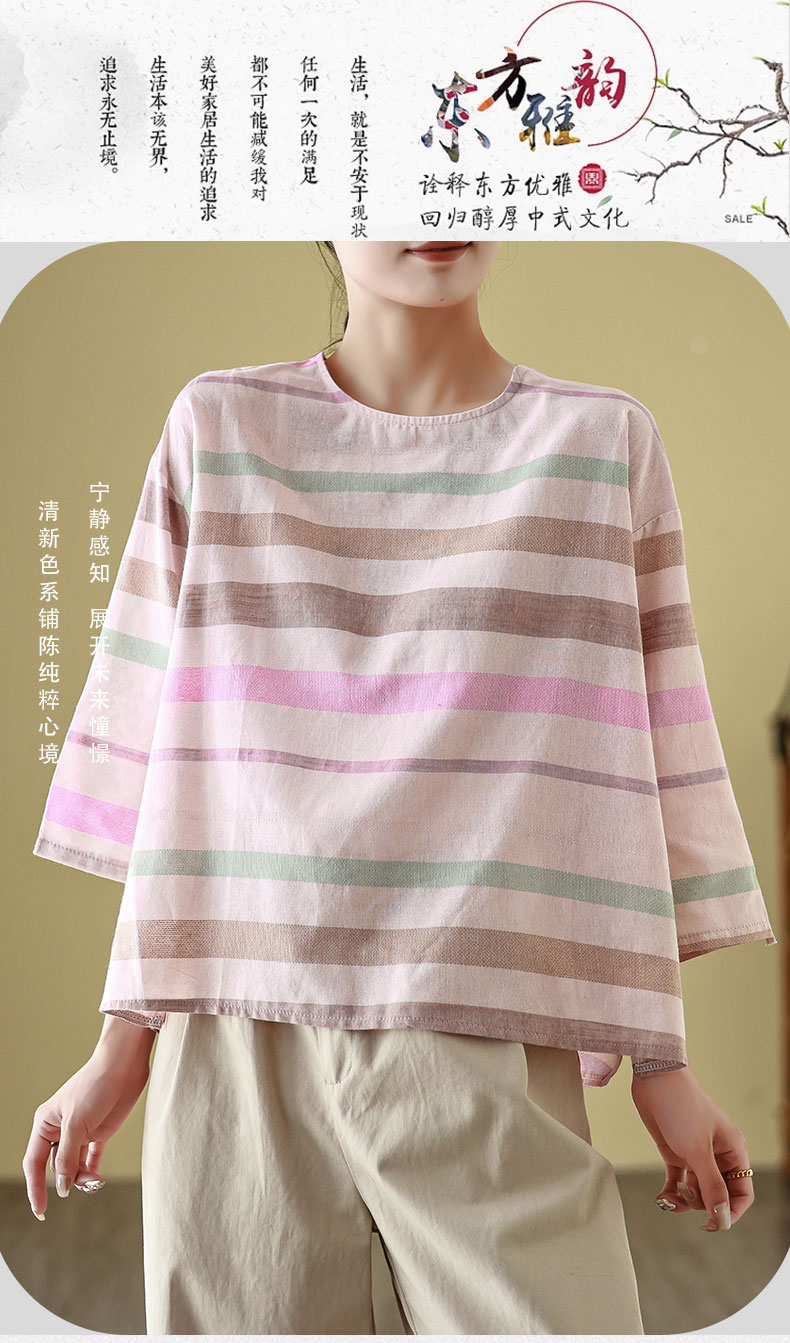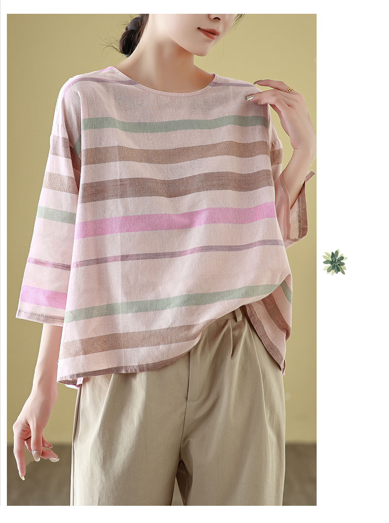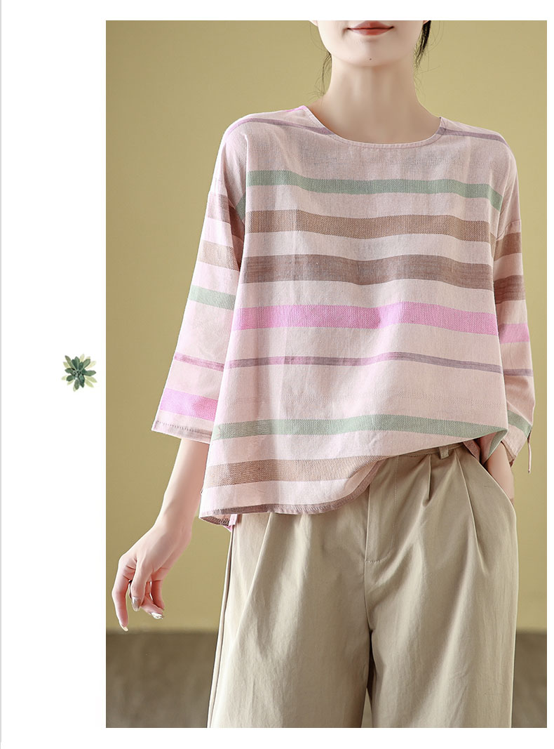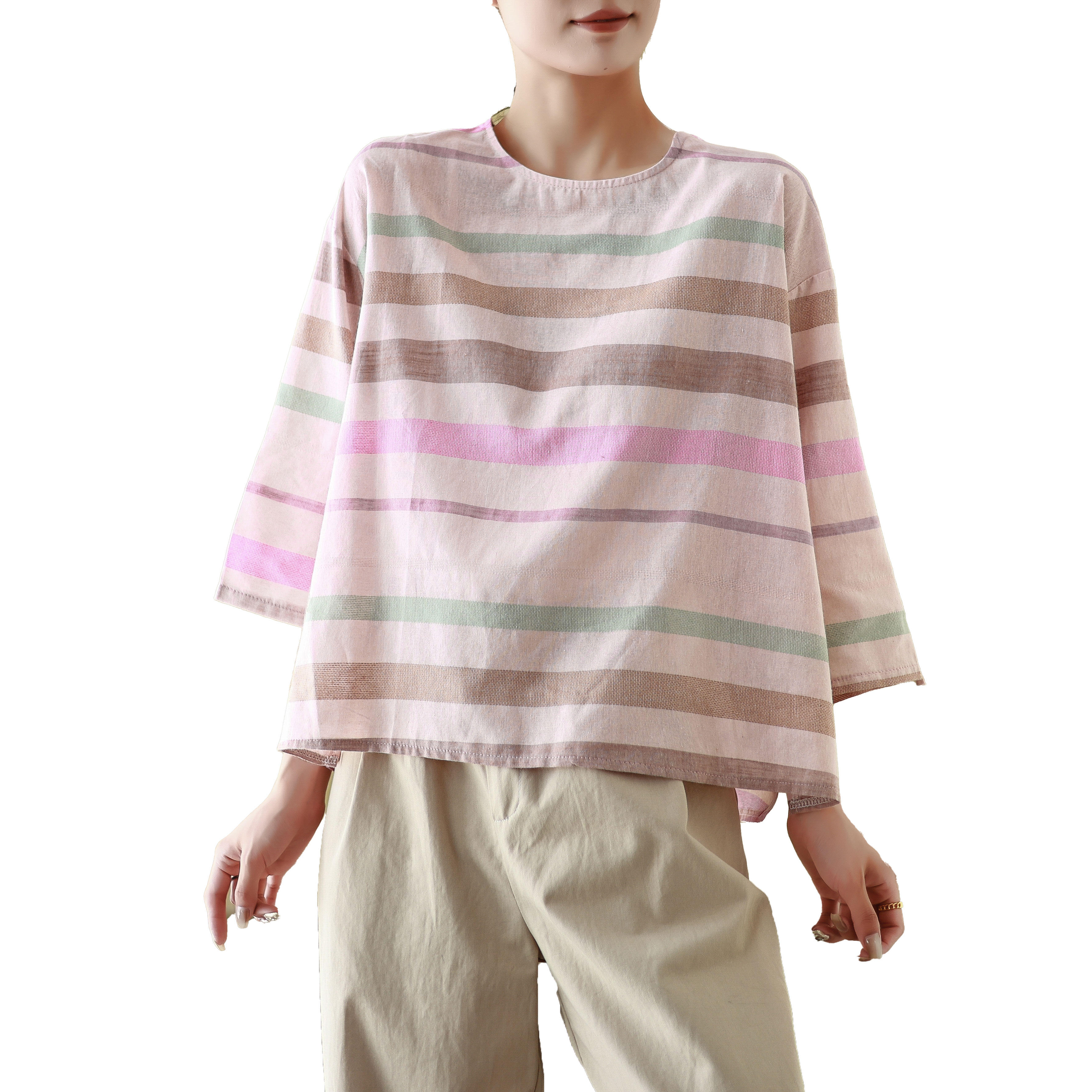 갱신 선적 2025 여름 섹션 유약 핑크색 리넨 면화 가로 줄무늬 문단 라운드 넥 얇고 가벼운 통기성 풀오버 셔츠 티셔츠