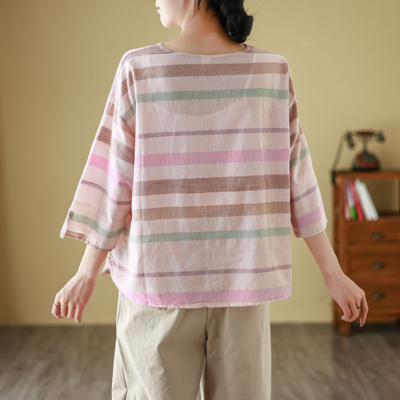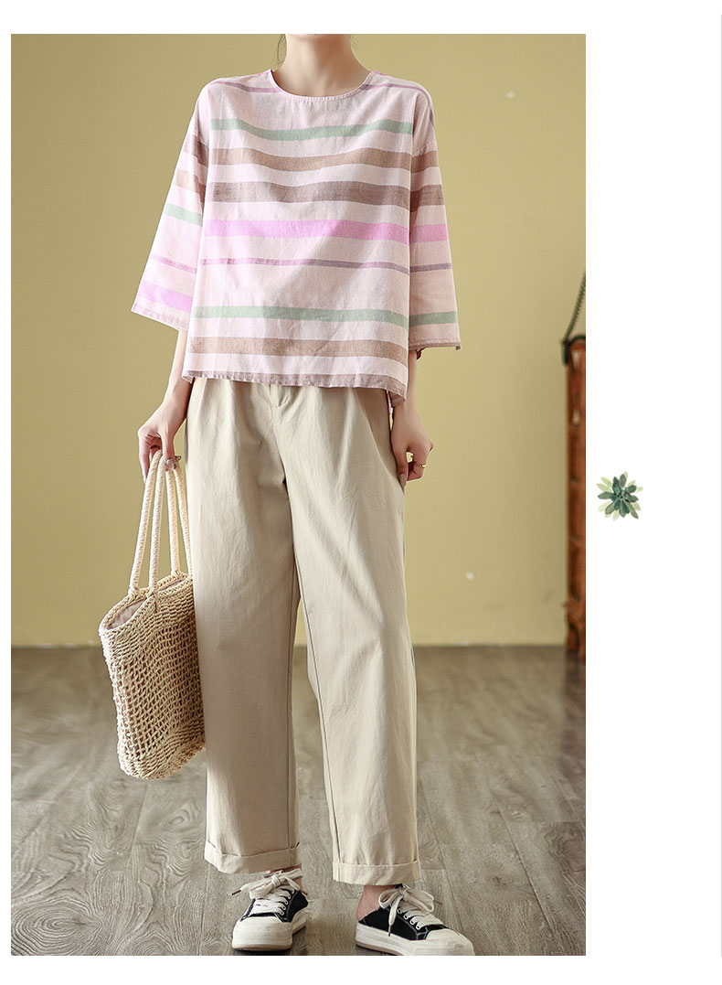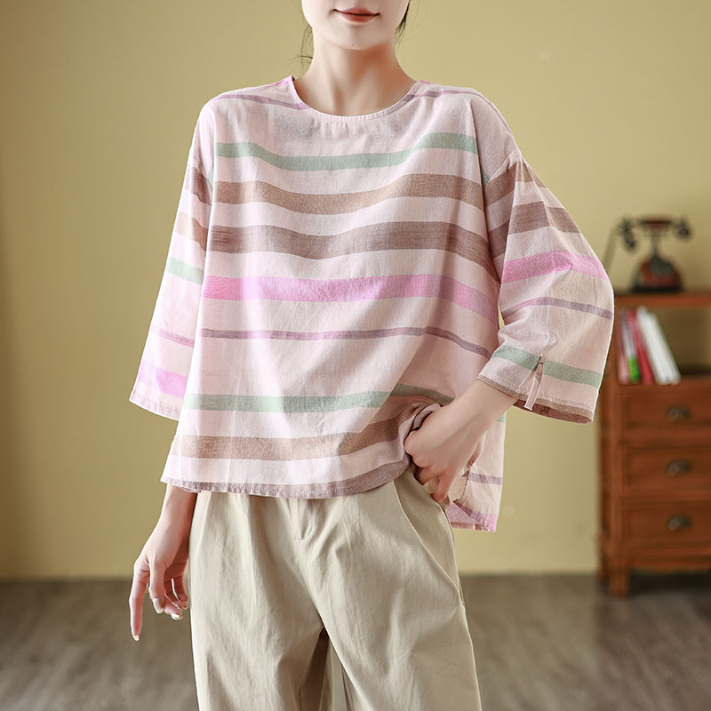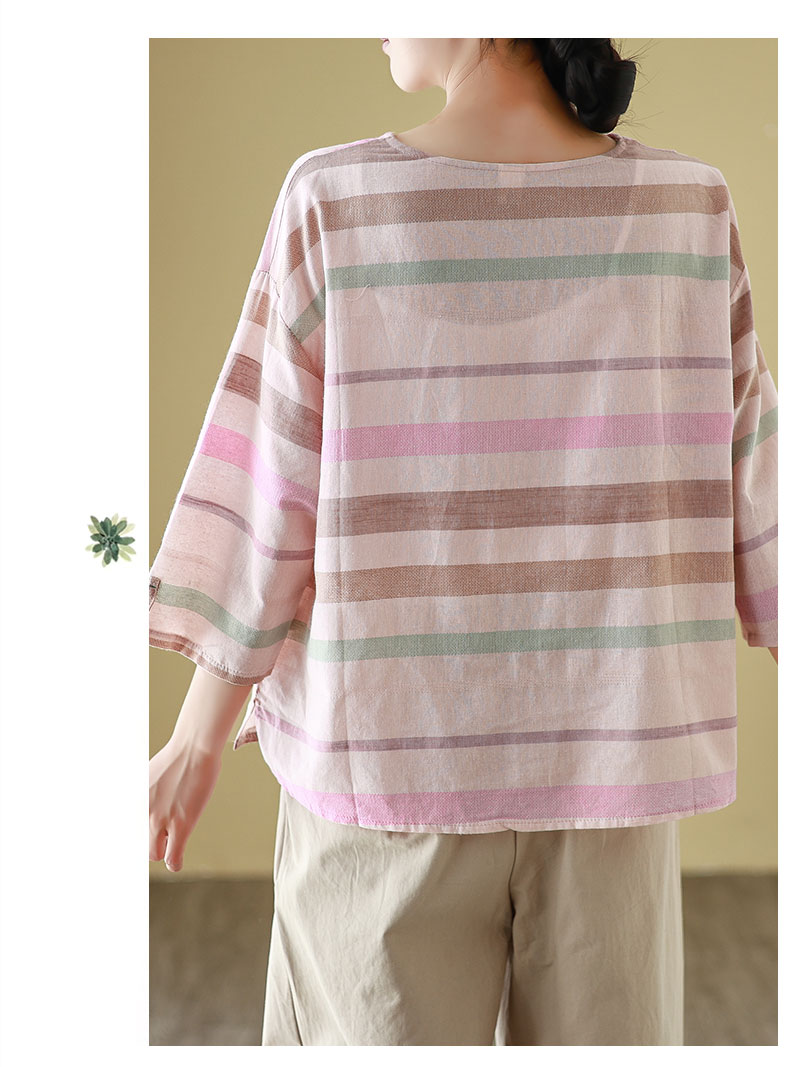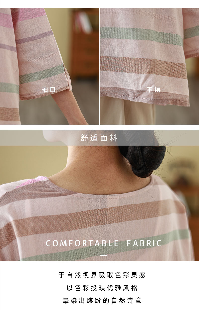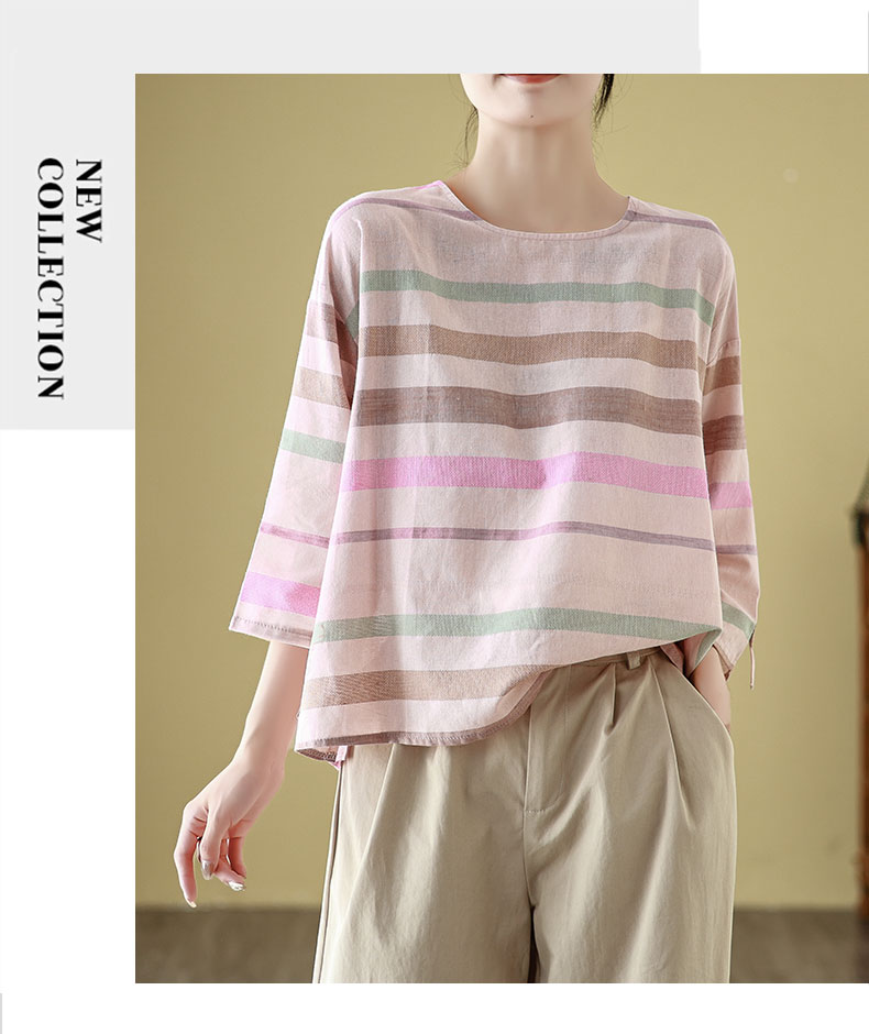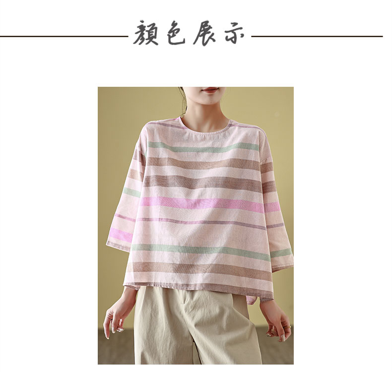 갱신 선적 2025 여름 섹션 유약 핑크색 리넨 면화 가로 줄무늬 문단 라운드 넥 얇고 가벼운 통기성 풀오버 셔츠 티셔츠