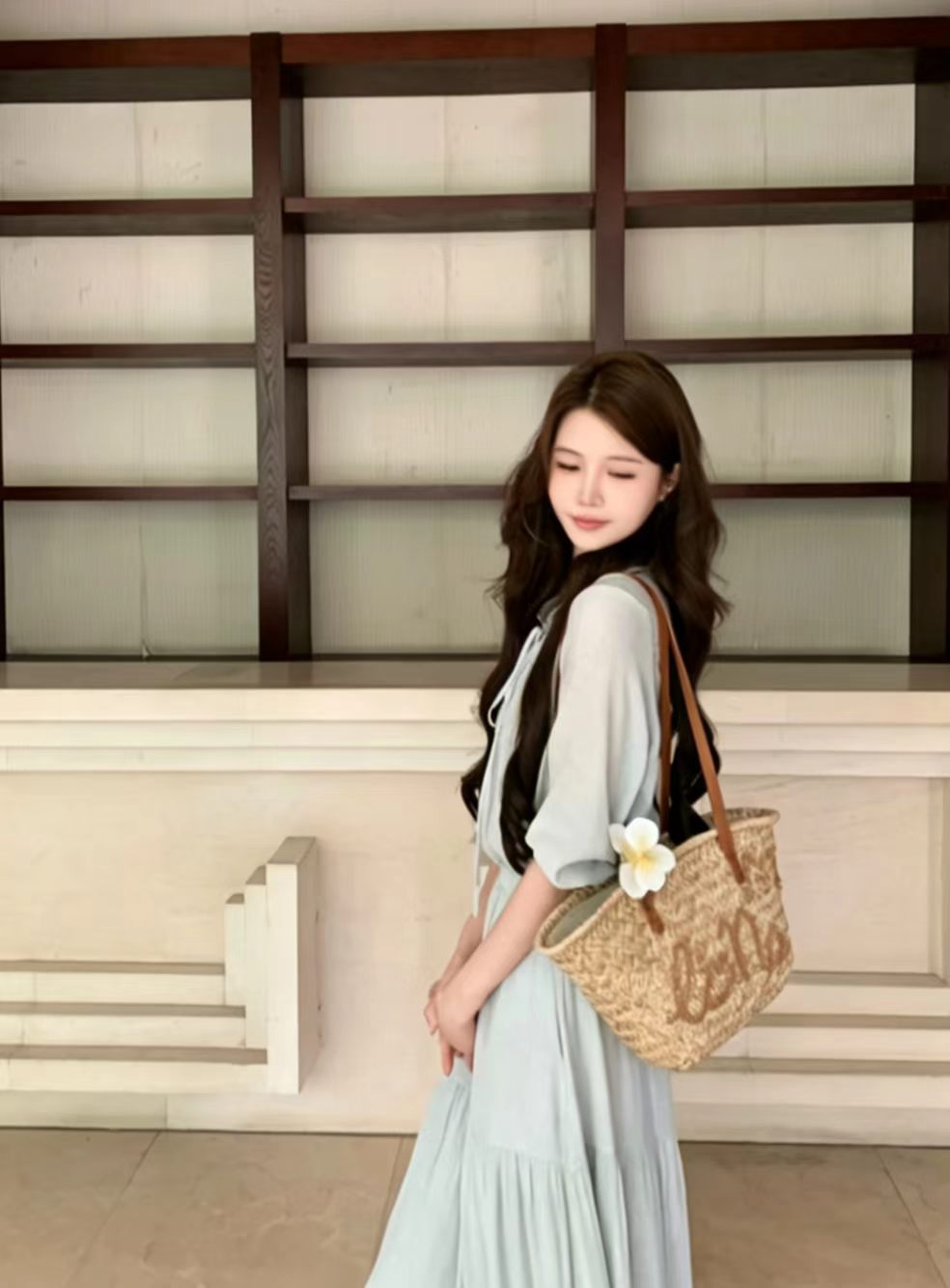 3928 일본식 좋은 제직 면 꽃무늬 셔츠 칼라 드레스 부드러운 품격 루즈핏 가을 어깨 소매 꽃무늬 중간 길이 스커트