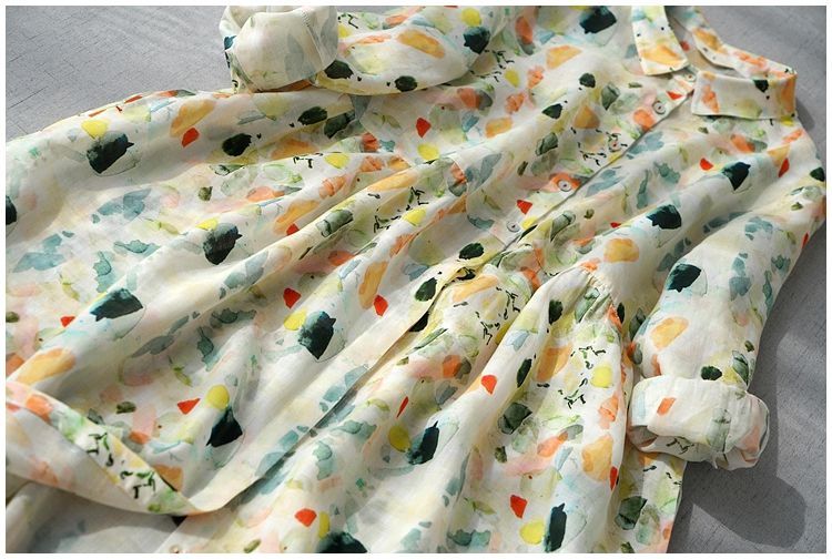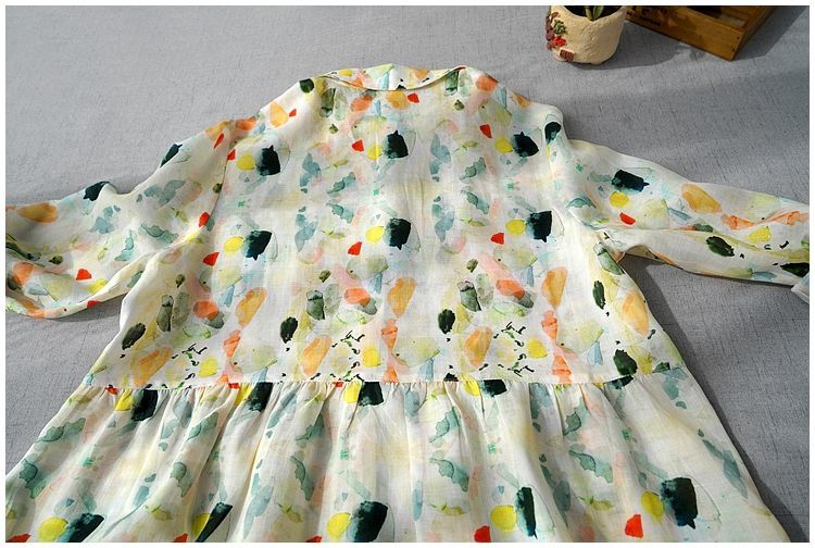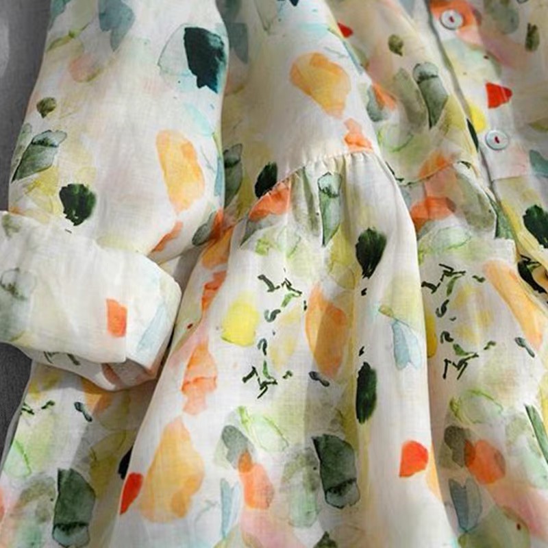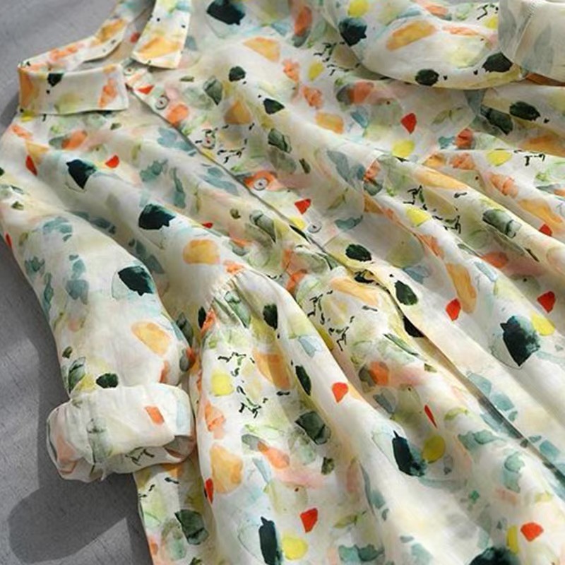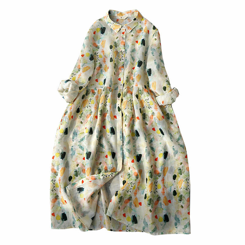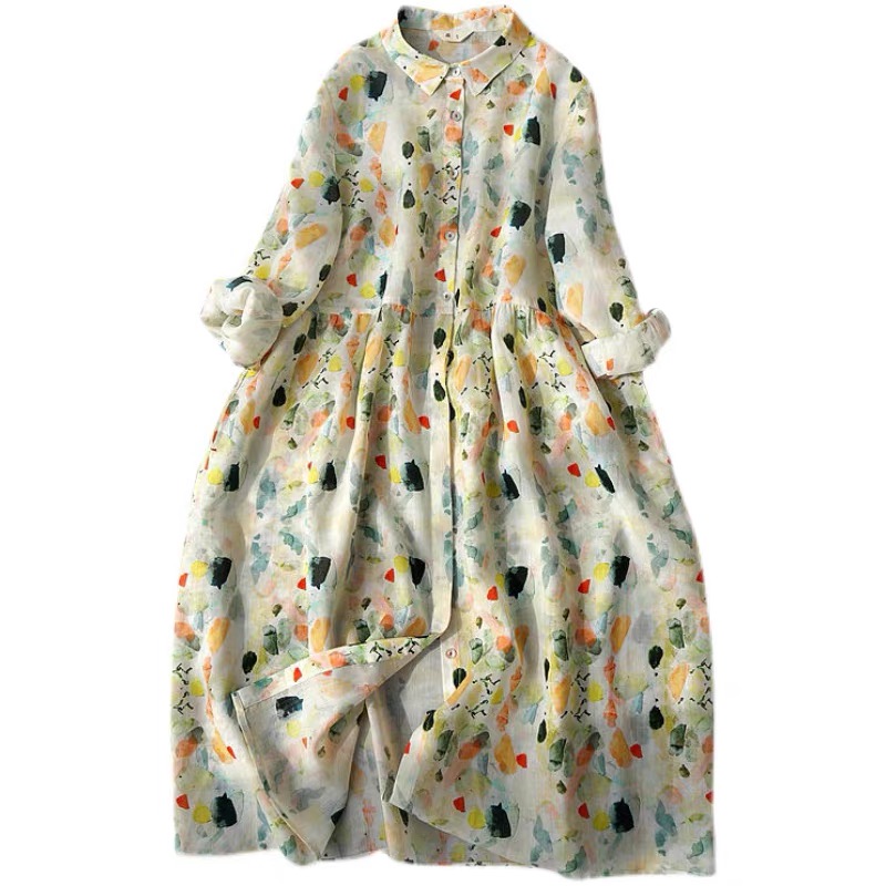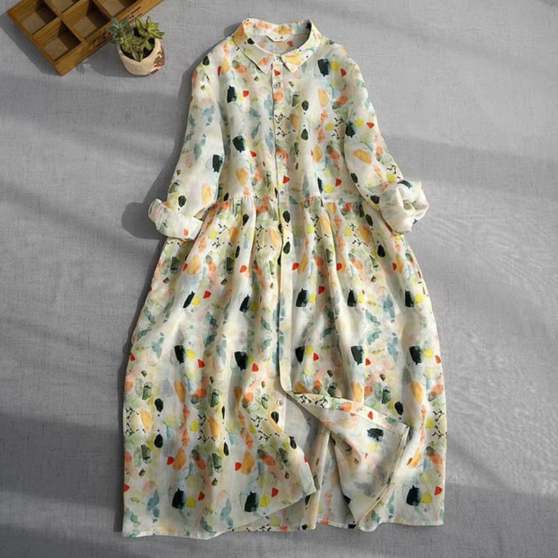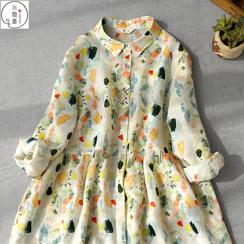 비 실사 봄 드레스 9부 소매 레트로 꽃무늬 드레스 여성 품격 셔츠 칼라 중간 길이 빅 사이즈 치마