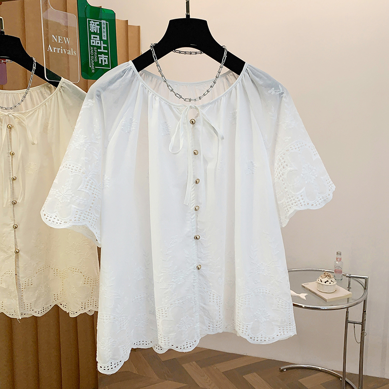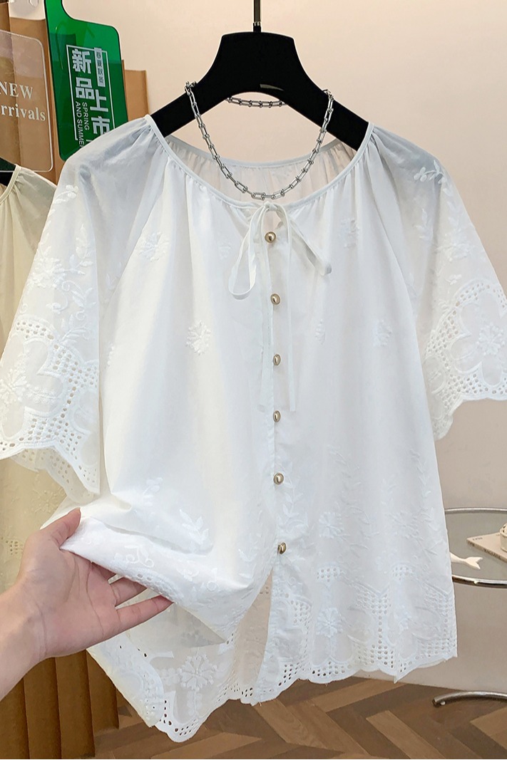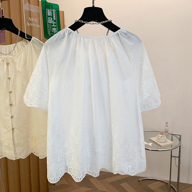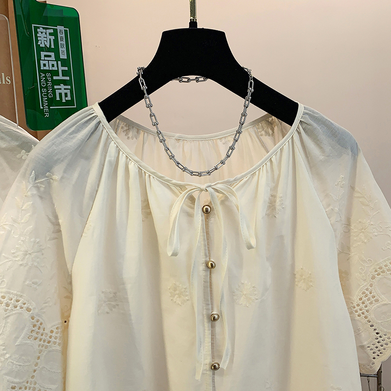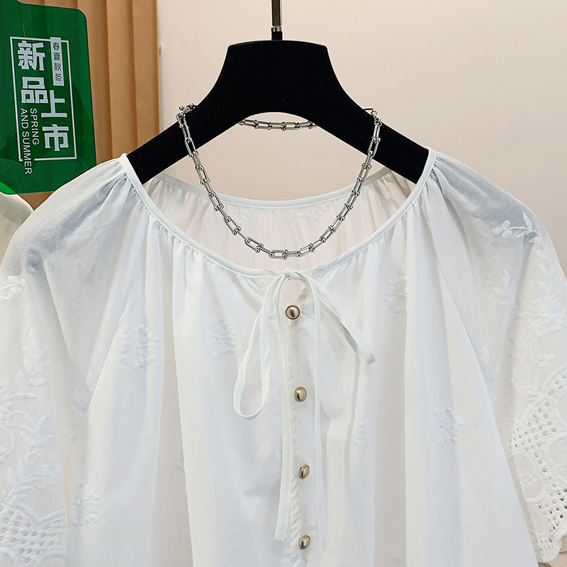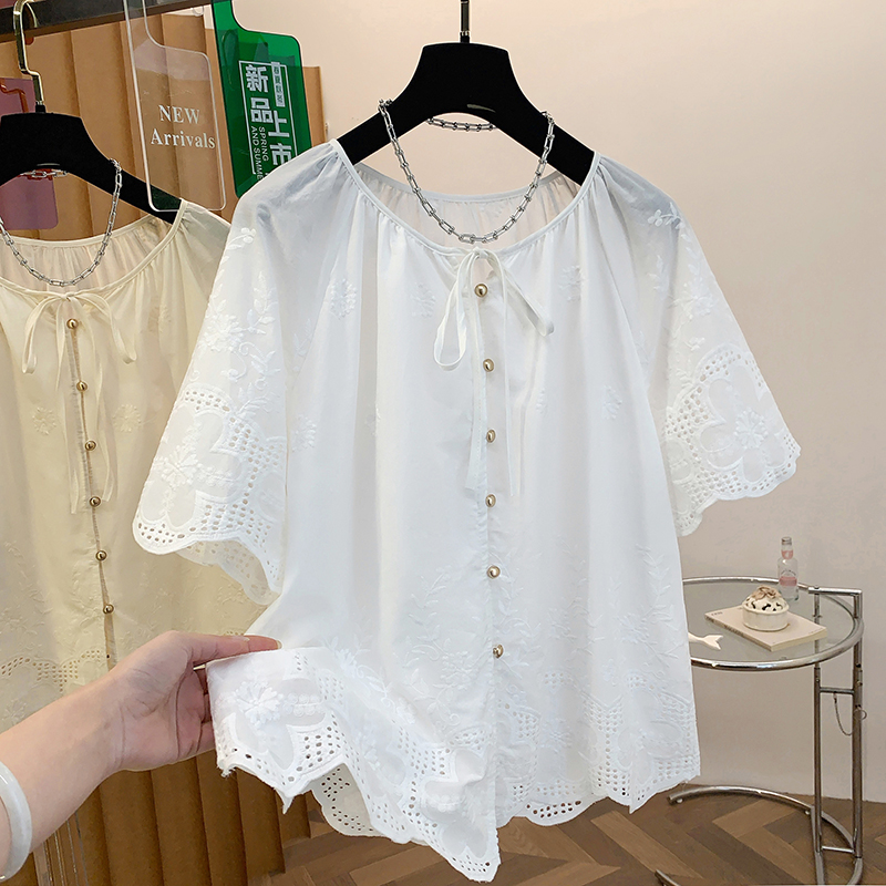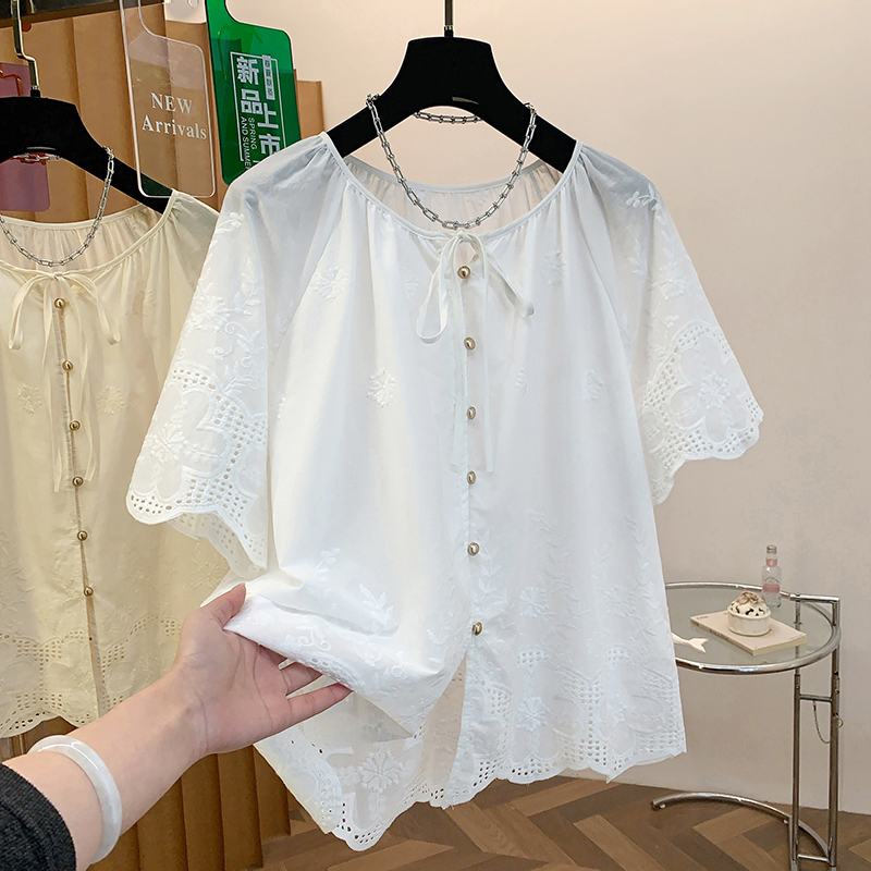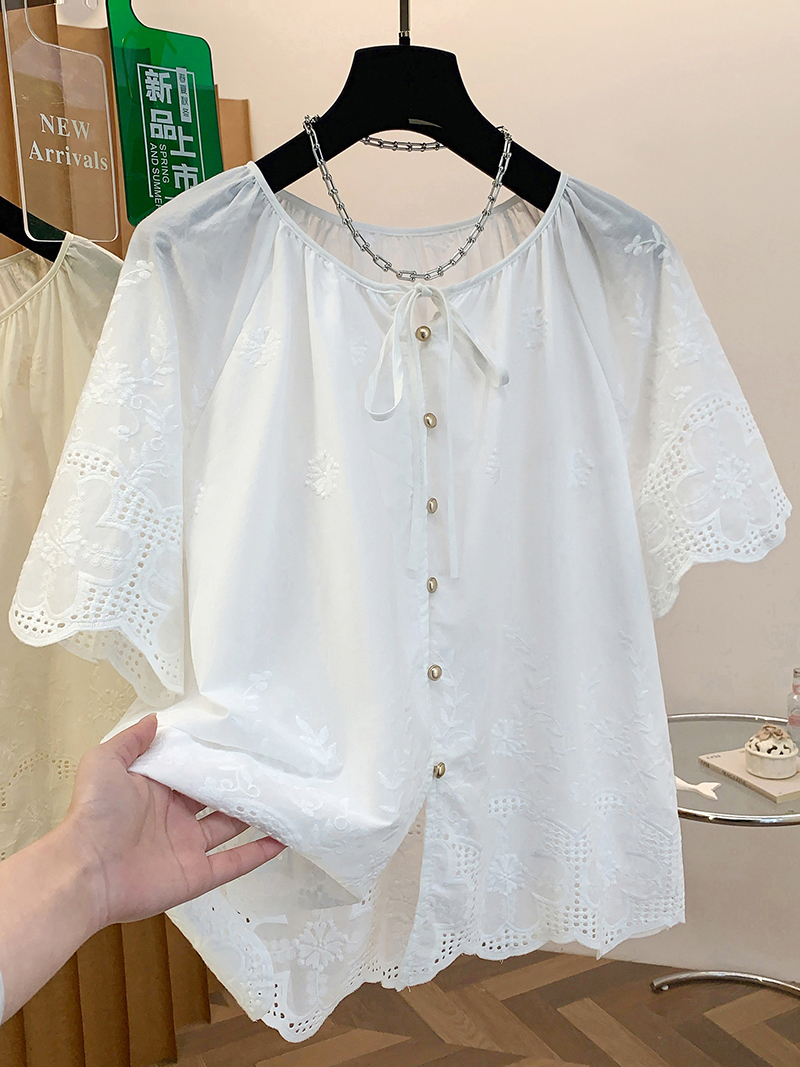 고급 센스 슈퍼 화재 연령 감소 순면 자수 한 부서 프릴 라운드 넥 반팔 여성 셔츠 여름 작은 셔츠 맨위 얇은