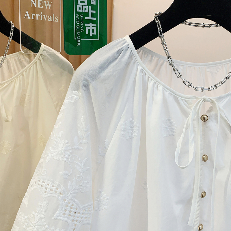 레트로 자수 화이트 거품 소매 여성 셔츠 2026 새로운 루즈핏 5 점 소매 외국 가스 작은 셔츠 벌룬 소매 맨위