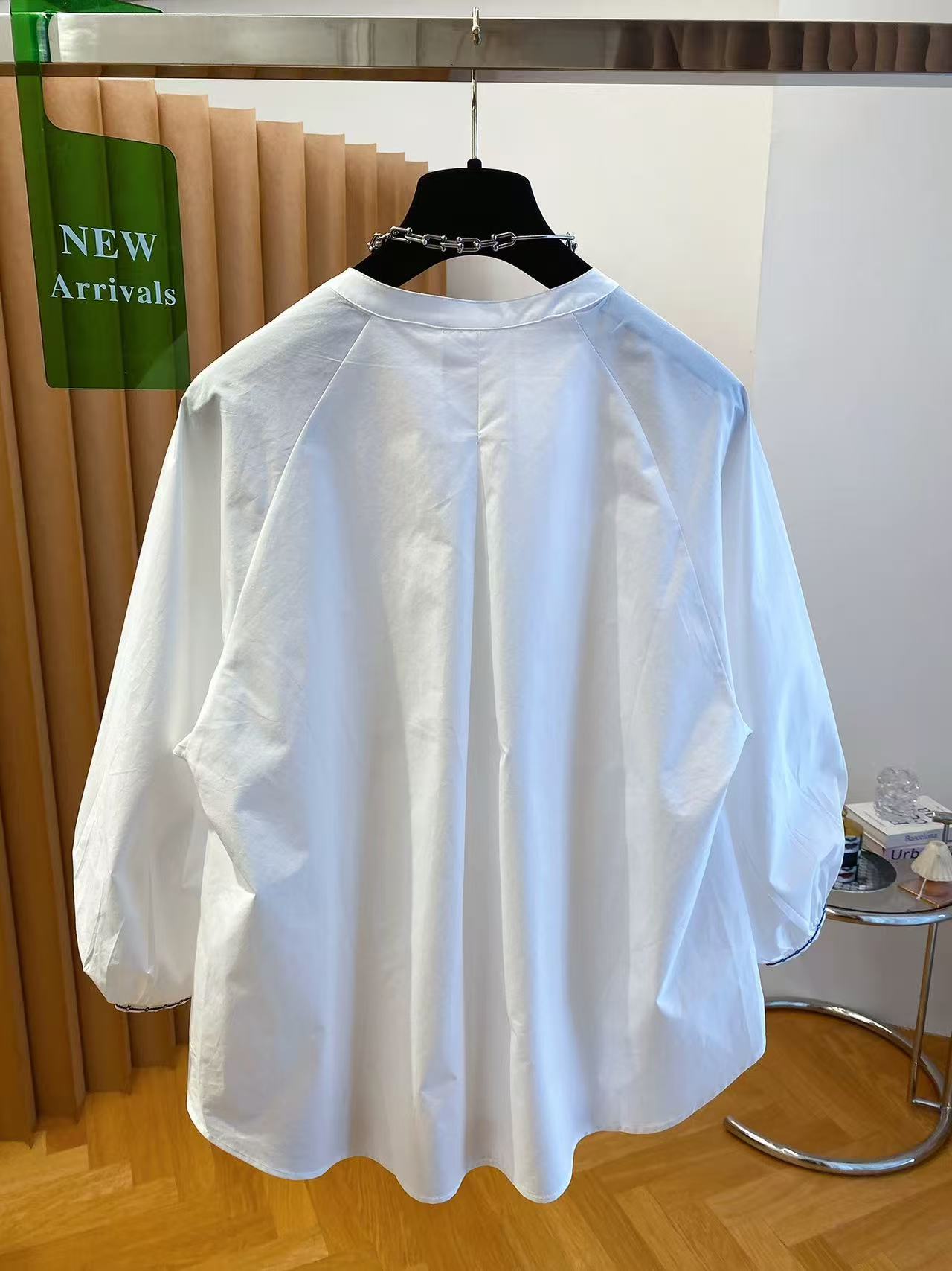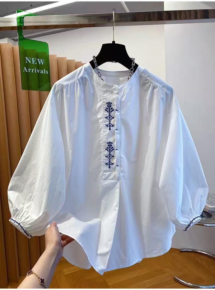 레트로 자수 화이트 거품 소매 여성 셔츠 2026 새로운 루즈핏 5 점 소매 외국 가스 작은 셔츠 벌룬 소매 맨위
