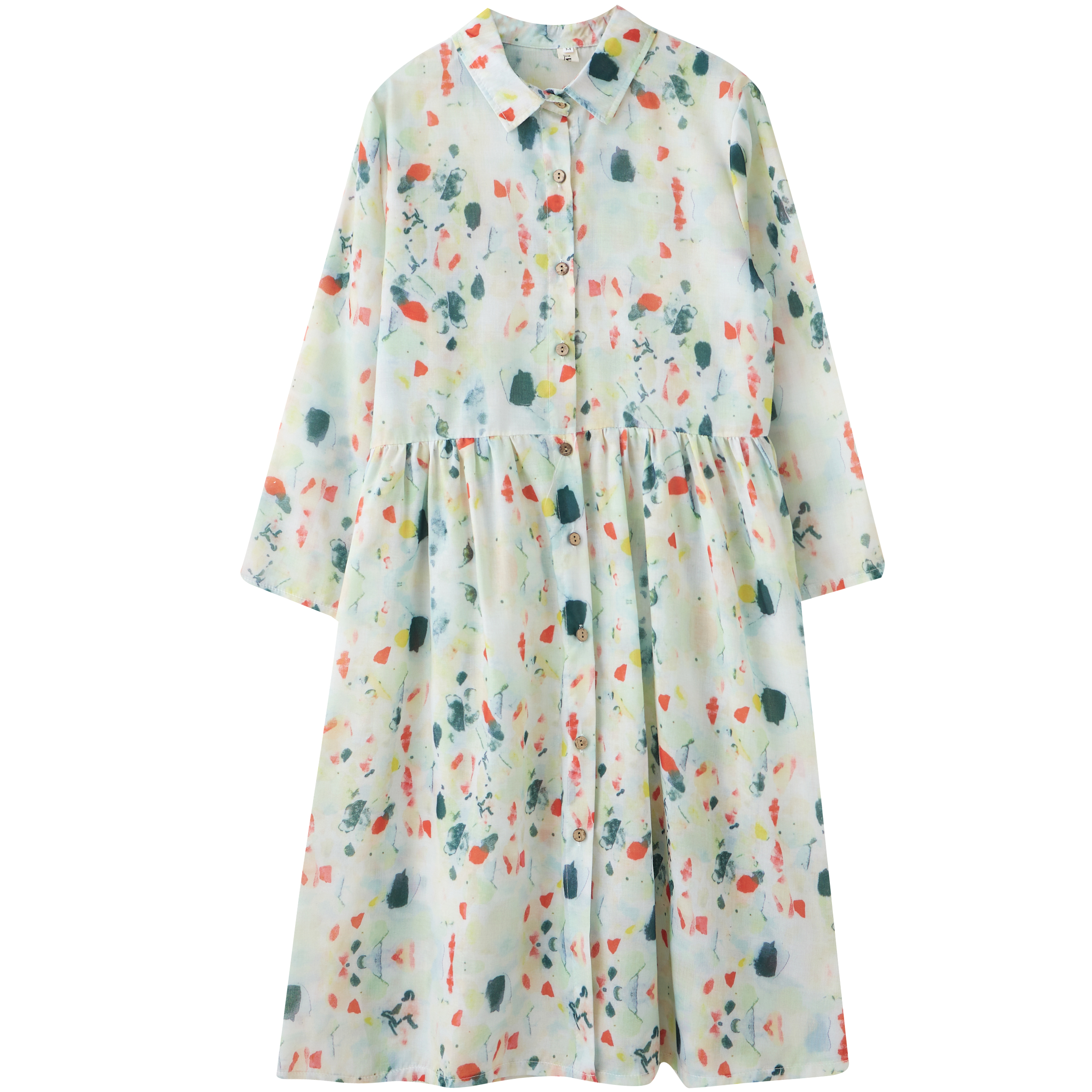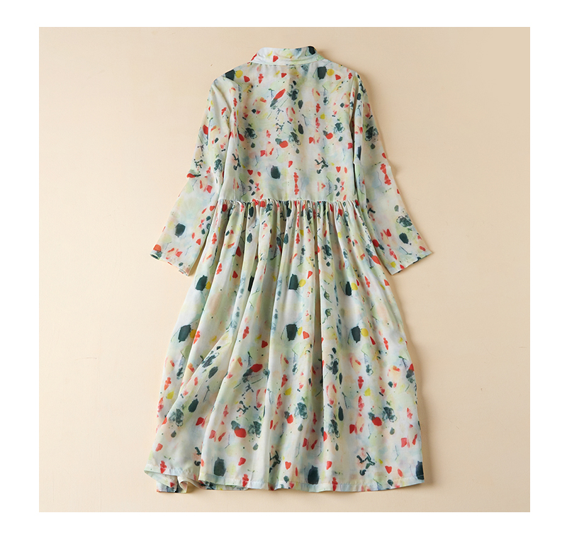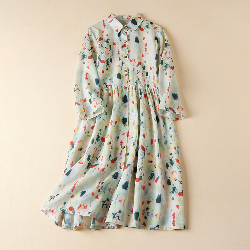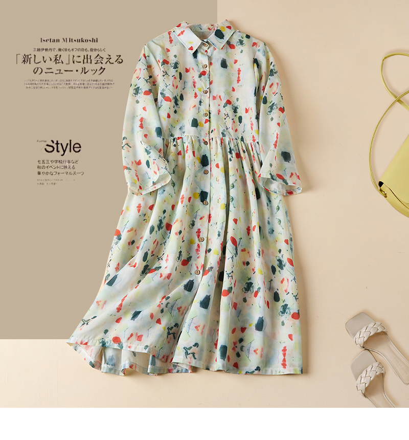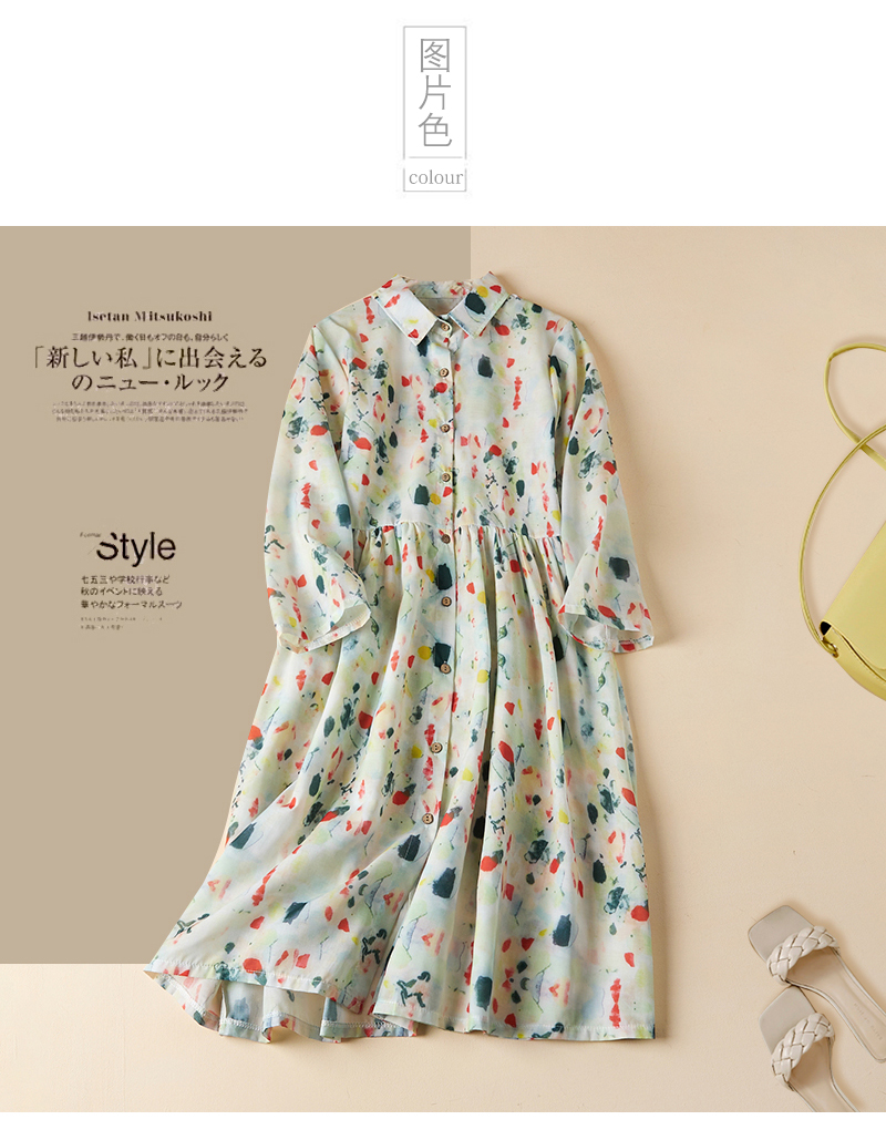 실사 봄 드레스 9부 소매 레트로 꽃무늬 드레스 여성 품격 셔츠 칼라 중간 길이 빅 사이즈 치마