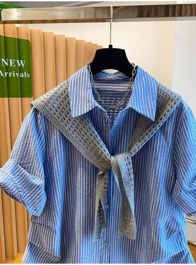 한 부서 스트라이프 셔츠 여성용 짧은 소매 코디 숄 투피스 세트 맨위 2026 새로운 여름 올해 인기 셔츠