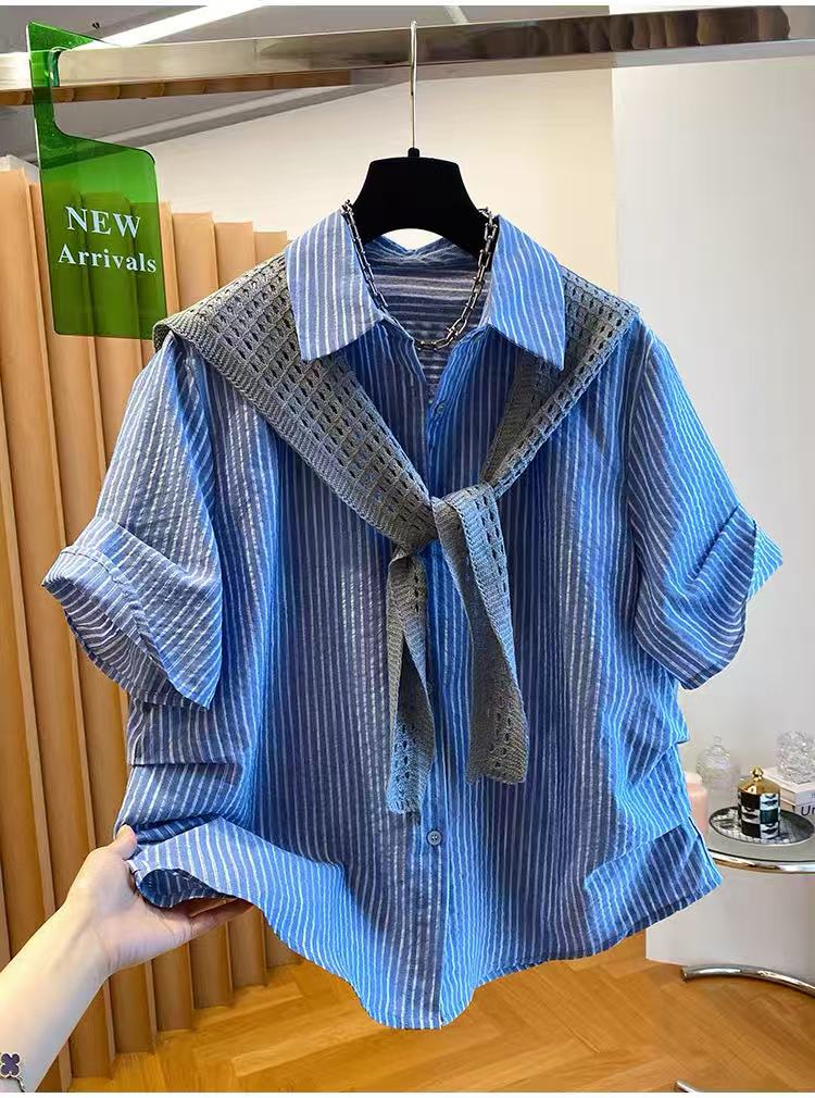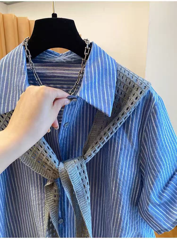 고급 센스 숄 셔츠 여성용 짧은 소매 2026 새로운 루즈핏 연령 감소 외국 가스 슈퍼 잘 생긴 파란색 스트라이프 셔츠 여름