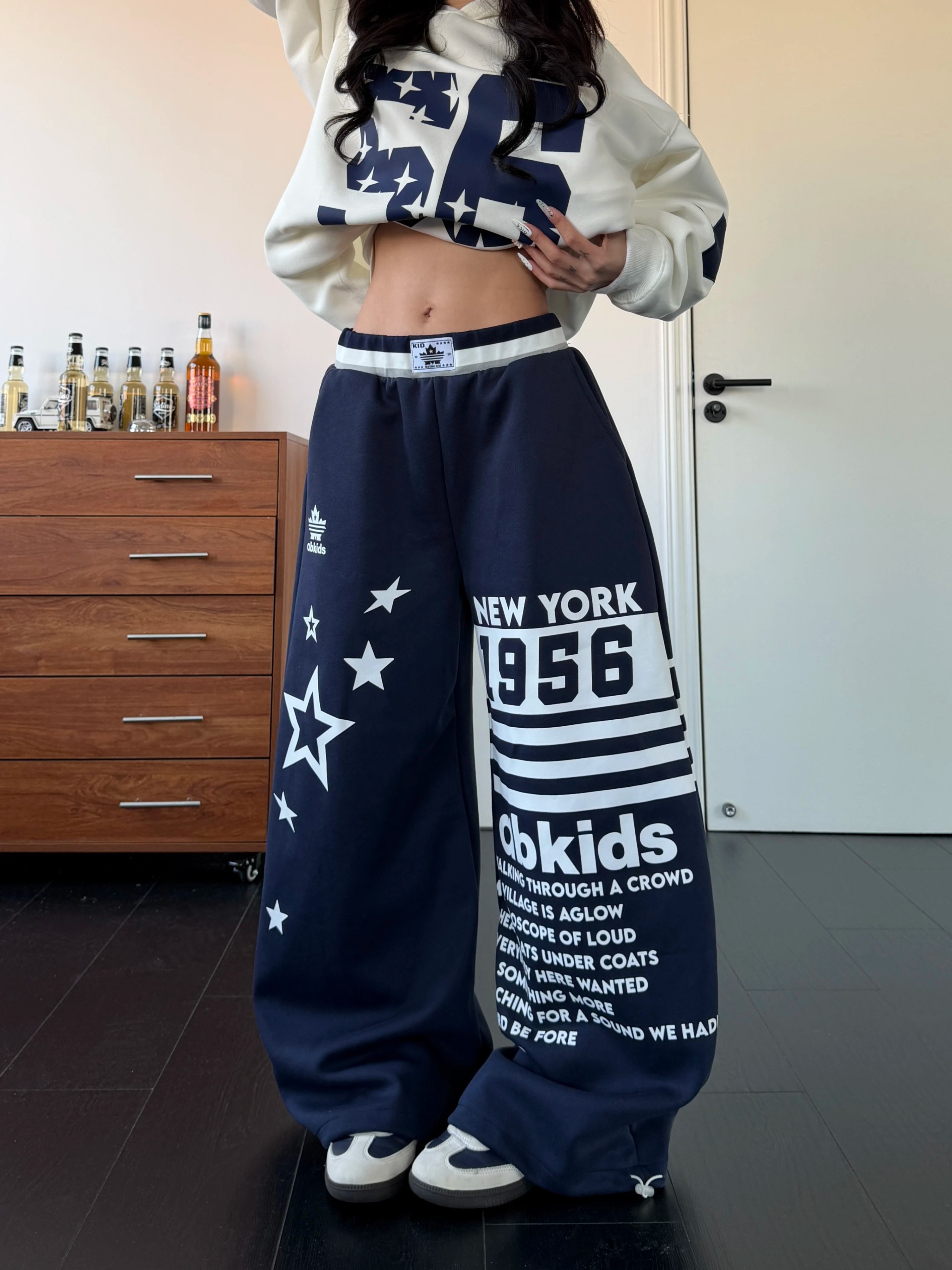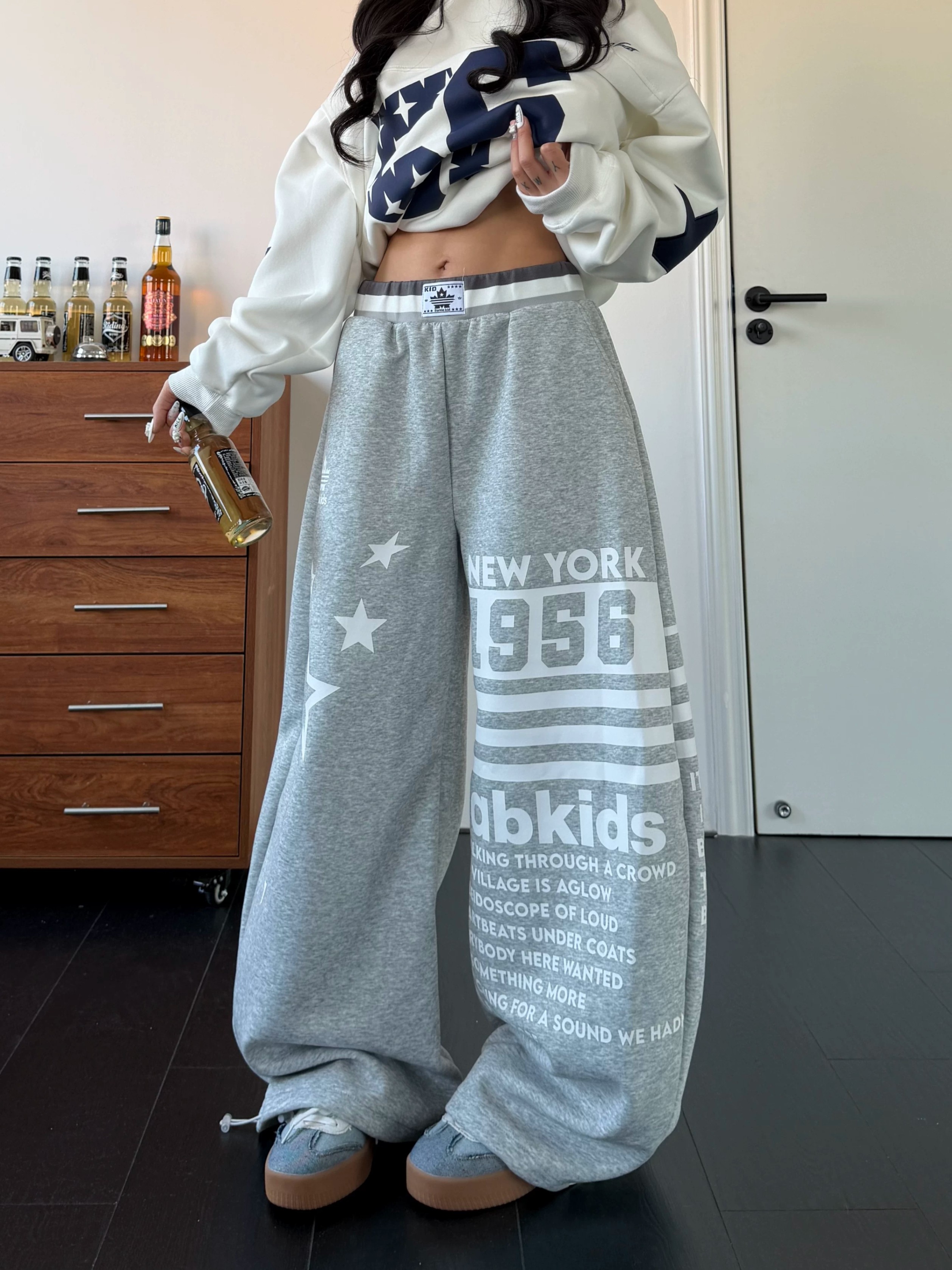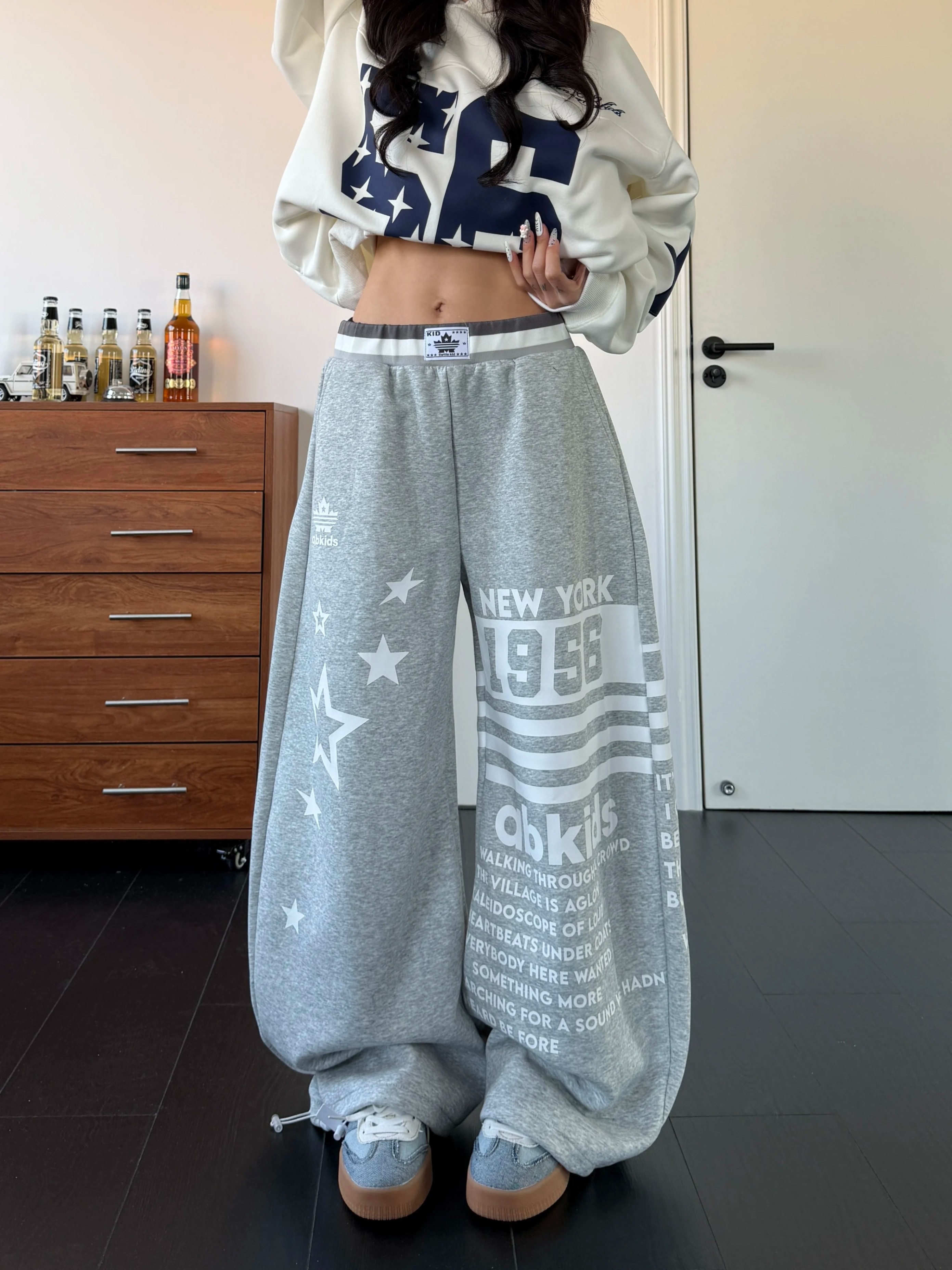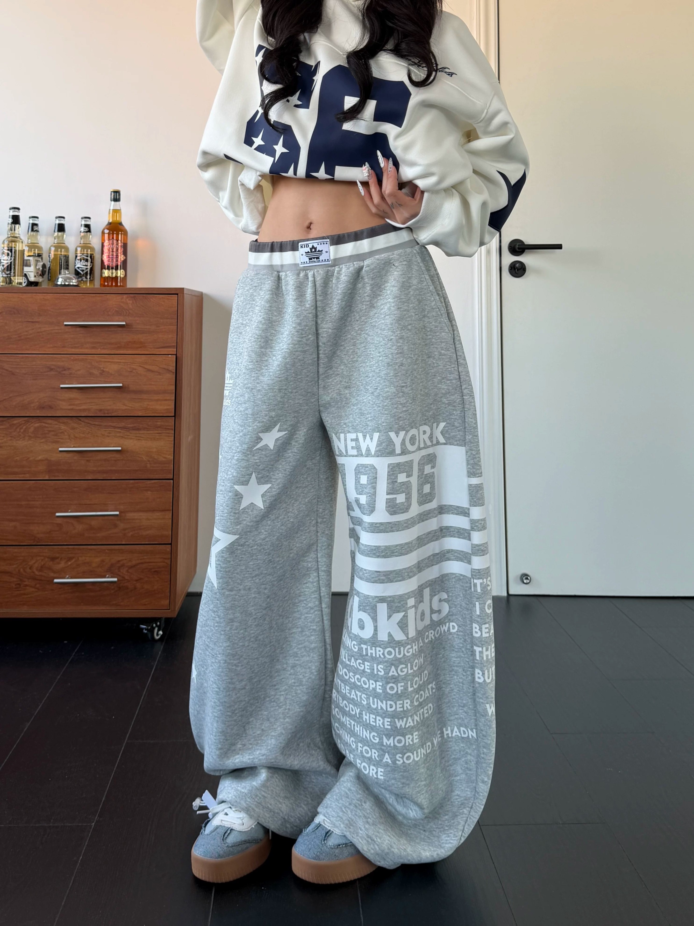 아메리칸 레트로 숫자 알파벳 오각형 별 프린트 더블 허리 머리 캐주얼 바지 여성 루즈핏 스트리트 댄스 넓은 다리 길이 바지 트렌디