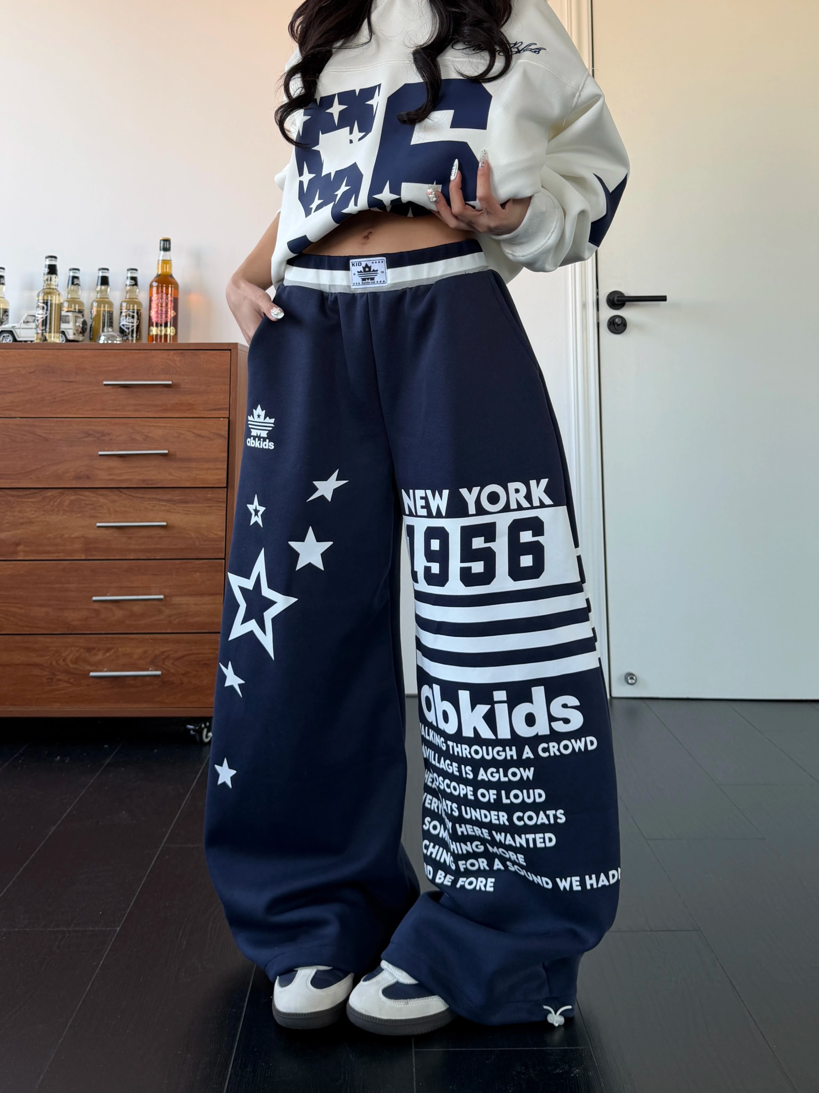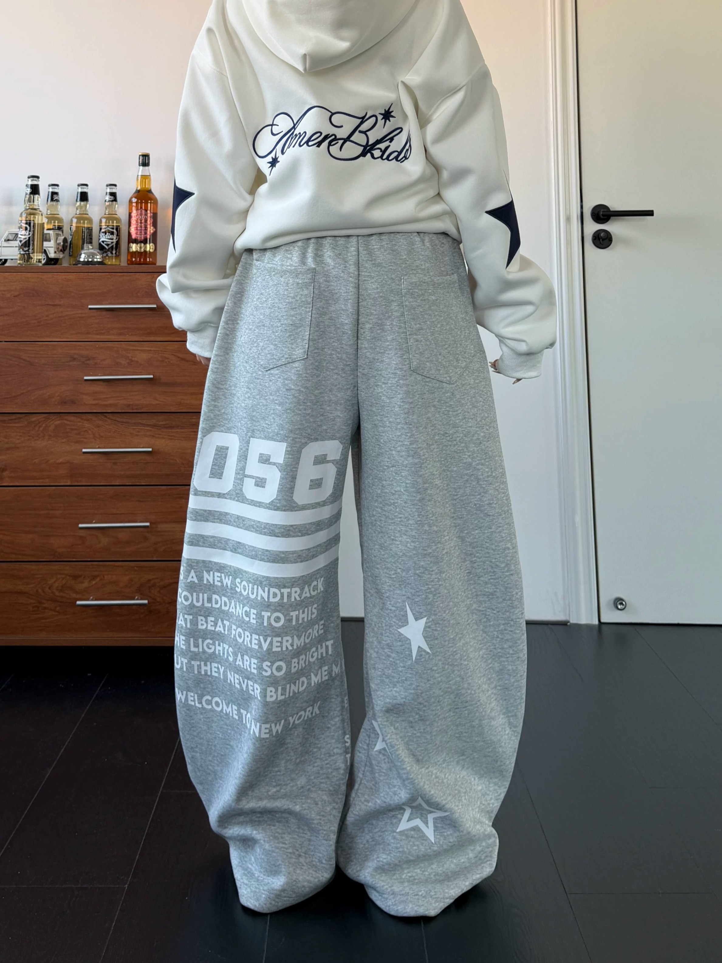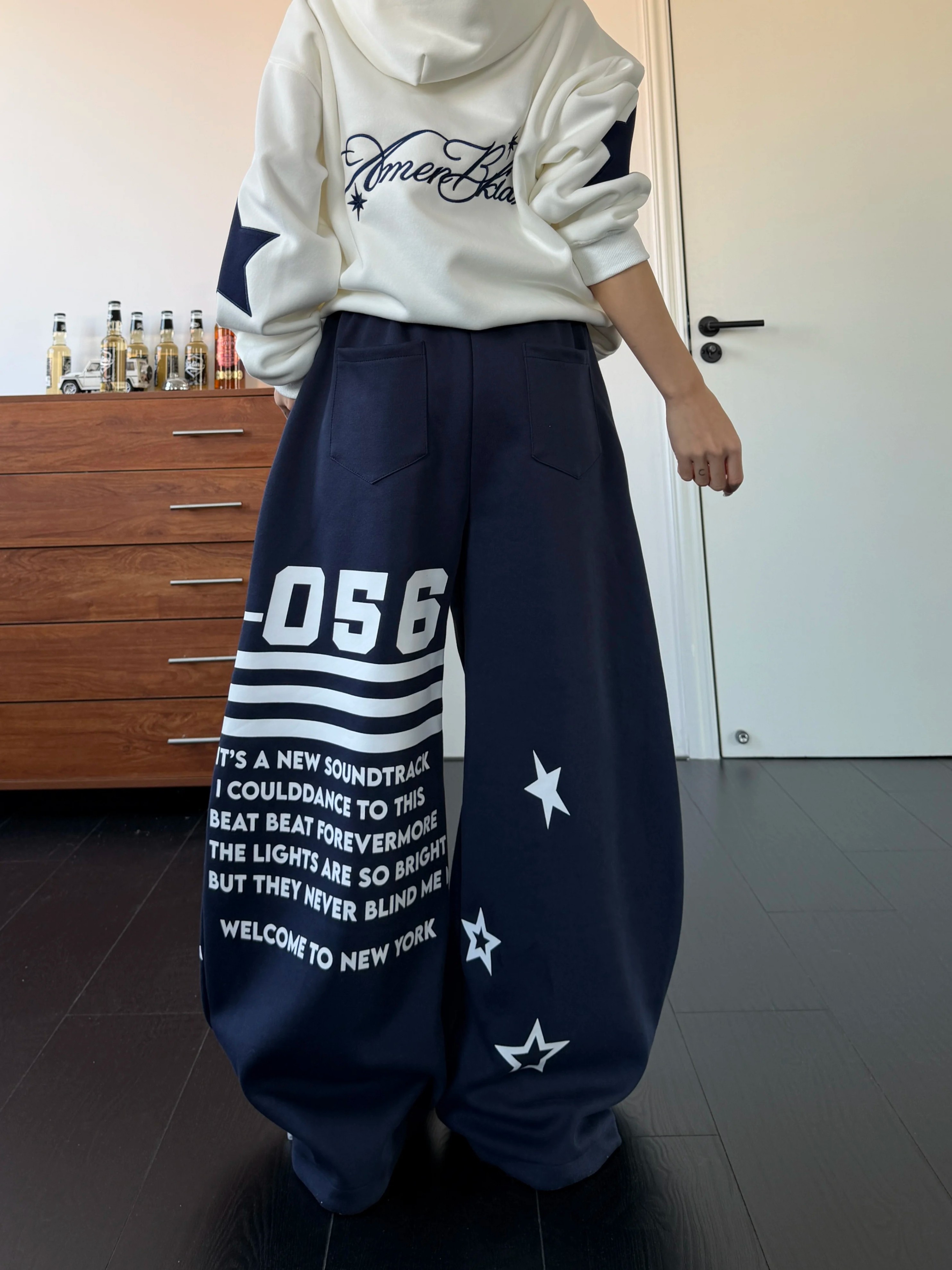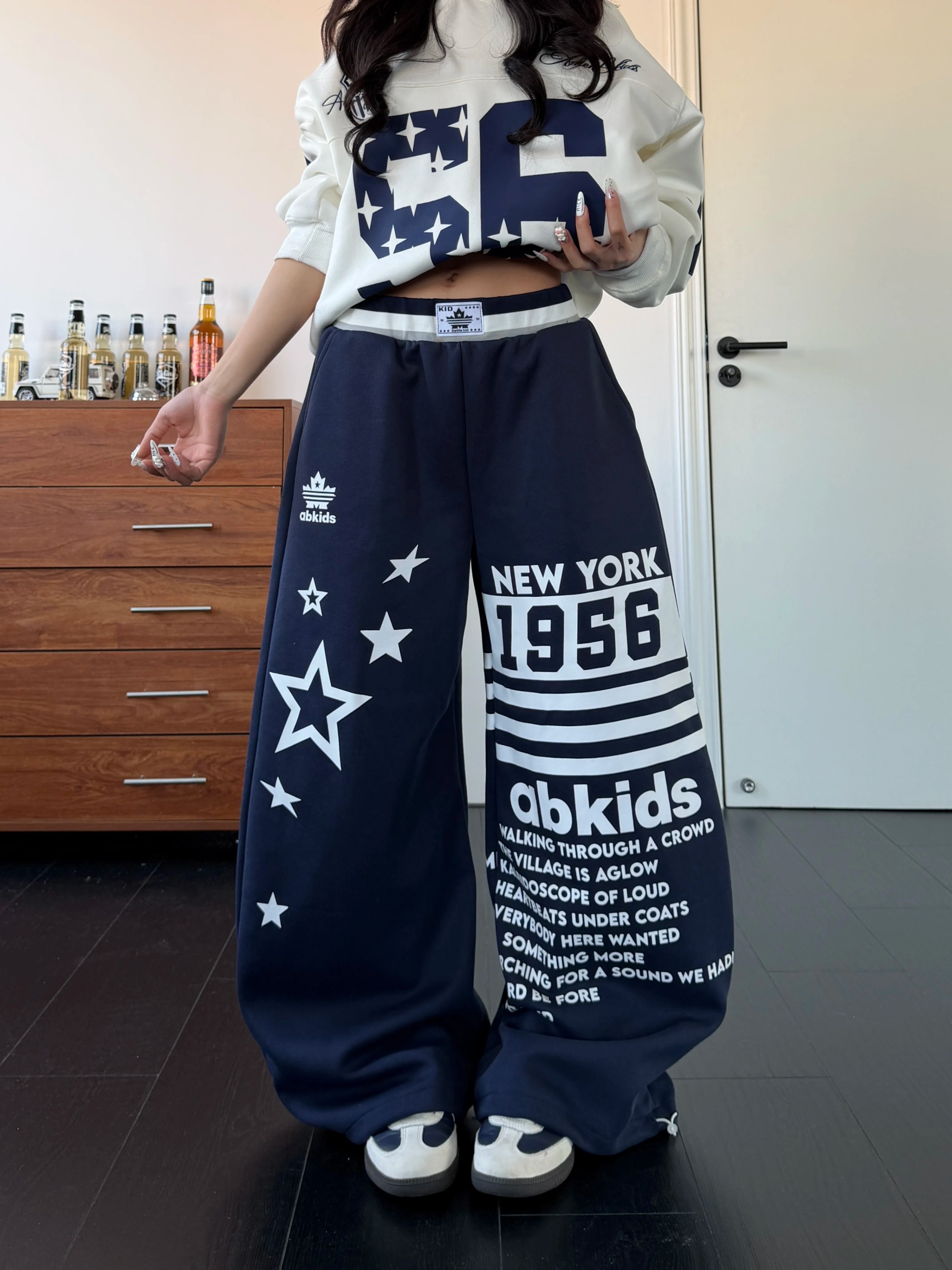 아메리칸 레트로 숫자 알파벳 오각형 별 프린트 더블 허리 머리 캐주얼 바지 여성 루즈핏 스트리트 댄스 넓은 다리 길이 바지 트렌디