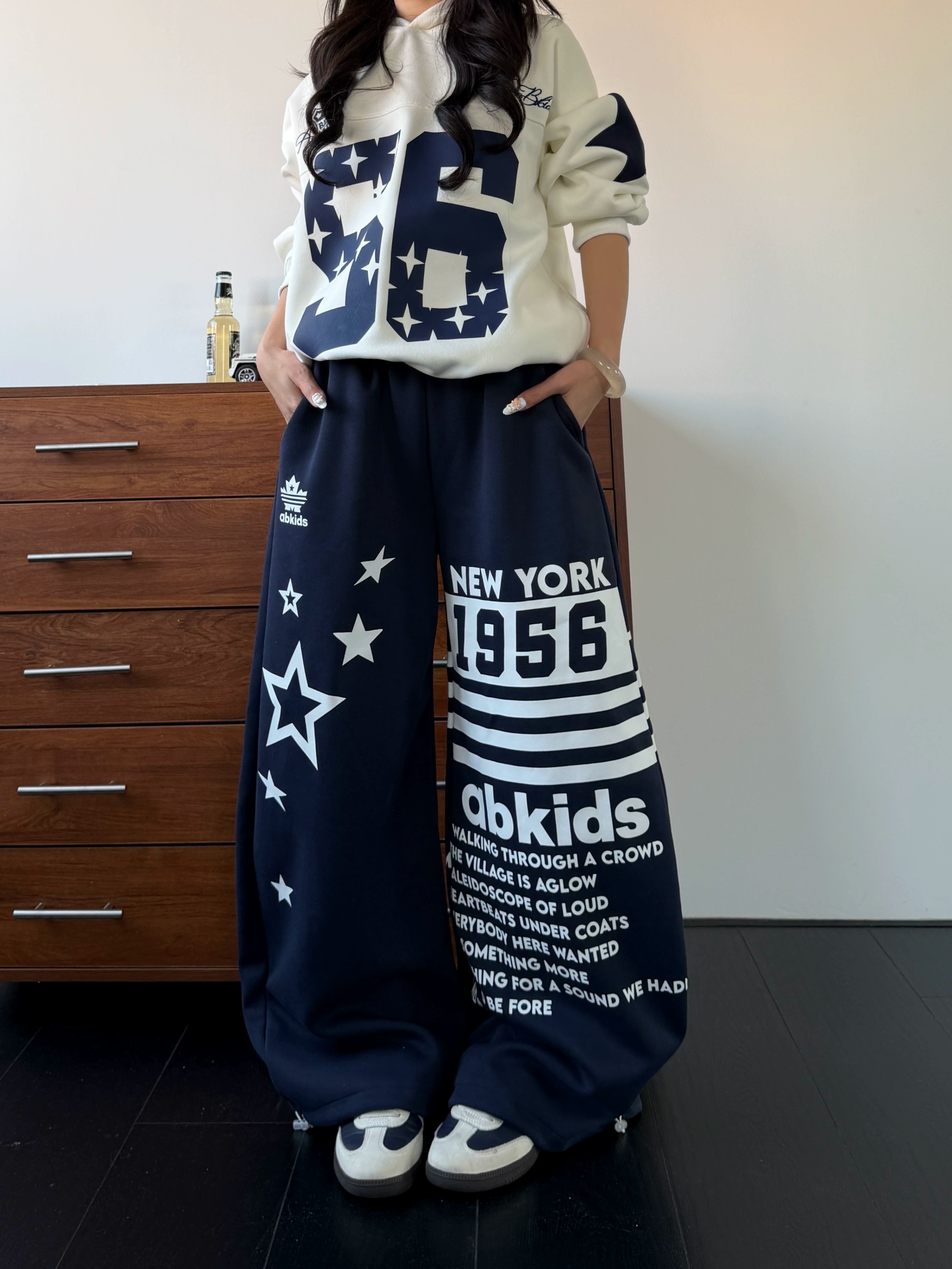 아메리칸 알파벳 배너 프린트 운동 웨이 바지 여성 루즈핏 느긋한 도루 센스 다용도 넓은 다리 스트레이트 캐주얼 바지
