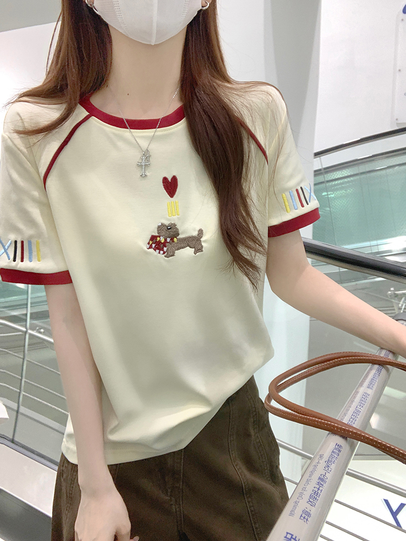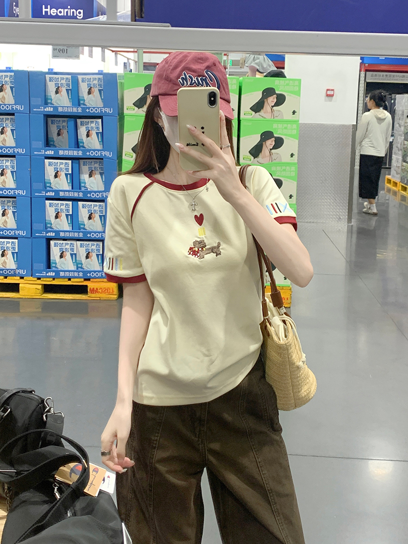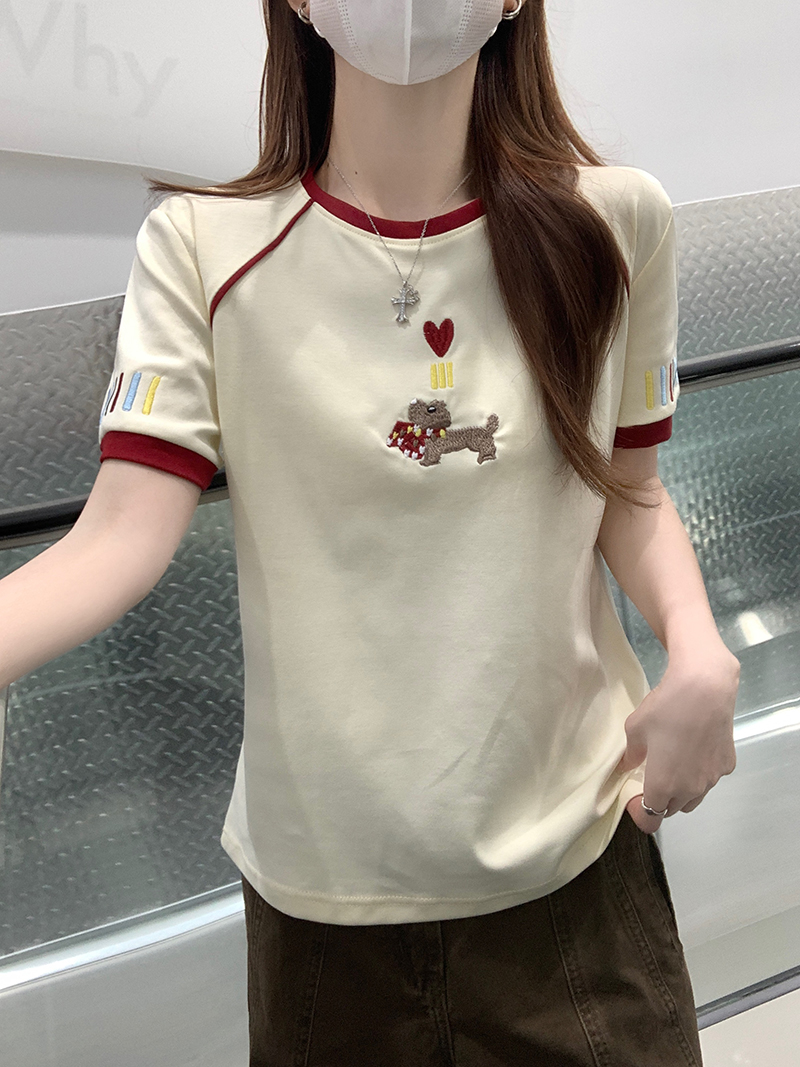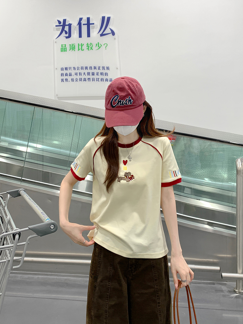 실사 특별 가격 220 그램 물 부드러운 면 양면 반팔 티셔츠 여름 한 부서 새로운 배색 자수 라운드 넥 맨위 여성 의류
