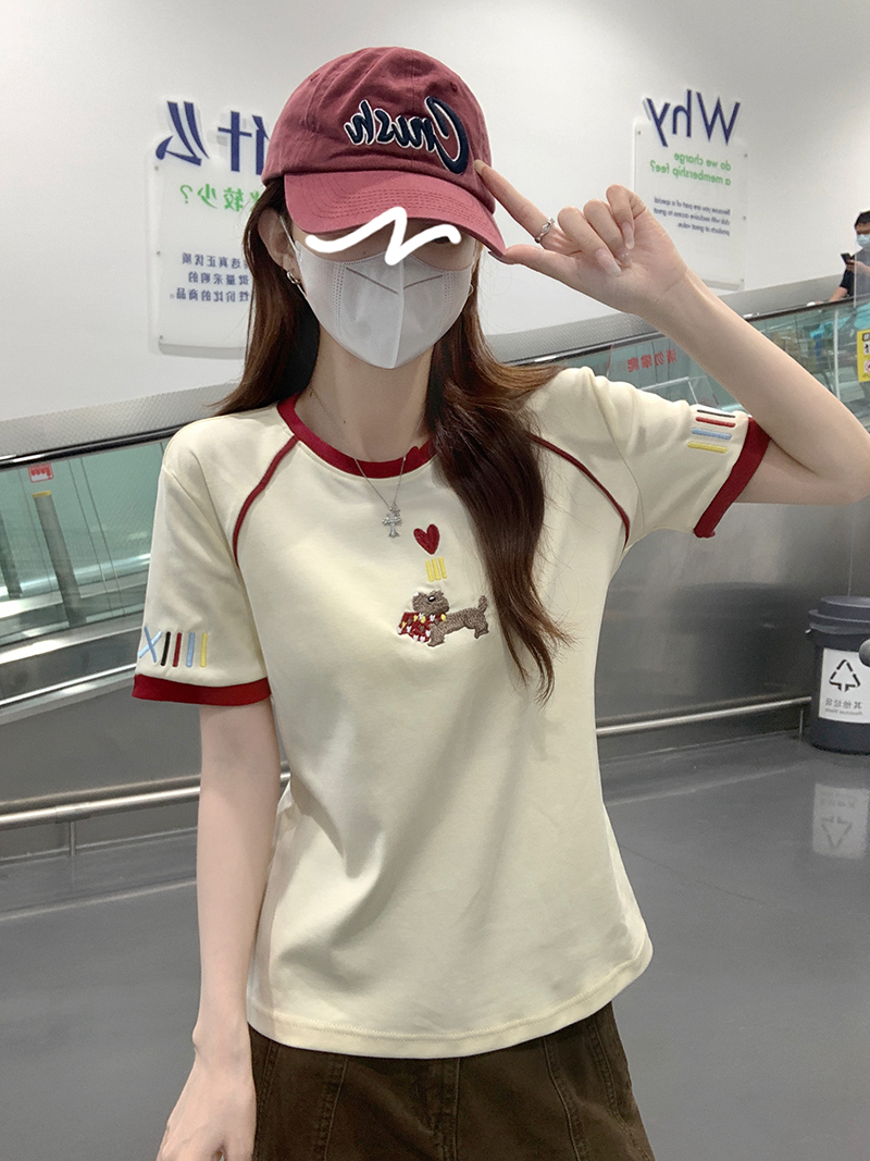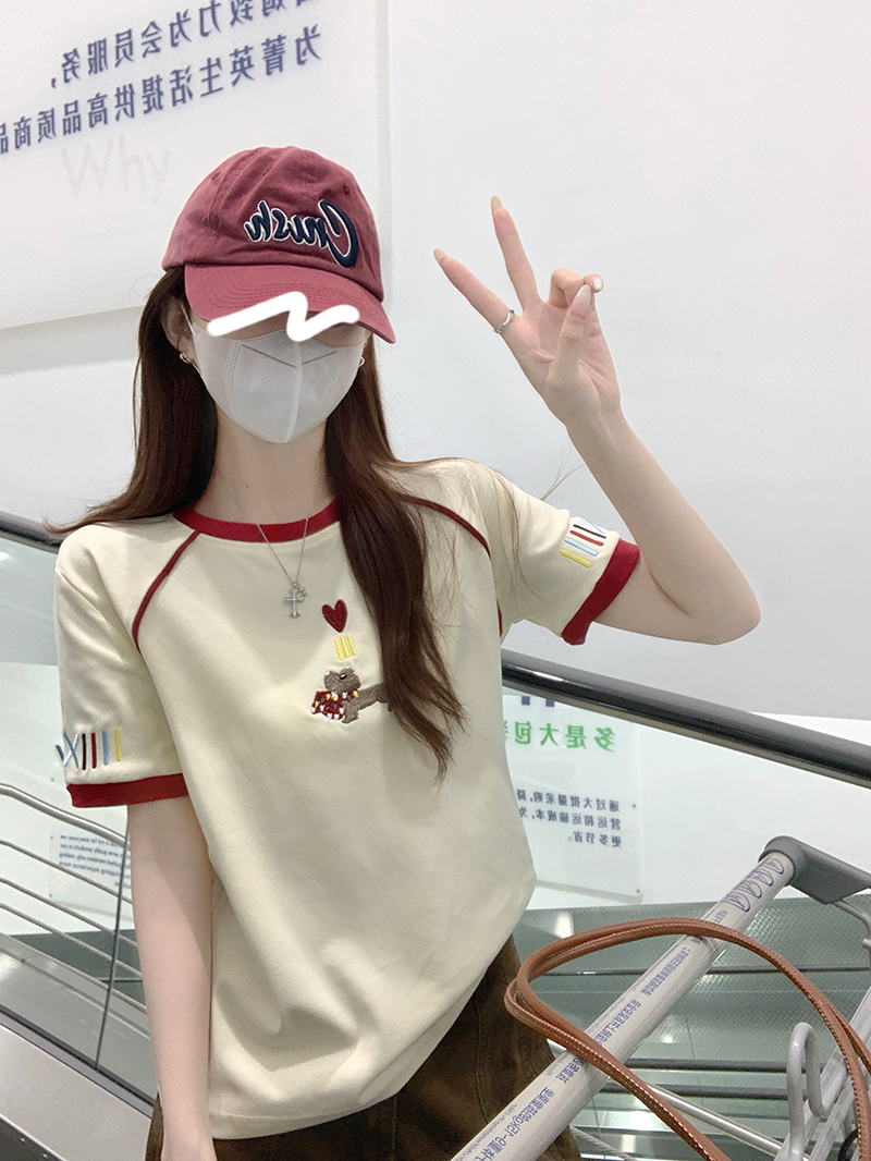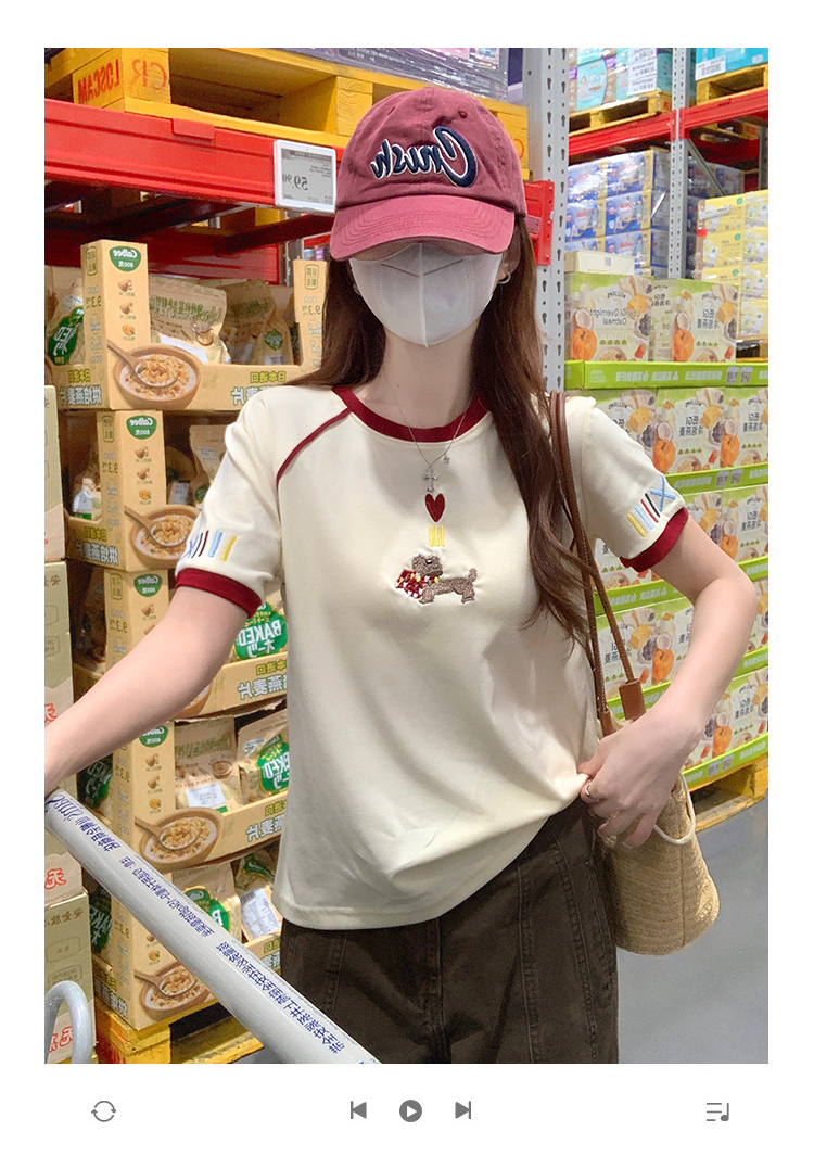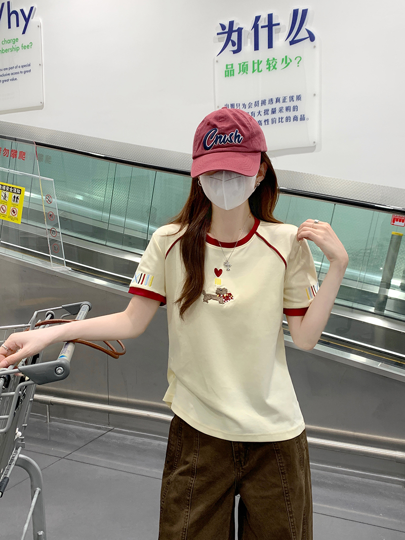 실사 특별 가격 220 그램 물 부드러운 면 양면 반팔 티셔츠 여름 한 부서 새로운 배색 자수 라운드 넥 맨위 여성 의류