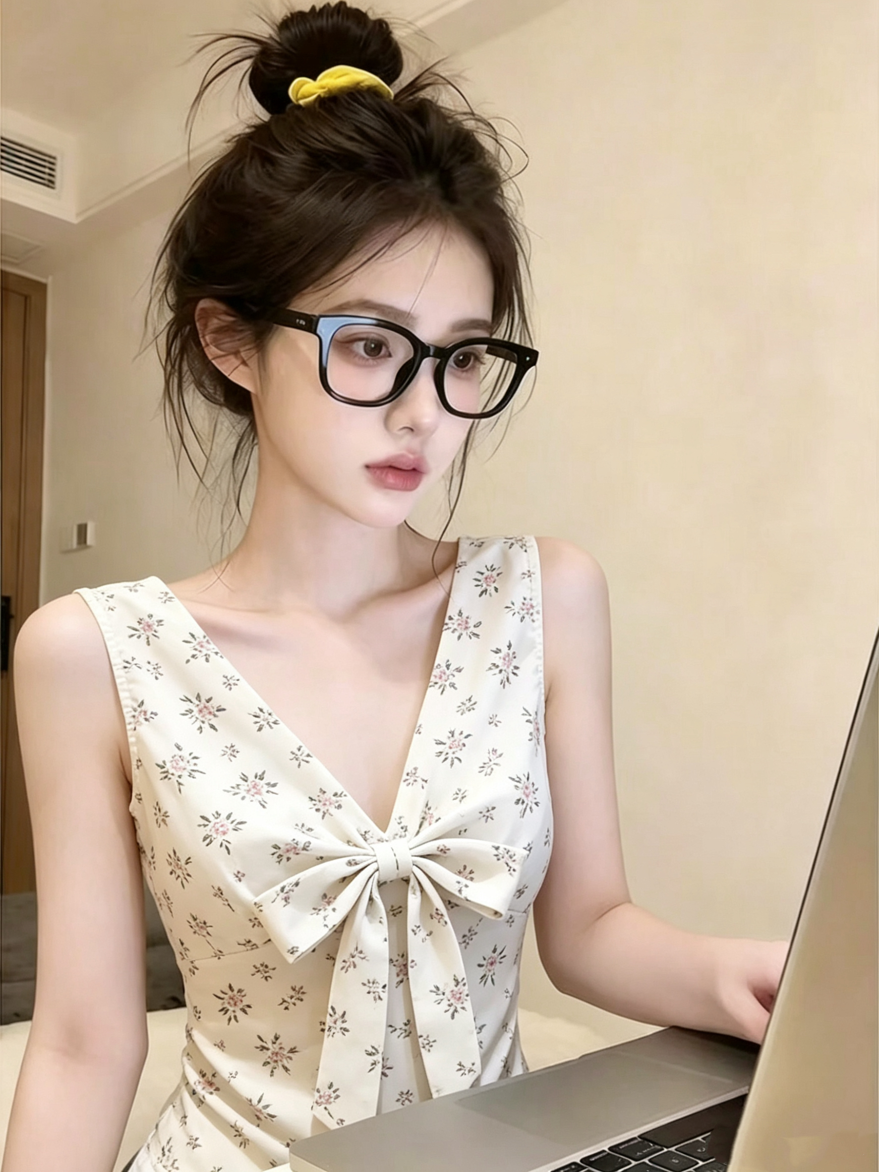 프랑스식 부드러운 바람 나비 매듭 꽃무늬 V넥 민소매 조끼 여성 여름 새로운 슬림해 보이는 핫걸 다용도 맨위 트렌디