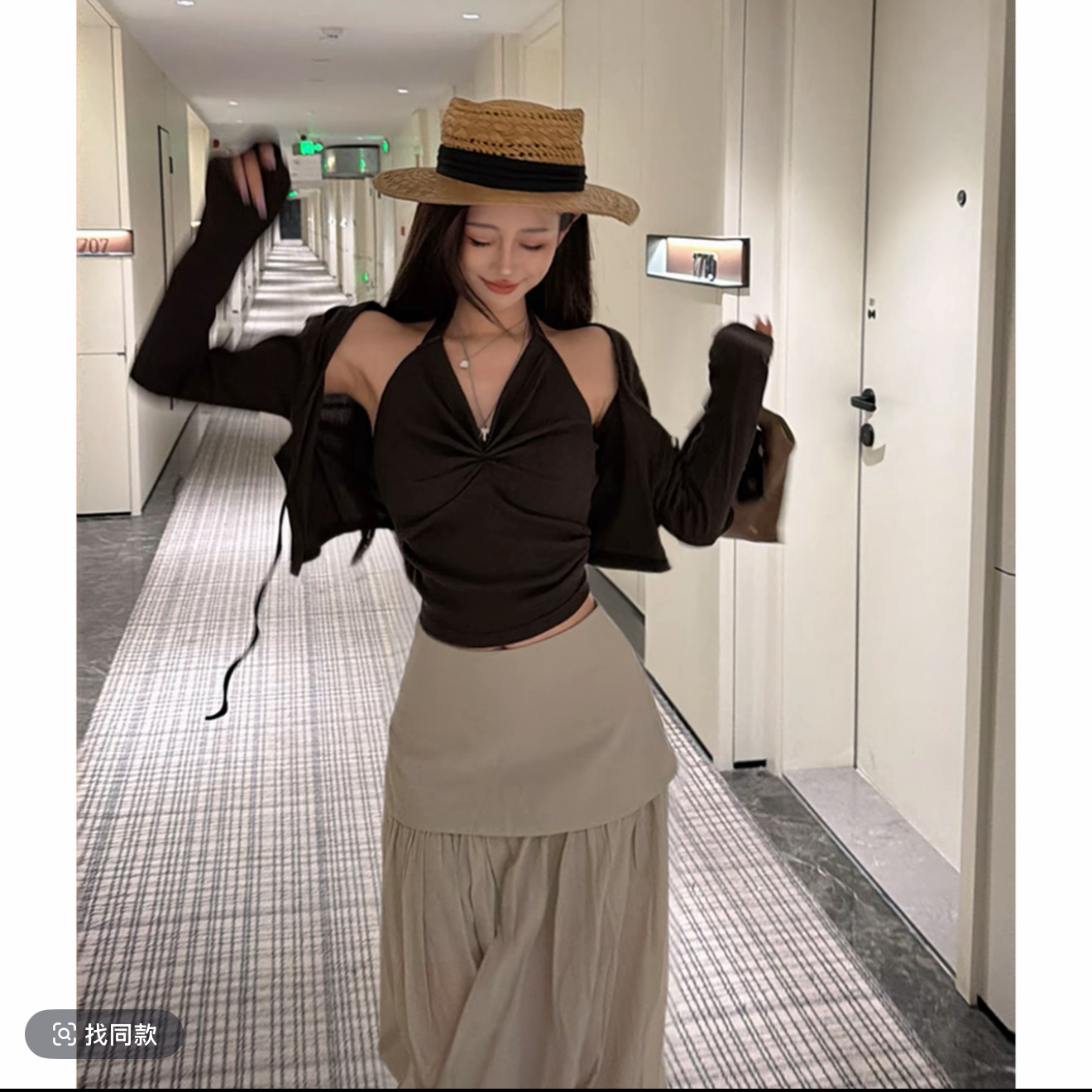 21degrees 깊은 커피 색상 행침 목 오픈 가디건 투피스 세트 얕은 카키 방귀 커튼 큰 진자 롱 코트 반신 스커트