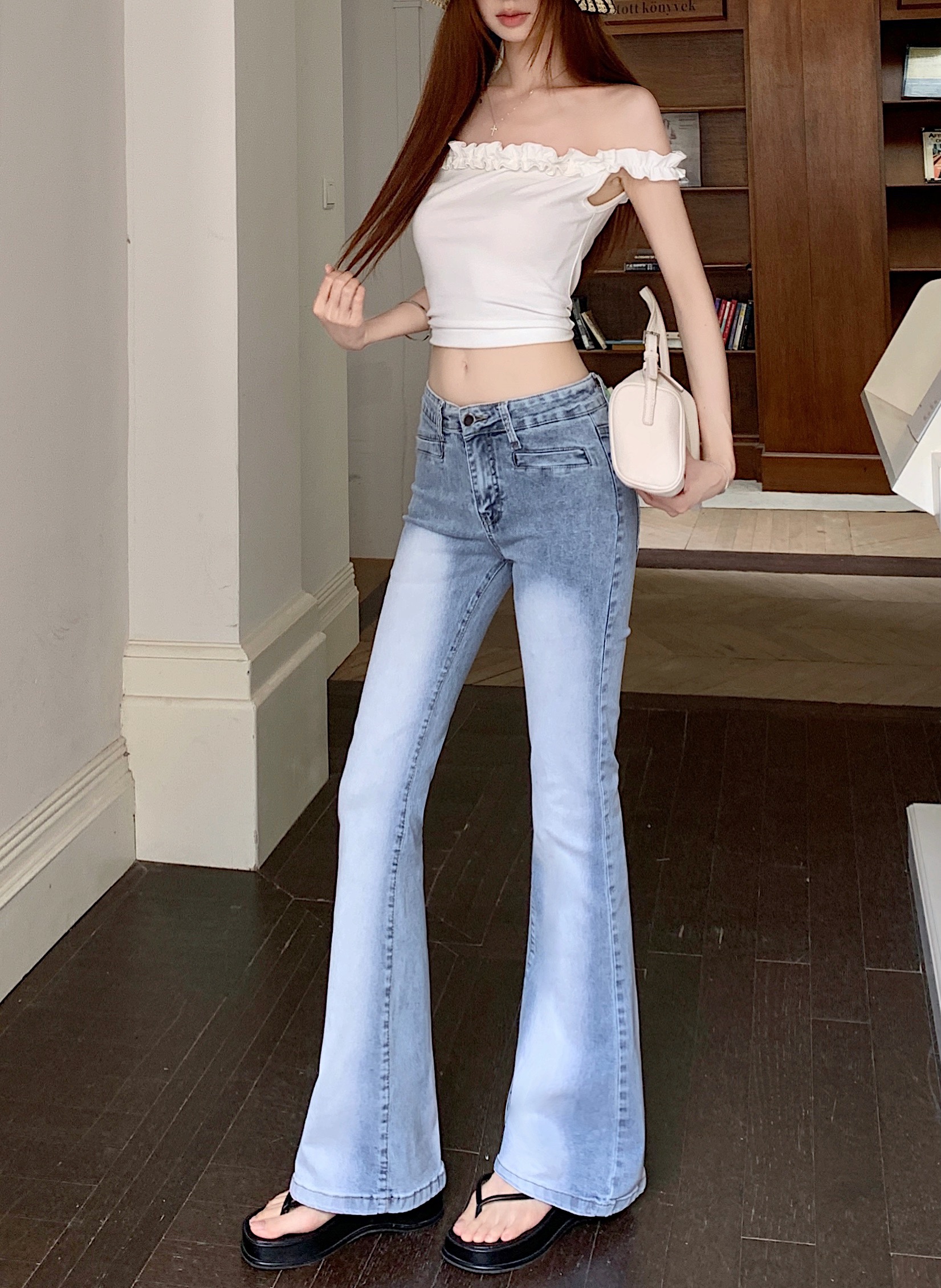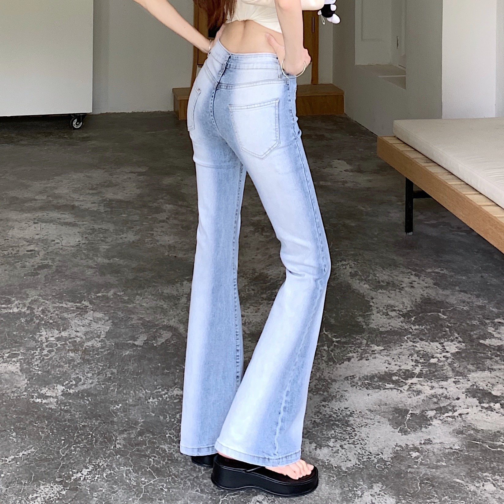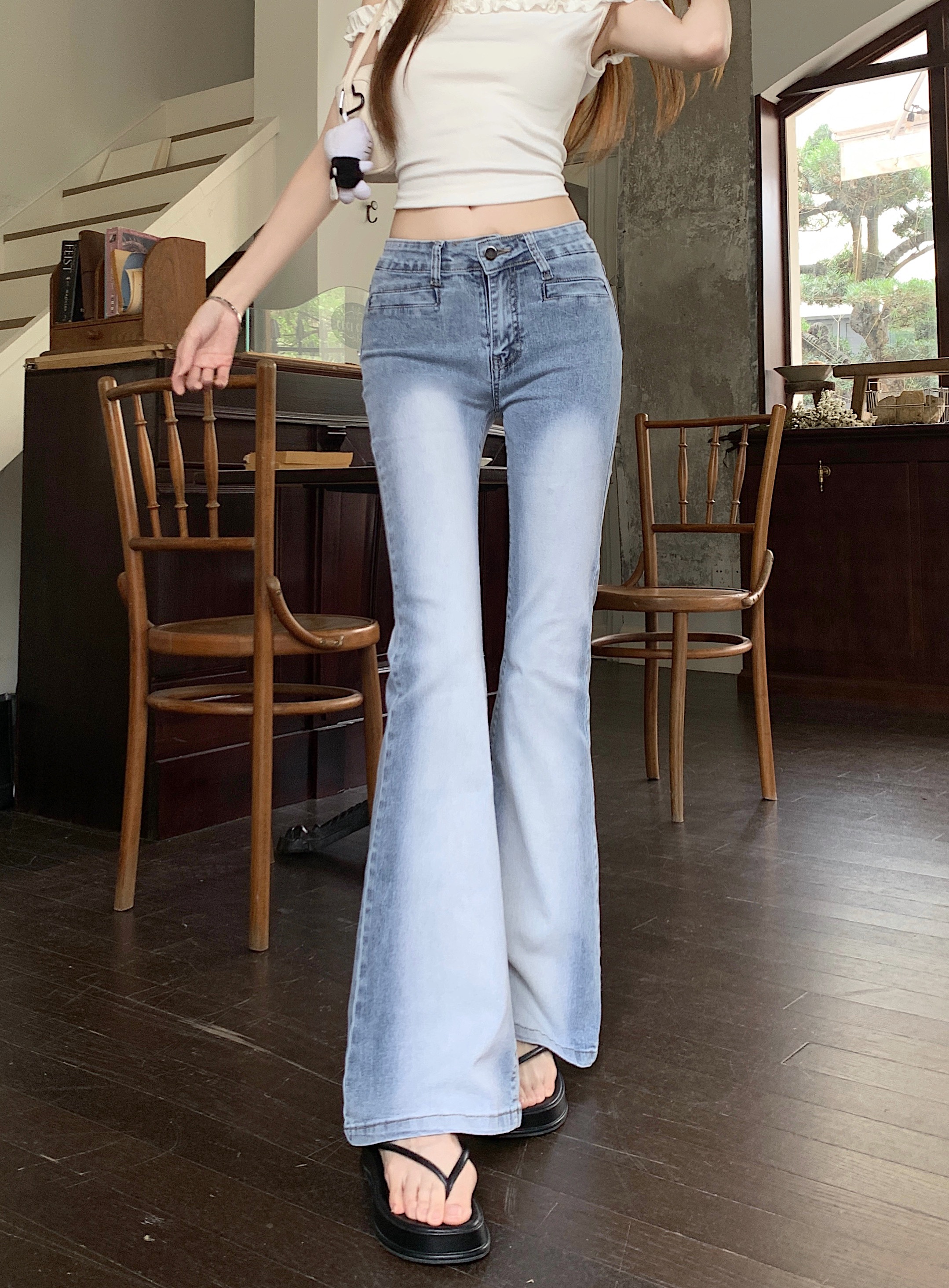 실사 아메리칸 레트로 작은 키 워싱 핫걸 로우 웨이스트 부츠컷 바지 여성 신축성 몸매 가꾸기 슬림해 보이는 나팔 긴 바지