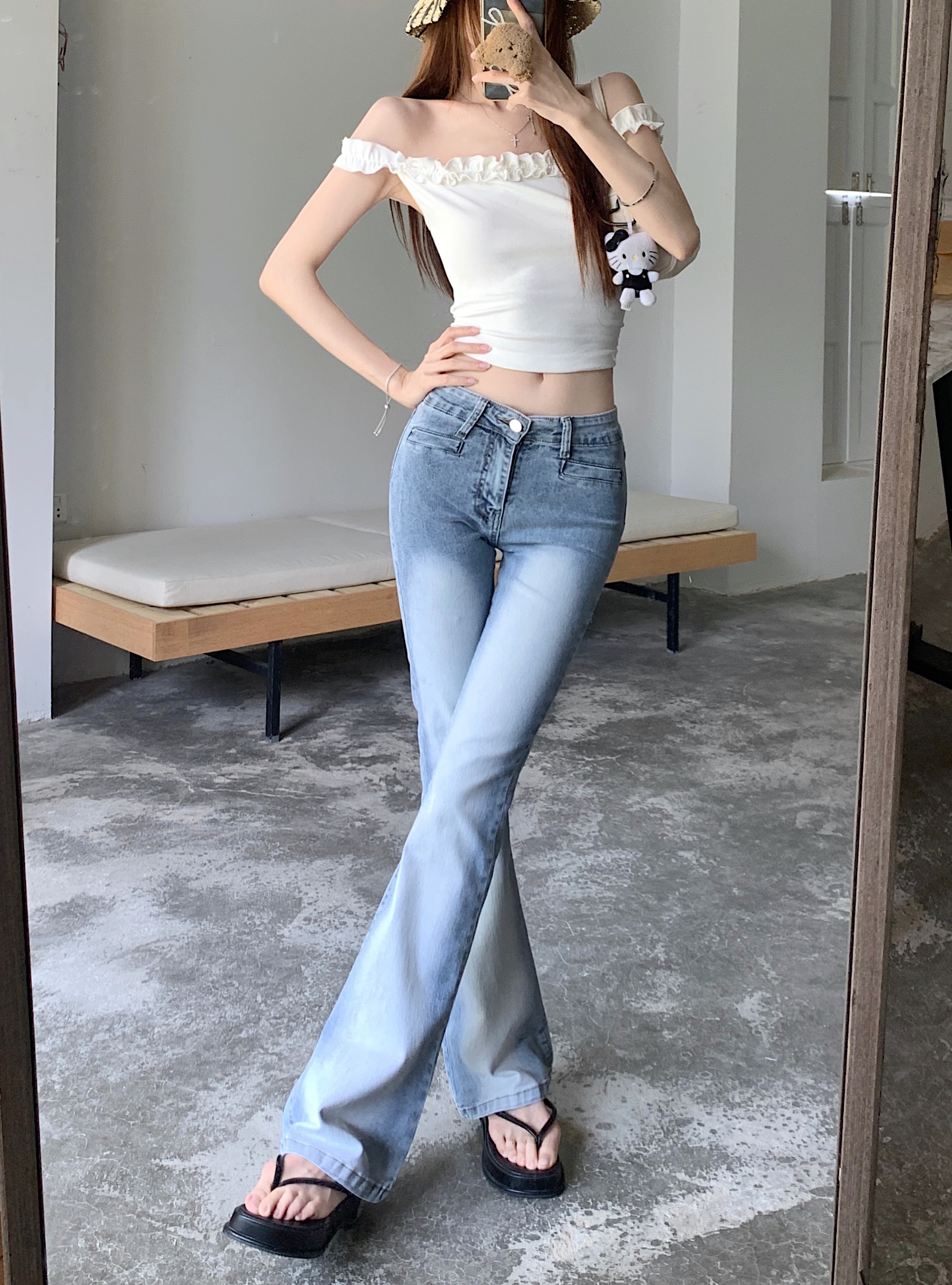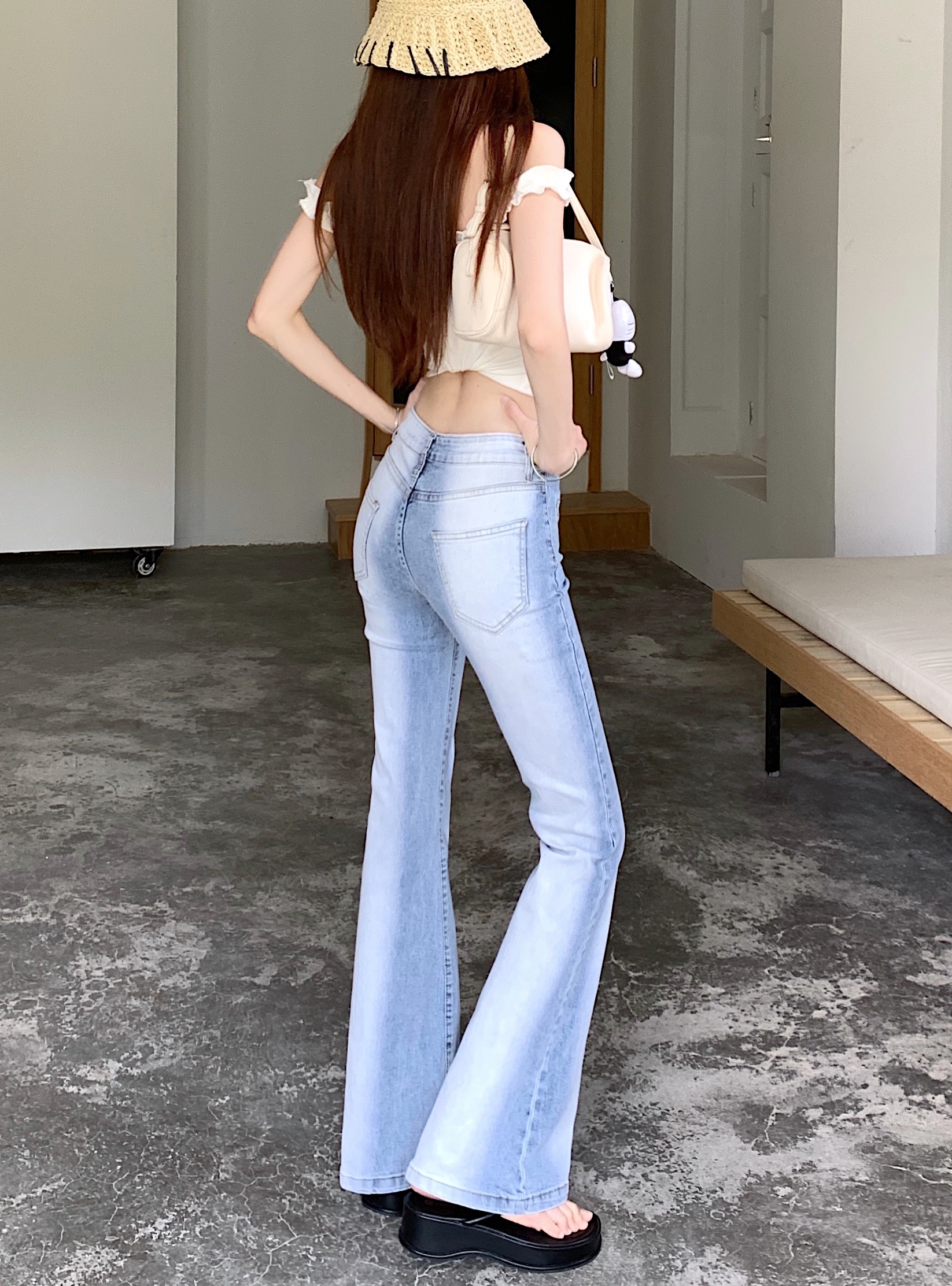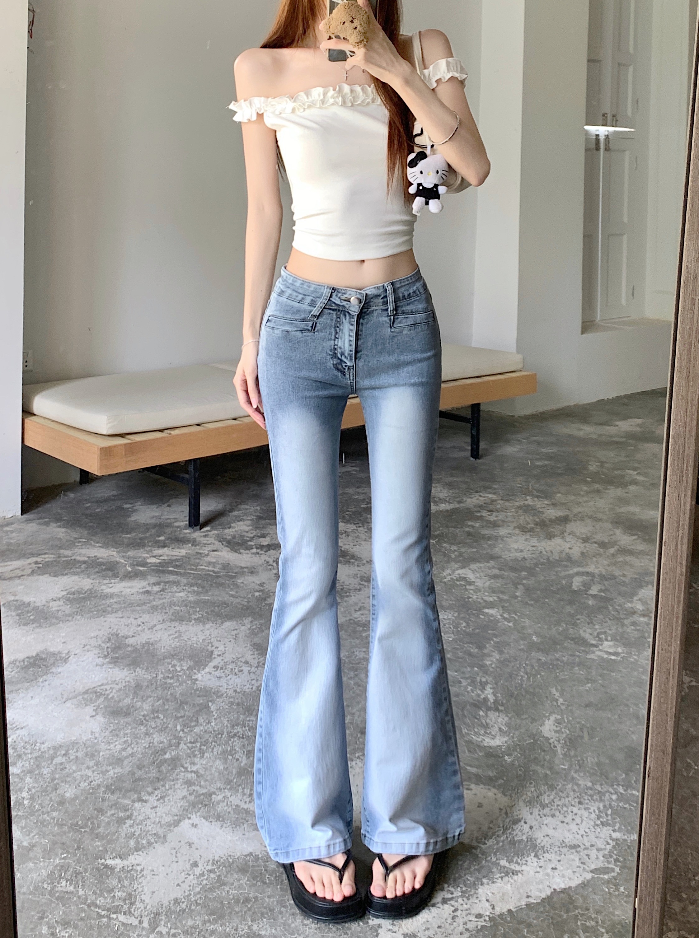 실사 아메리칸 레트로 작은 키 워싱 핫걸 로우 웨이스트 부츠컷 바지 여성 신축성 몸매 가꾸기 슬림해 보이는 나팔 긴 바지