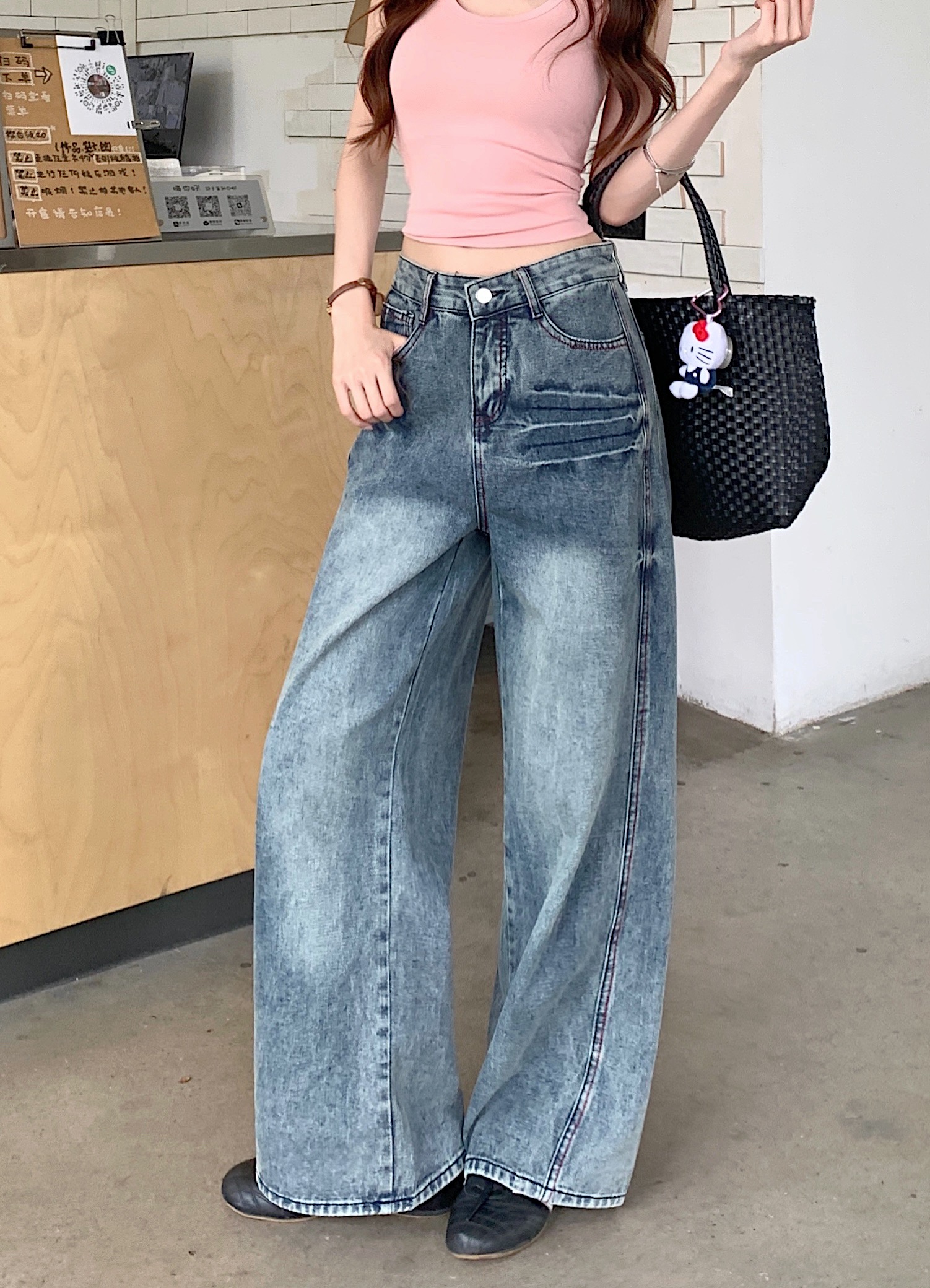 실사 아메리칸 레트로 워싱 고양이 반드시 넓은 다리 청바지 여성 봄 여름 루즈핏 슬림해 보이는 cleanfit 바닥 청소 바지