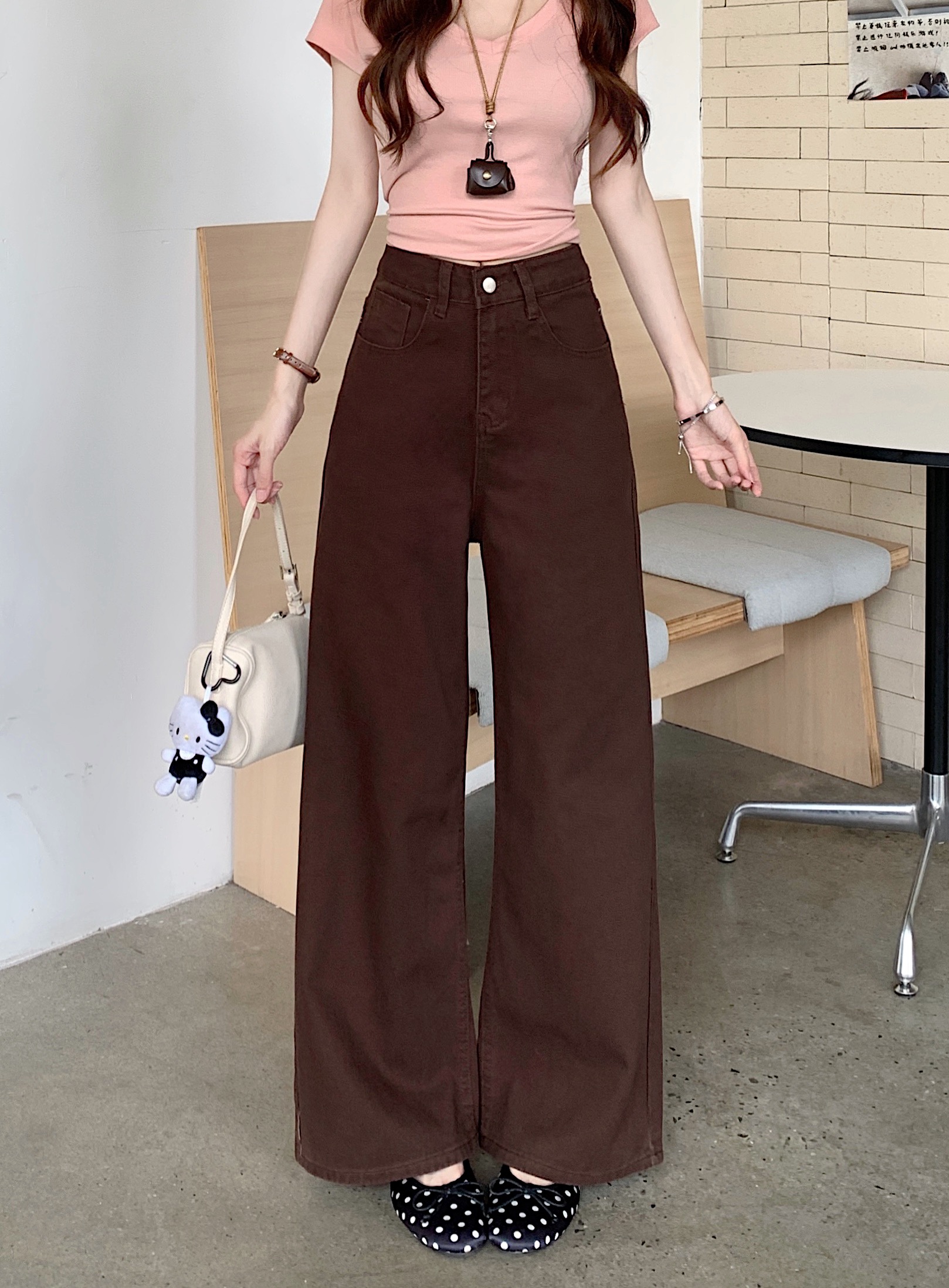 실사 브라운 커피 색상 하이웨이스트 넓은 다리 청바지 여성 봄 가을 새로운 느긋한 느슨함 센스 루즈핏 슬림해 보이는 스트레이트 팬츠