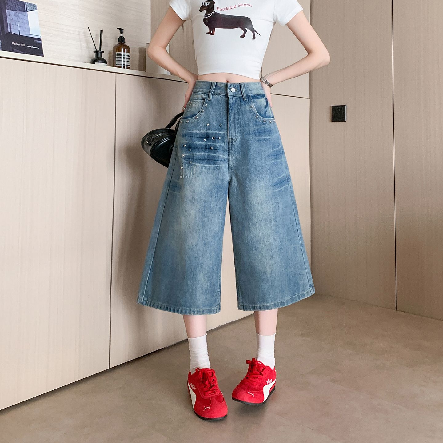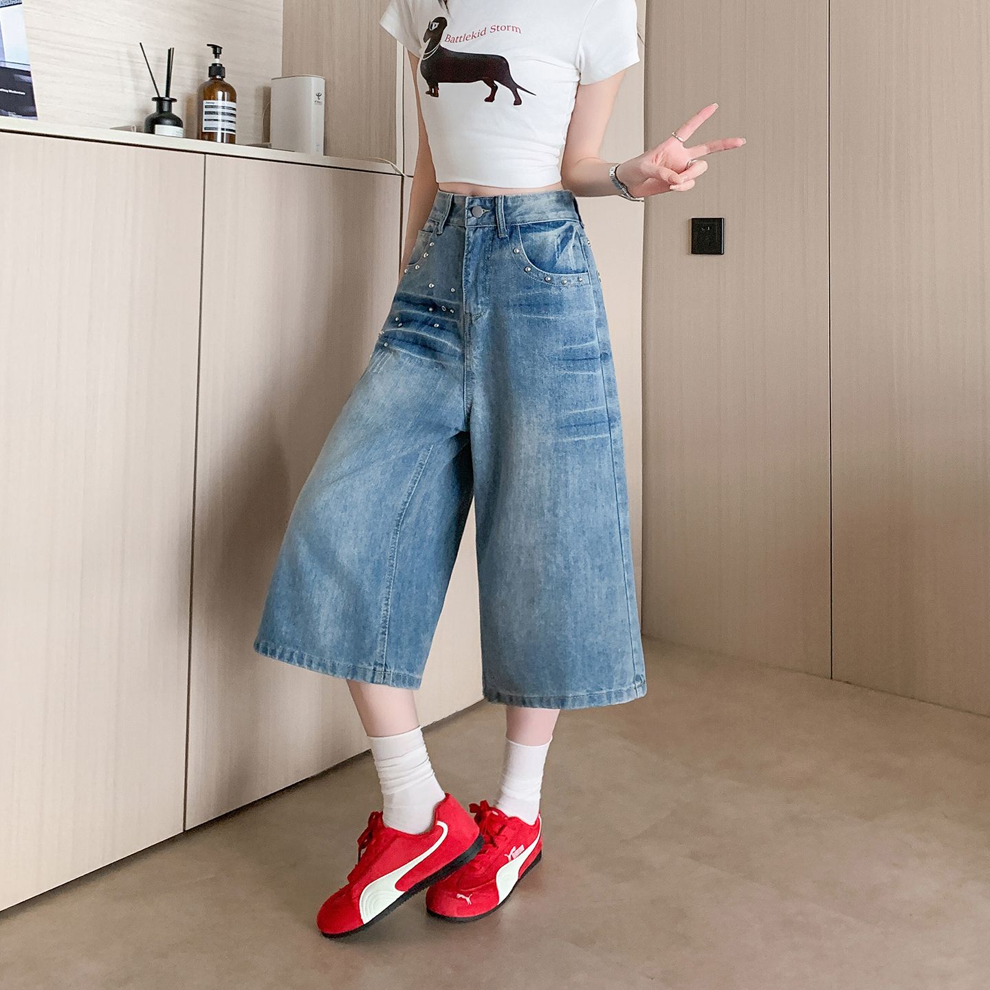 실사 정가 아메리칸 레트로 고급 센스 슈퍼 잘 생긴 데님 7부 바지 여성 여름 새로운 루즈핏 짧은 바지