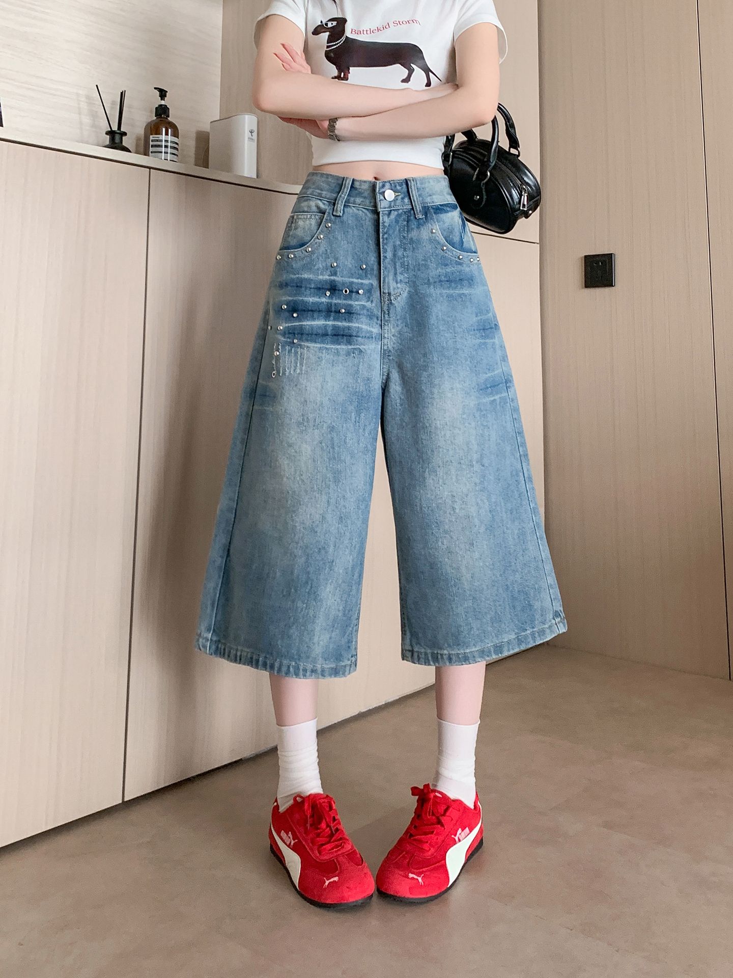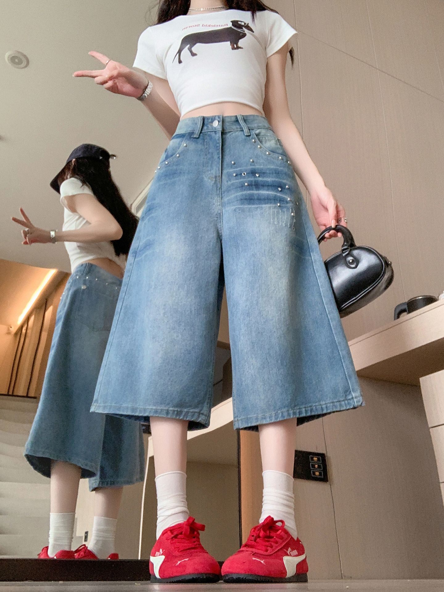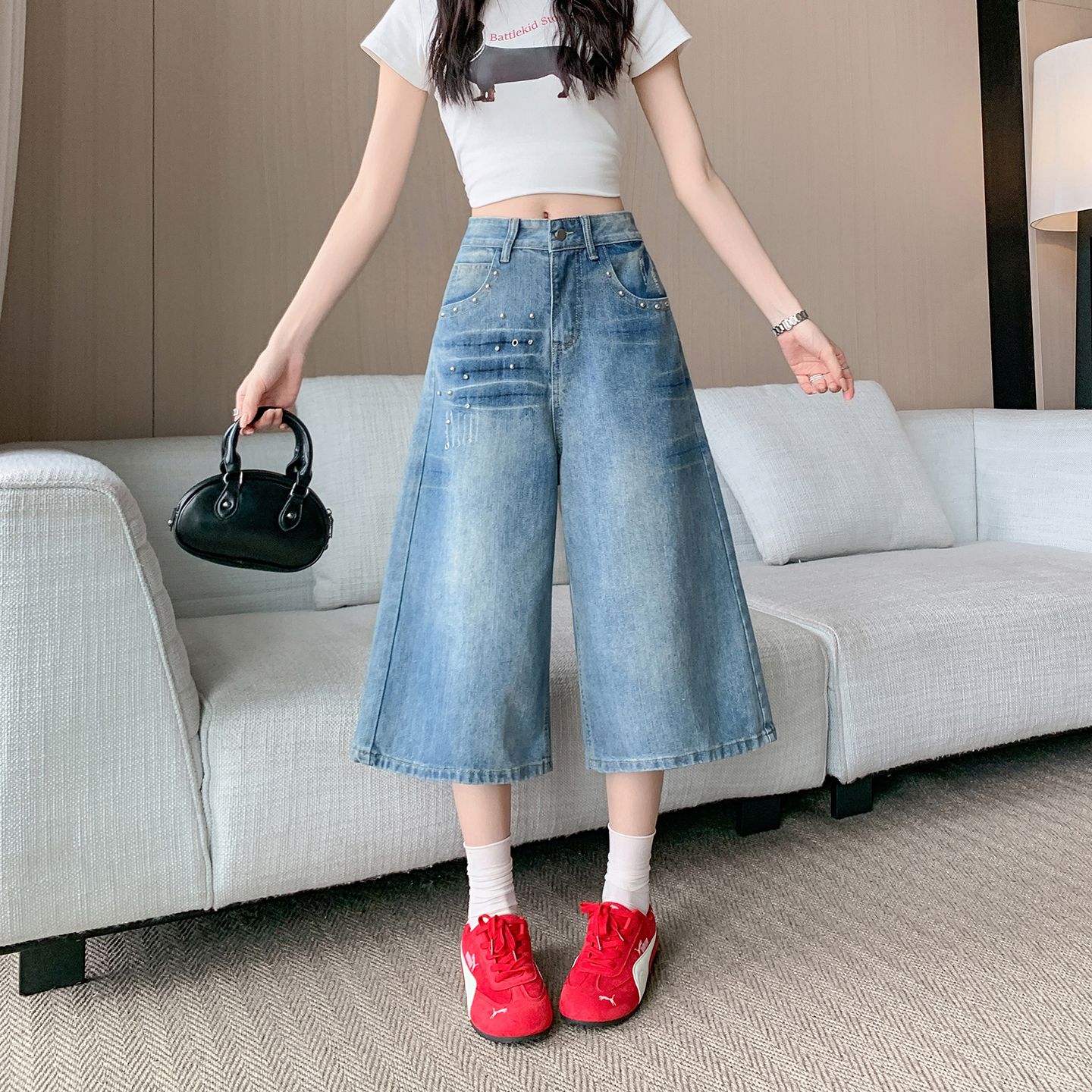 실사 정가 칙칙한 흰색 아메리칸 레트로 모통이 칼 청바지 여성 여름 새로운 하이웨이스트 루즈핏 와이드 레그 팬츠 어린이
