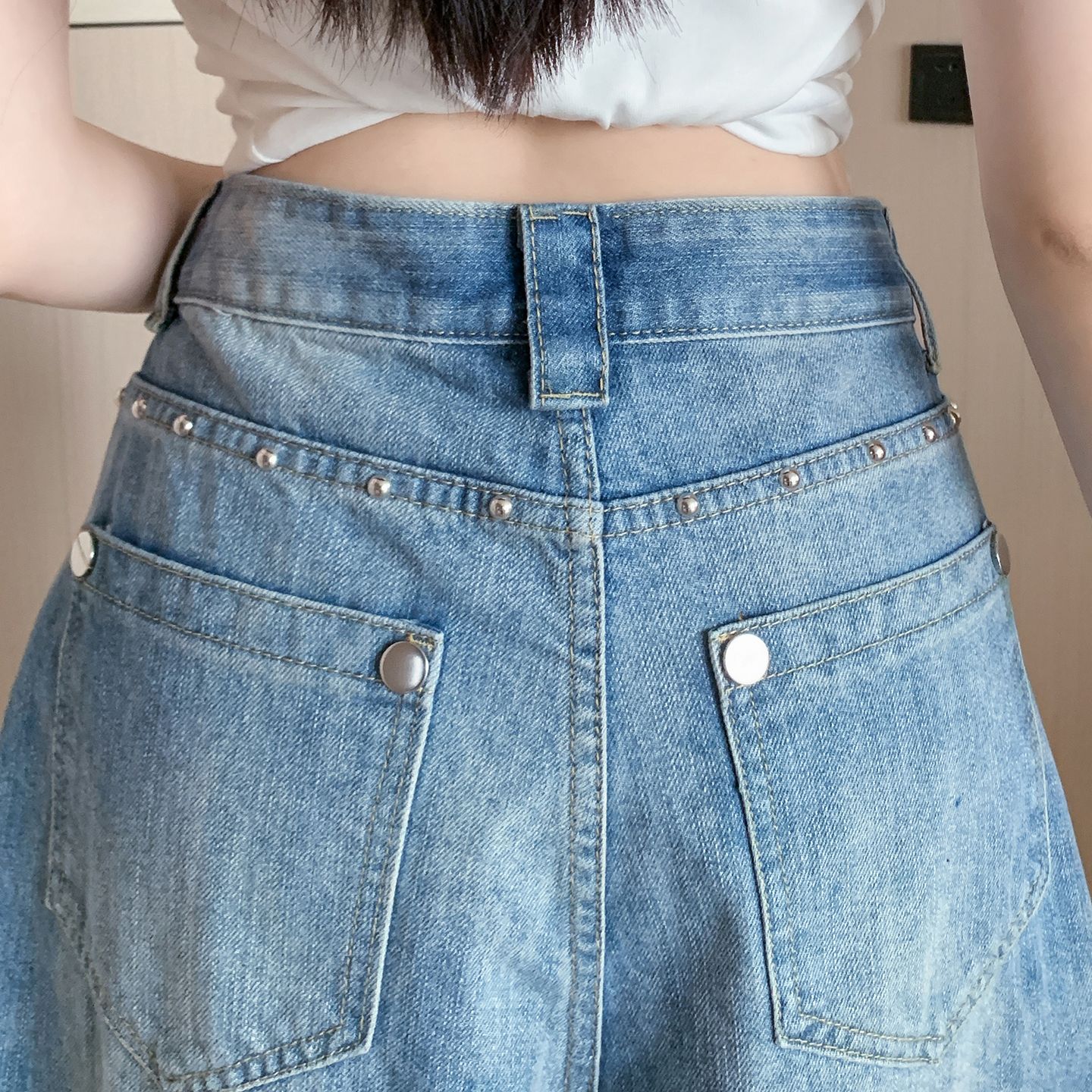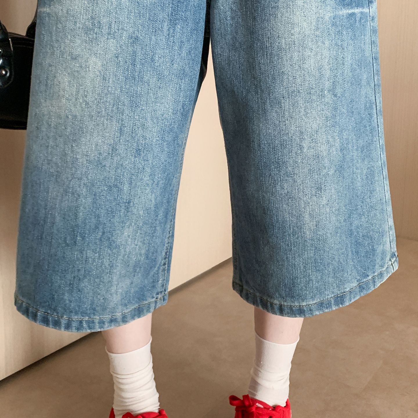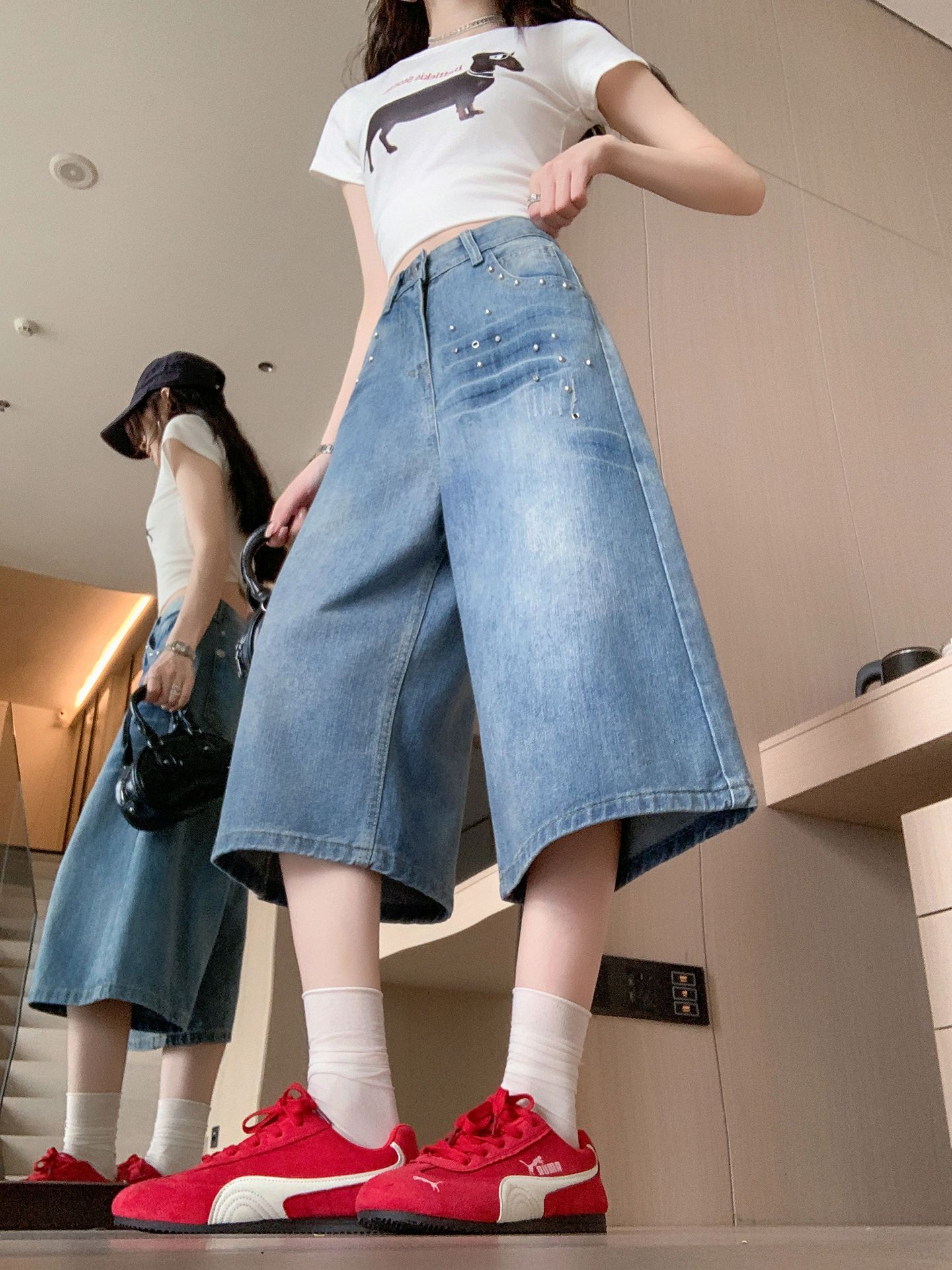 실사 정가 칙칙한 흰색 아메리칸 레트로 모통이 칼 청바지 여성 여름 새로운 하이웨이스트 루즈핏 와이드 레그 팬츠 어린이