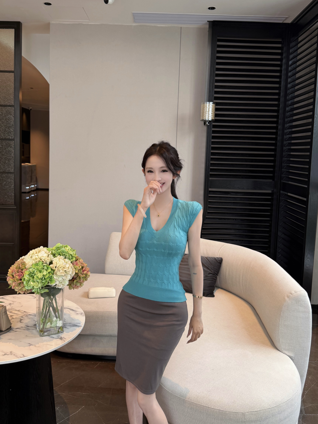 실사 정가 행침 목 터틀넥 조끼 긍정적 인 어깨 오픈 가디건 무거운 작업 계단식 홀로우 아웃 레이스 케이크 반바지