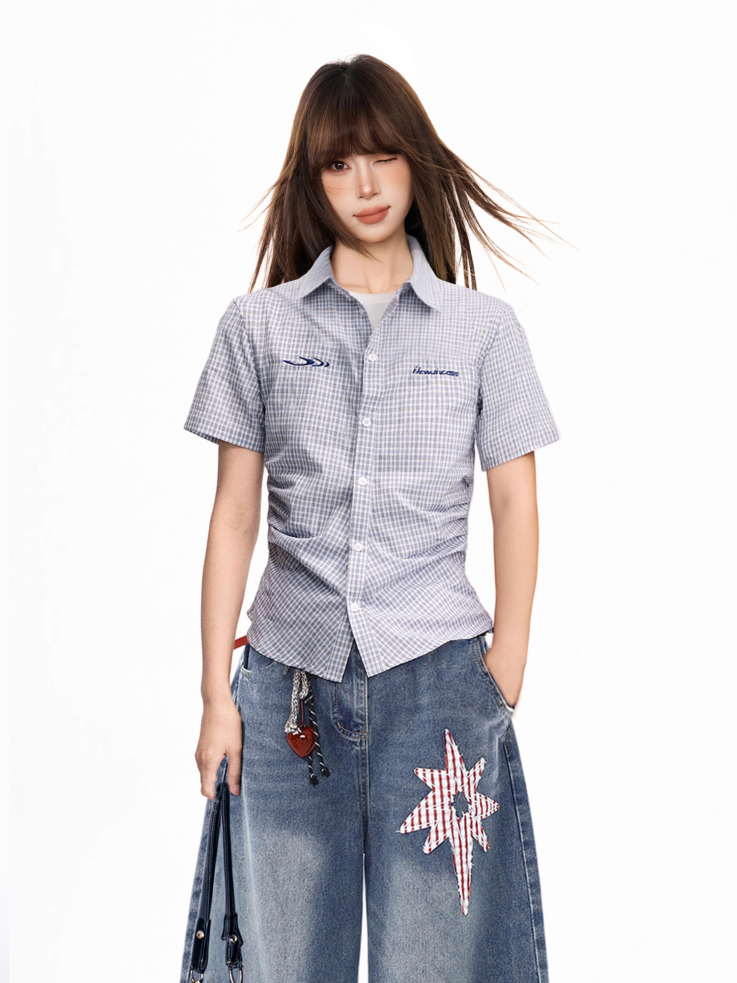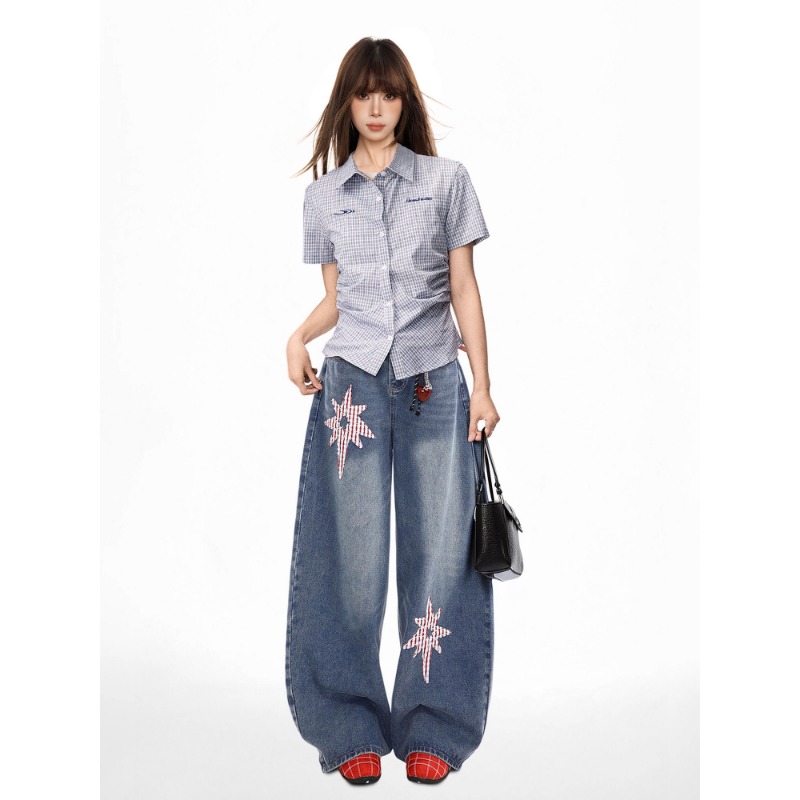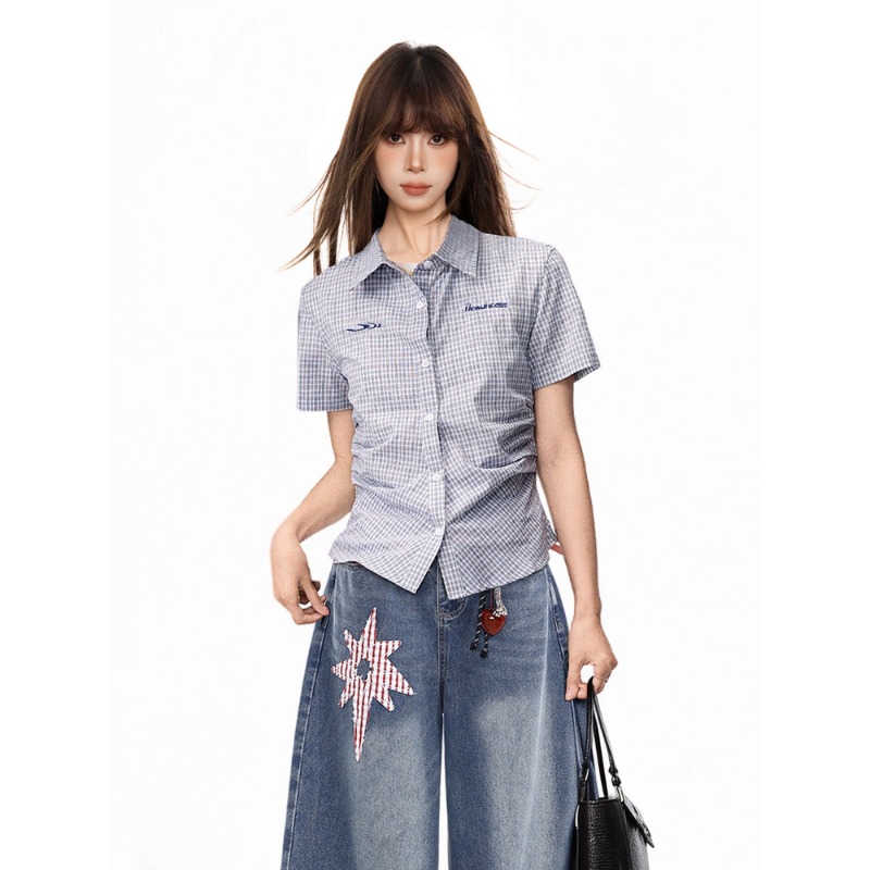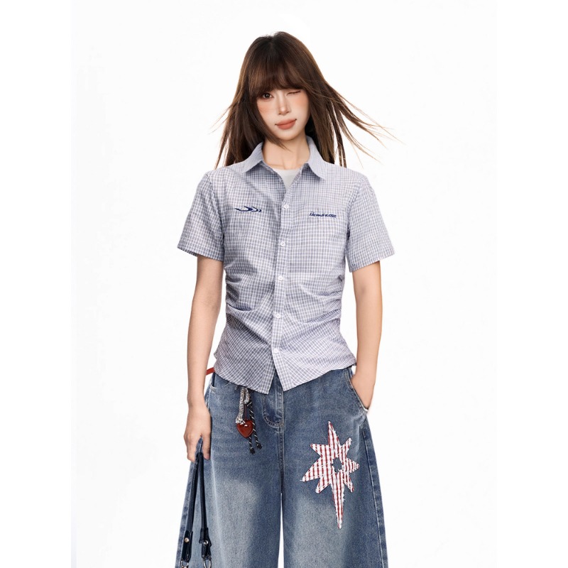 파란색 체크무늬 긍정적 인 어깨 반팔 여성 셔츠 여름 아메리칸 쇼트 스타일 몸매 가꾸기 POLO 칼라 반팔 셔츠 맨위