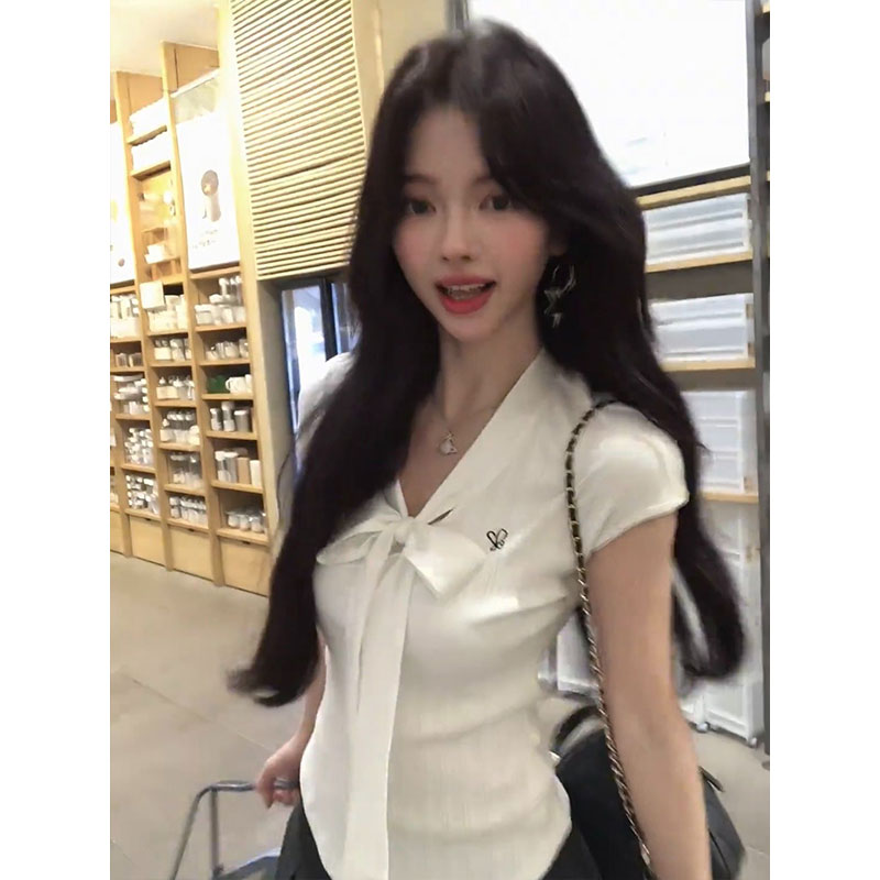 학원 스타일 품격 핫걸 레이스업 리본 반팔 티셔츠 여성 의류 여름 핫걸 몸매 가꾸기 다용도 V넥 맨위