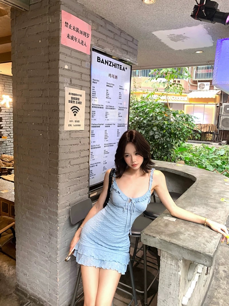 박하 드레스 부드러운 자수 홀치기 염색 프린트 행침 목 미니 스커트 슈퍼 요정 휴가 사진 찍기