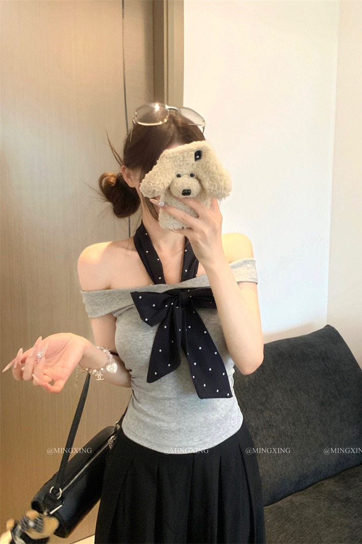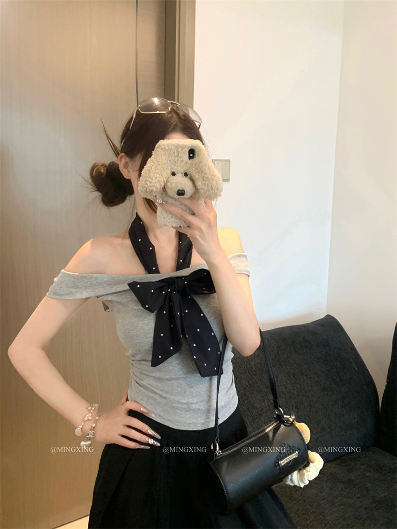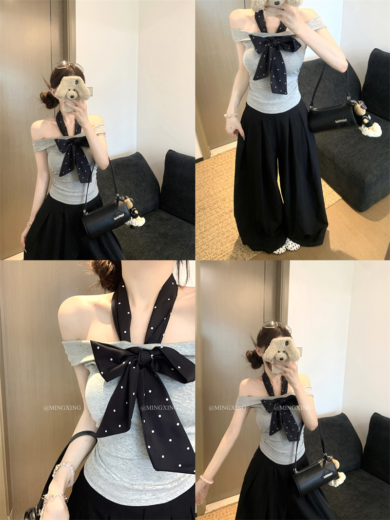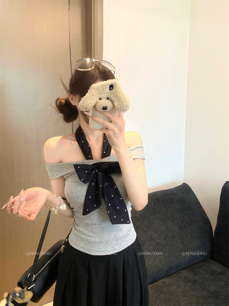 실사 정가 회색 오프숄더 반팔 티셔츠 여성 여름 슬림해 보이는 한 부서 고급 센스 품격 오프숄더 맨위