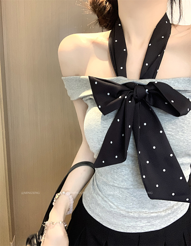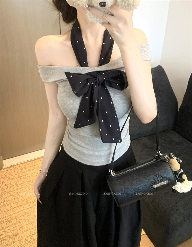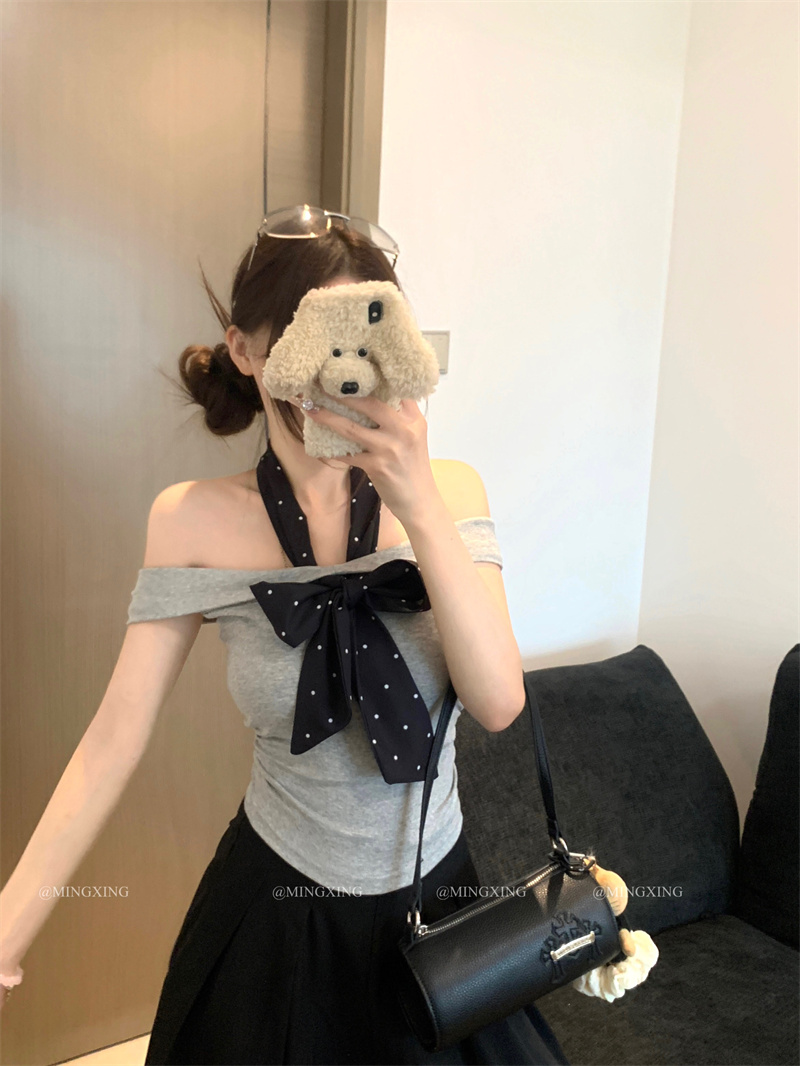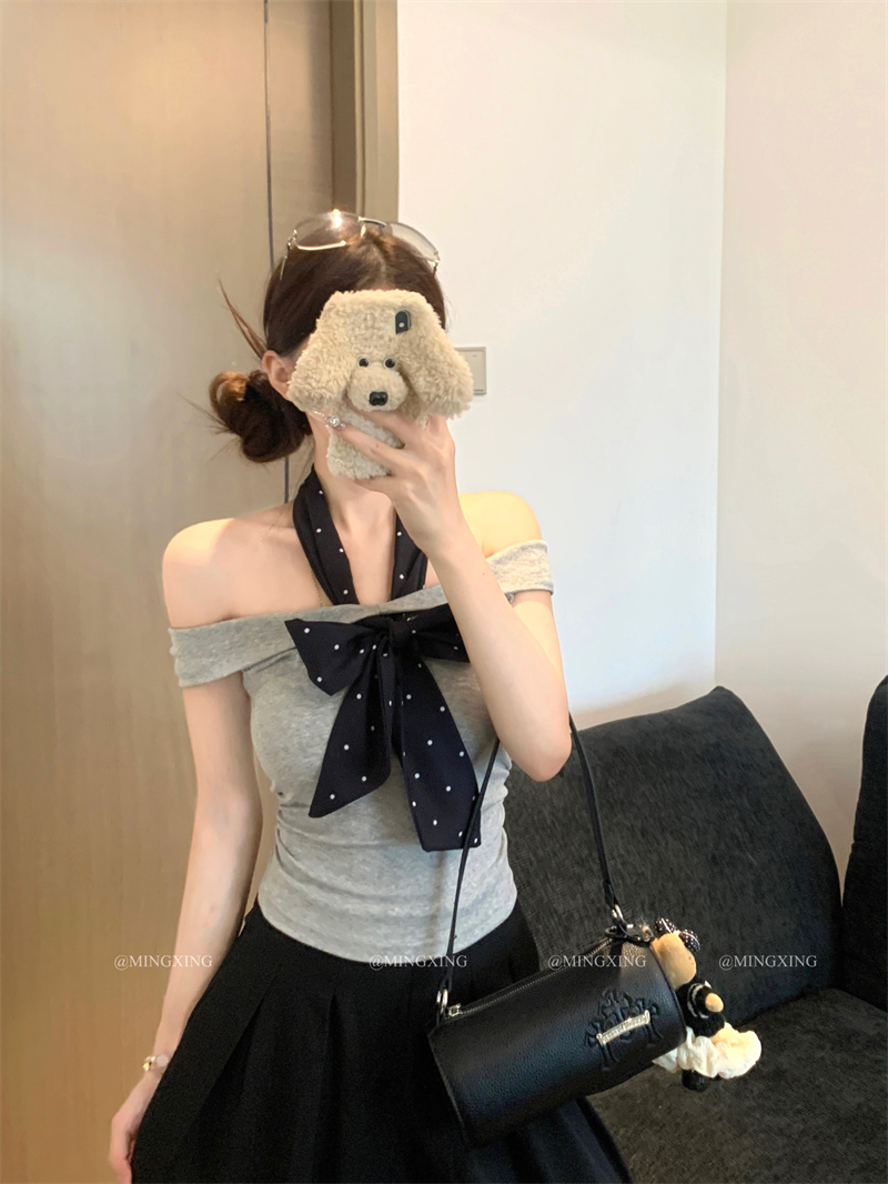 실사 정가 회색 오프숄더 반팔 티셔츠 여성 여름 슬림해 보이는 한 부서 고급 센스 품격 오프숄더 맨위