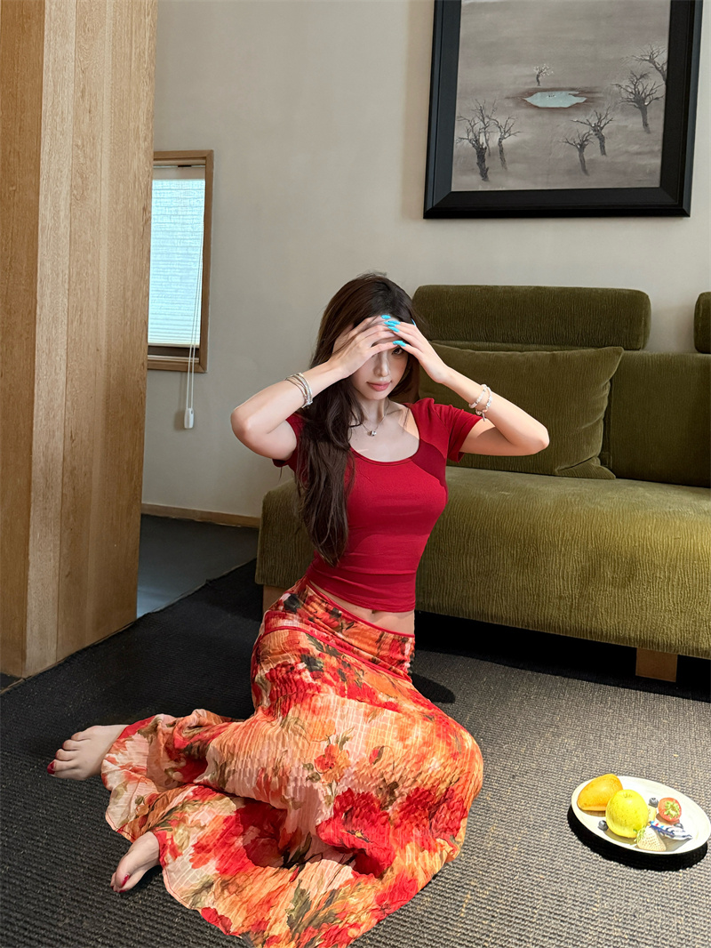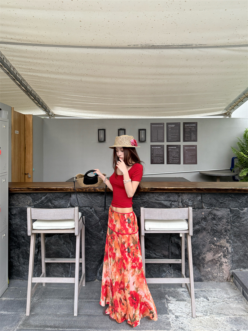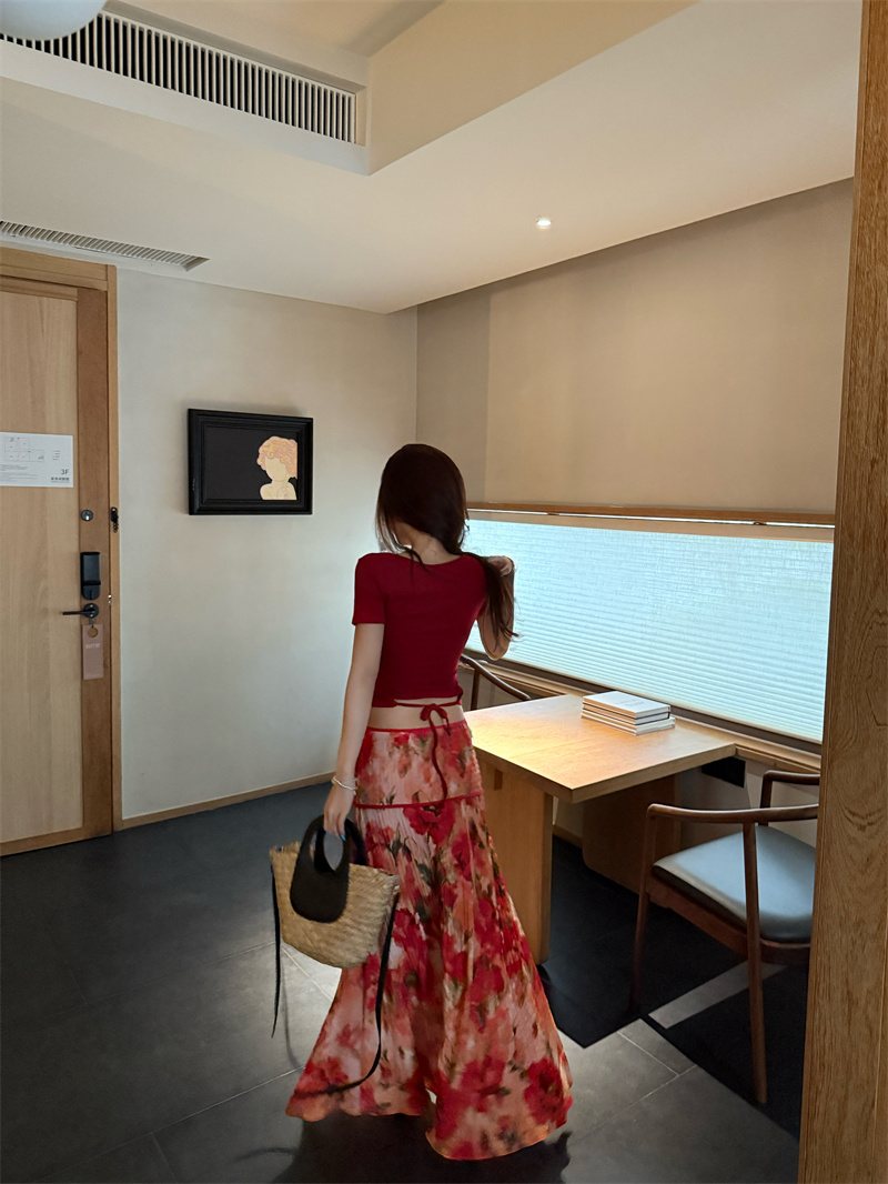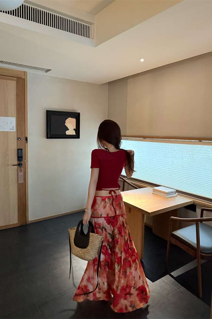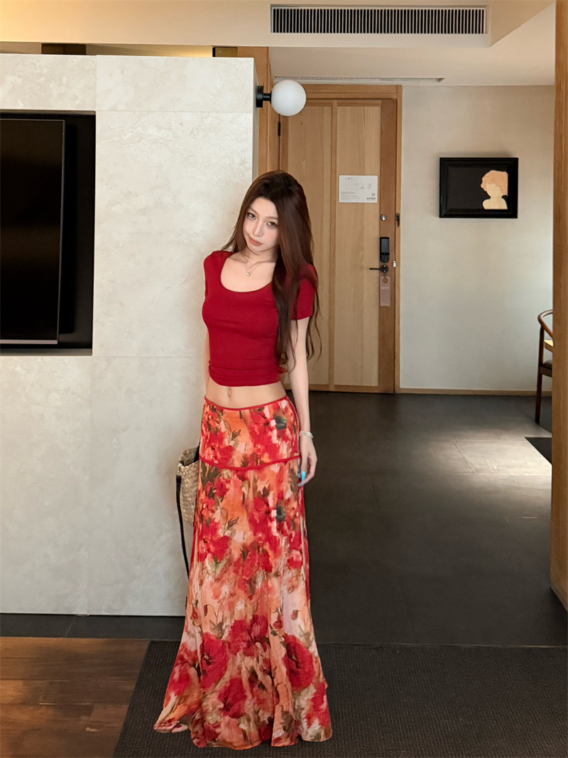 실사 정가 Mingyan 분위기 빨간색 티셔츠 맨위 유화 대 꽃 반신 치마 세트