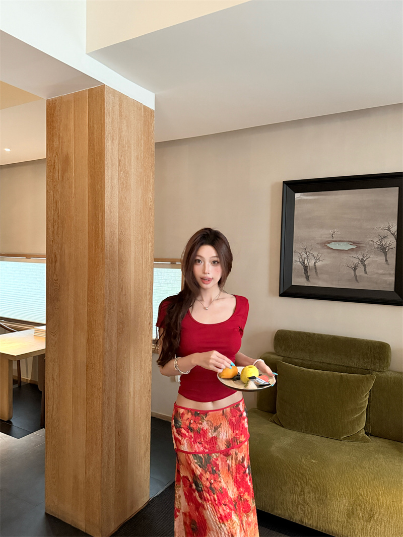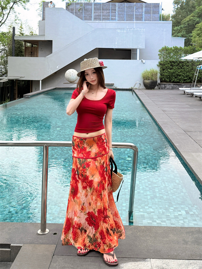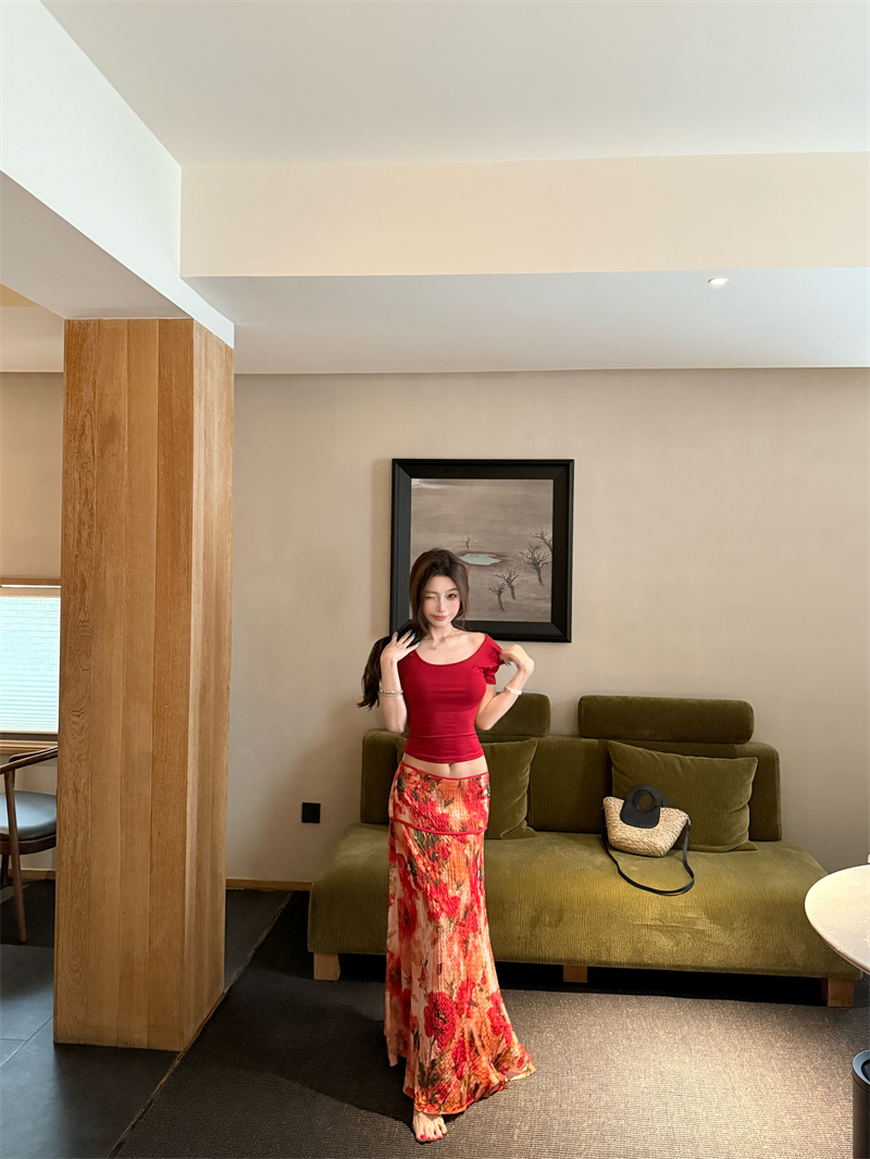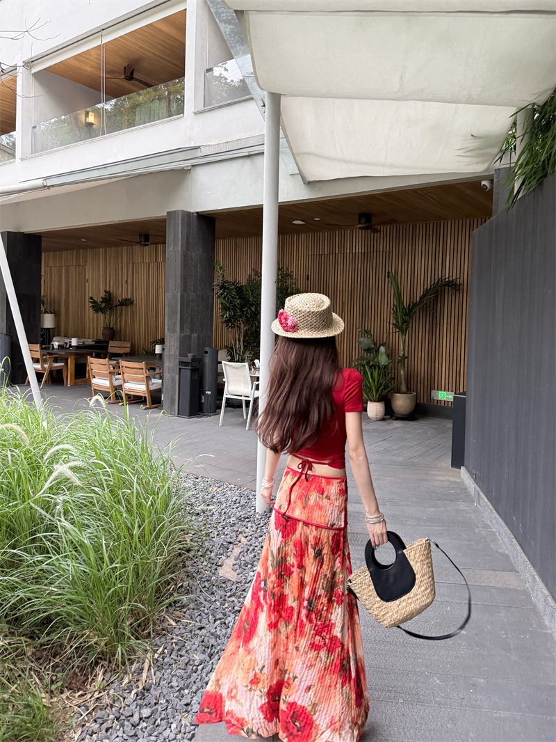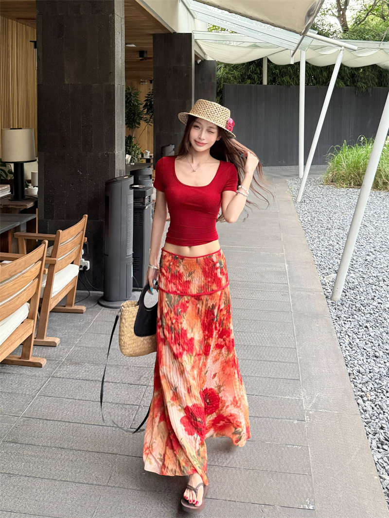 실사 정가 Mingyan 분위기 빨간색 티셔츠 맨위 유화 대 꽃 반신 치마 세트